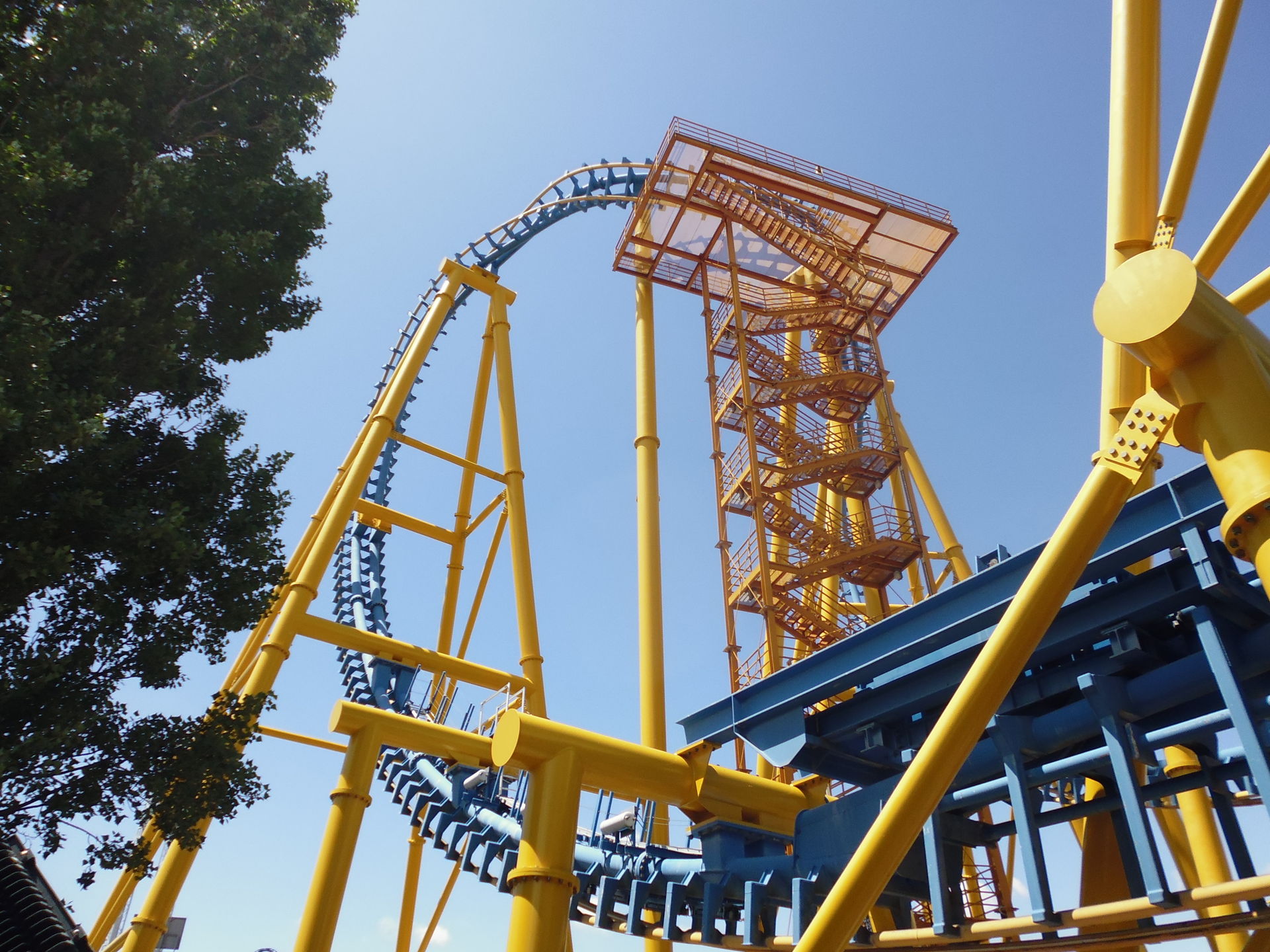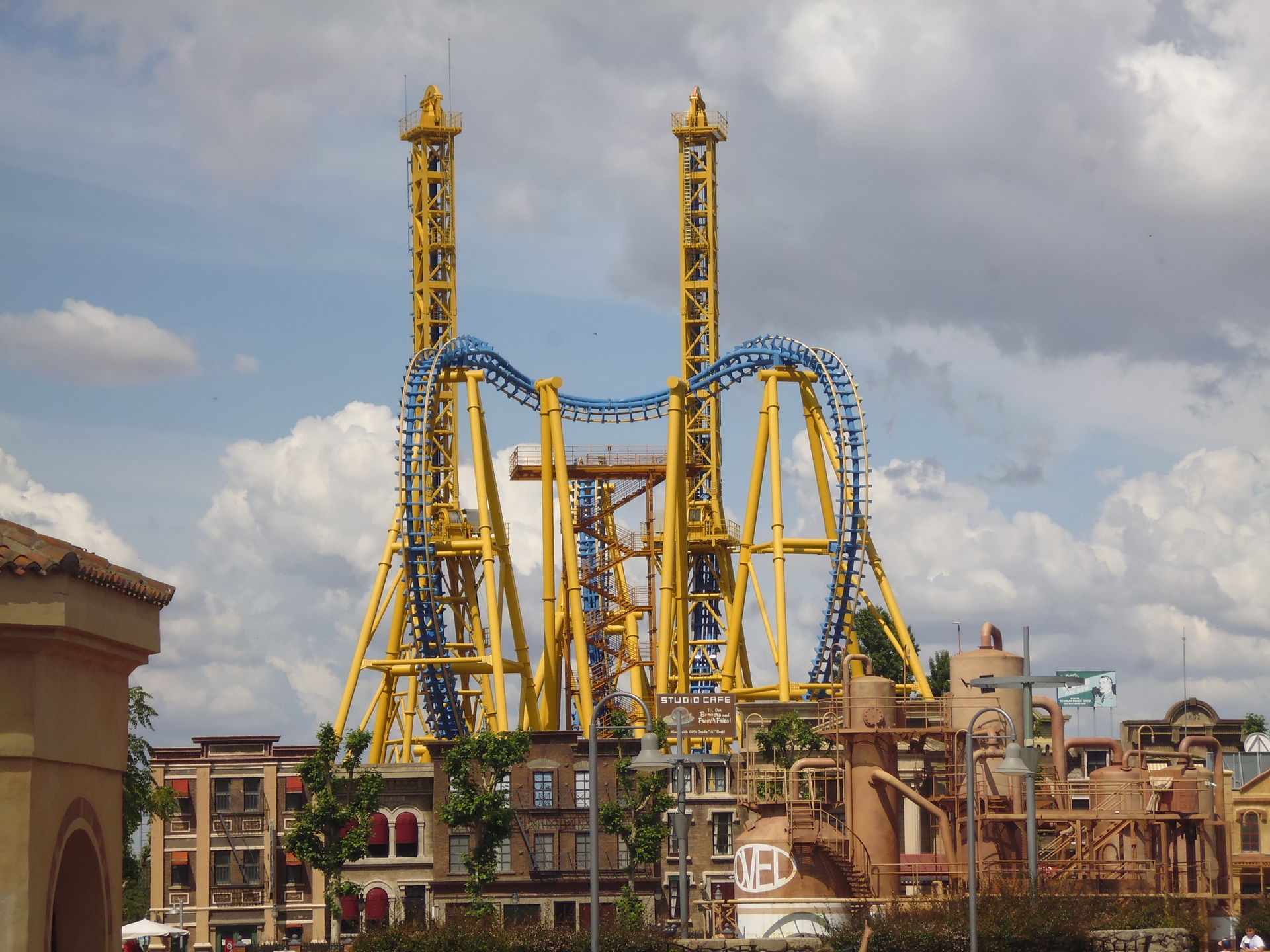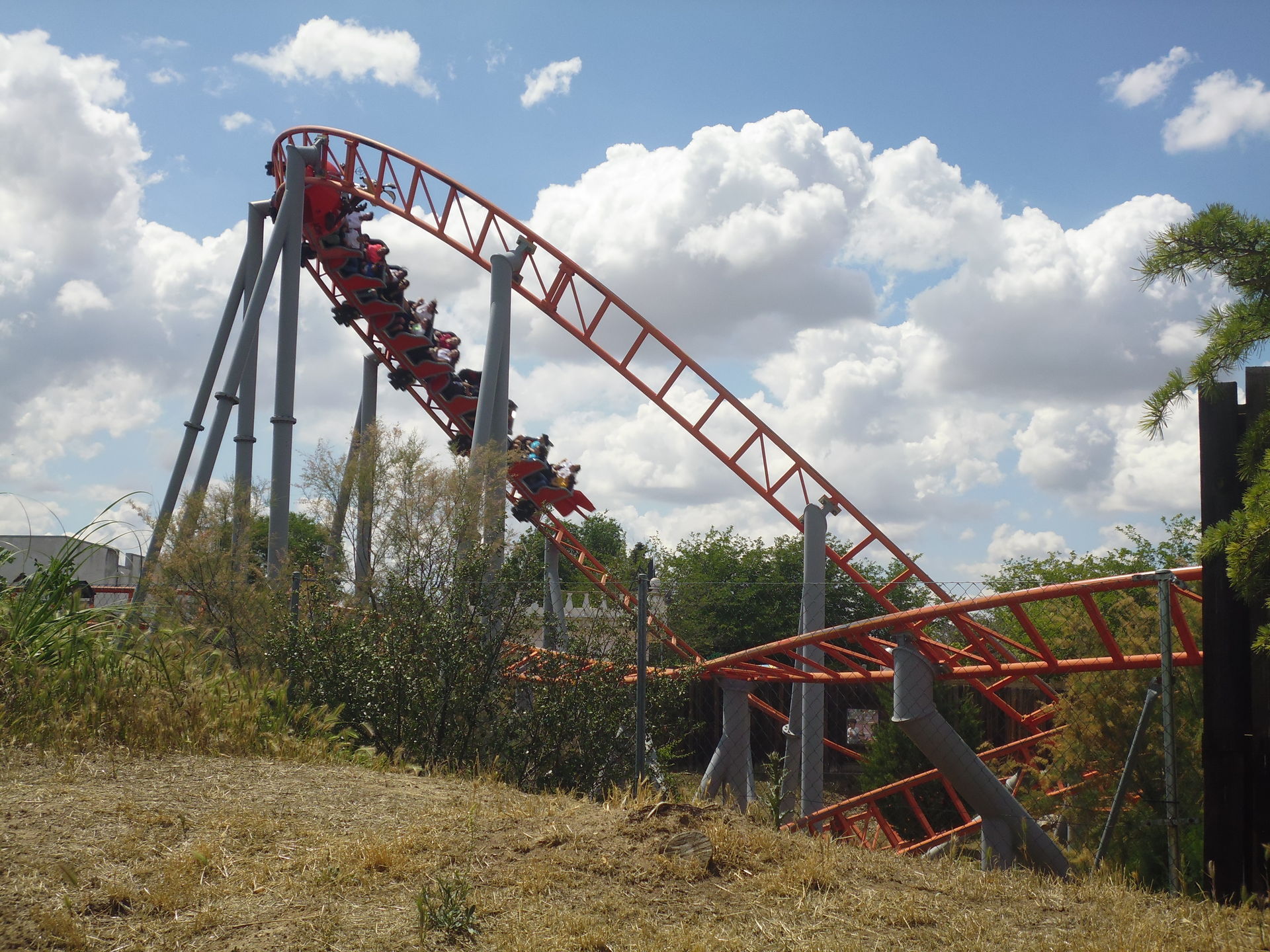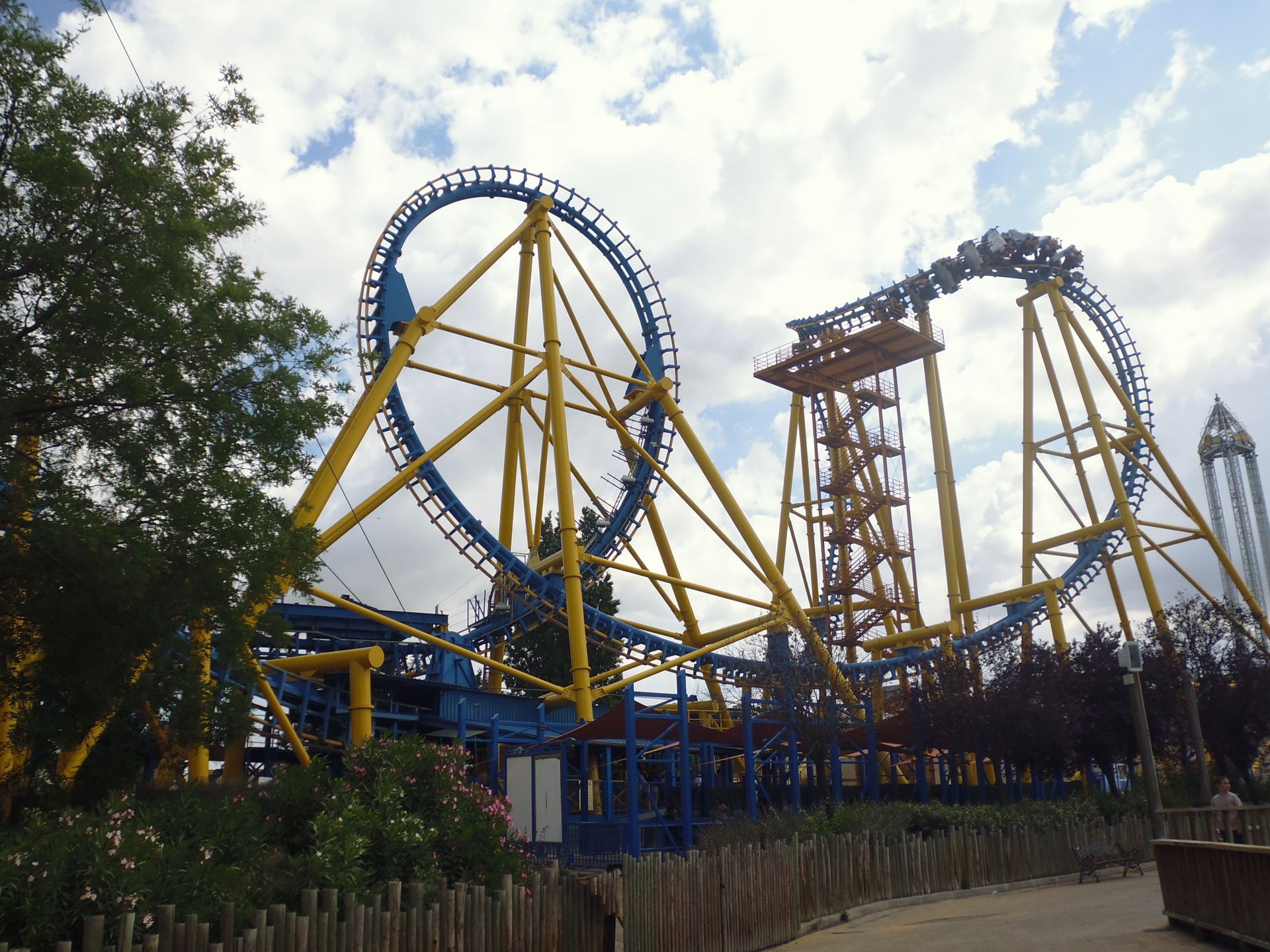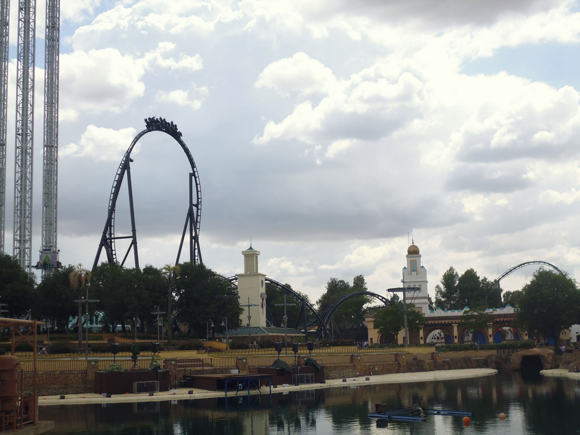 Cobra Roll von einem Rutschenturm des zwischenzeitlich da gebauten Wasserparks Warner Beach versperrt, dessen Saison jedoch erst Ende Juni beginnt.