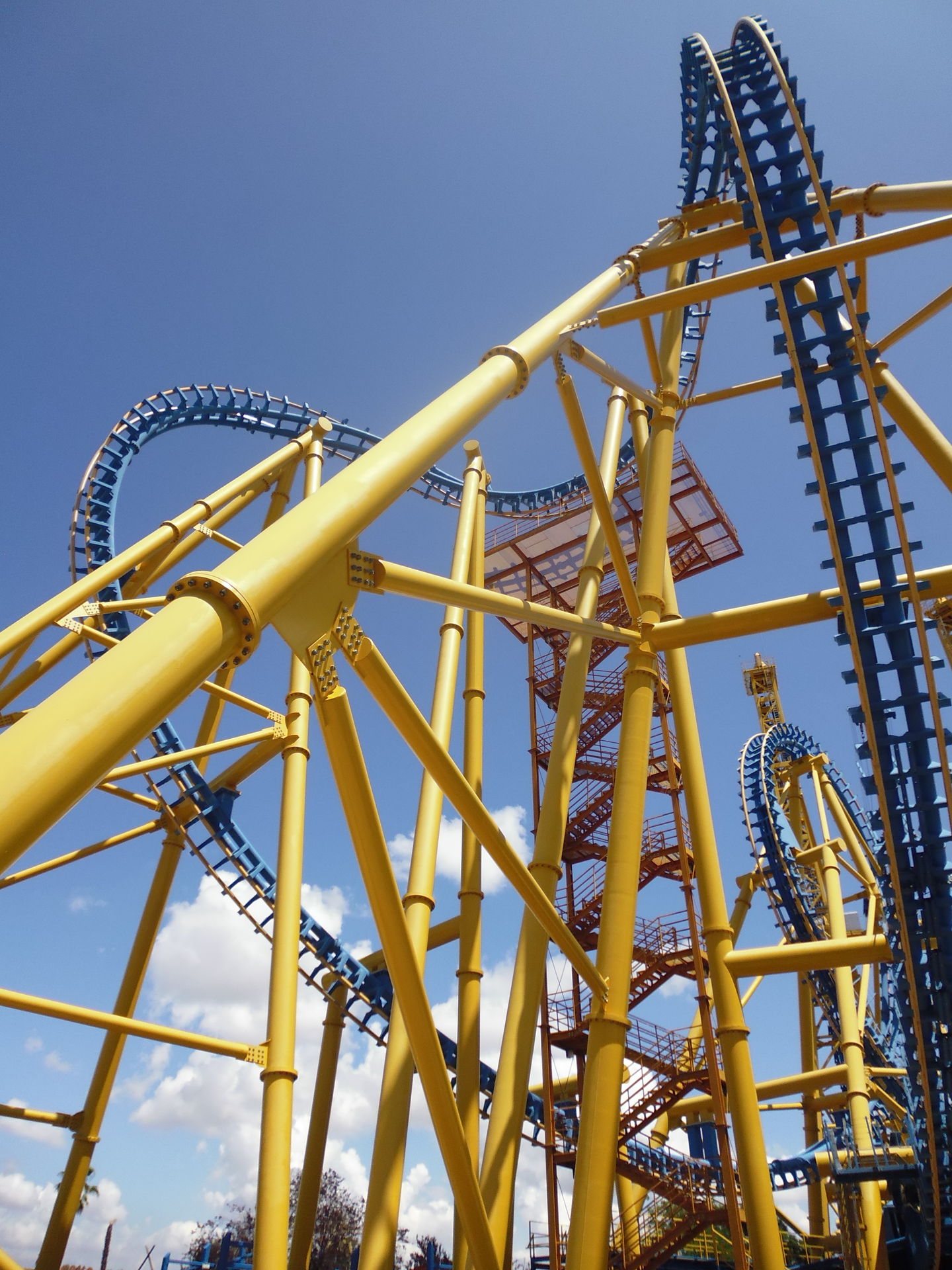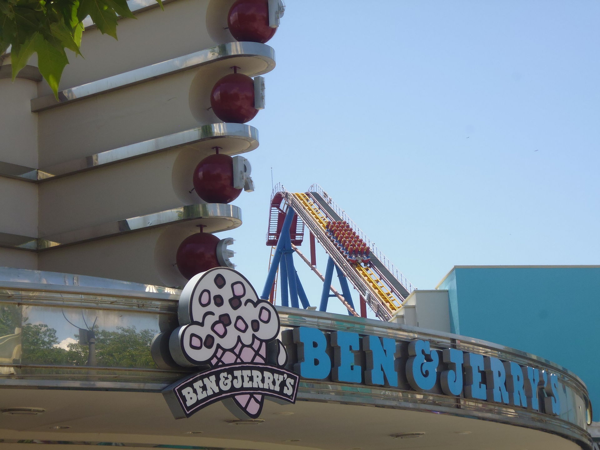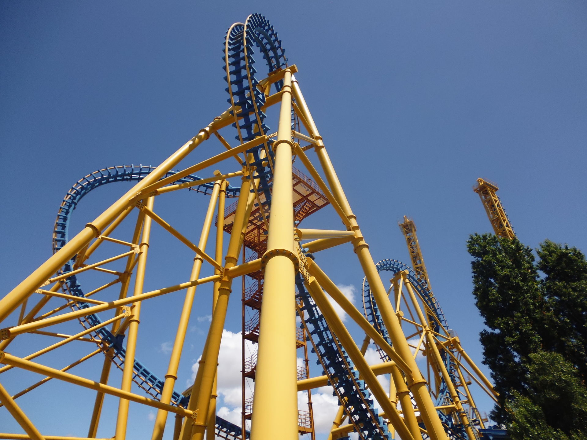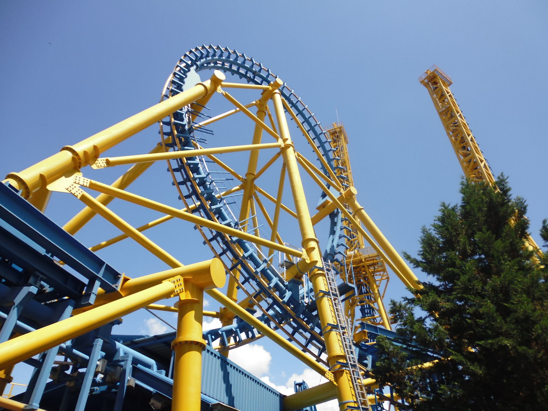 Cobra Roll von einem Rutschenturm des zwischenzeitlich da gebauten Wasserparks Warner Beach versperrt, dessen Saison jedoch erst Ende Juni beginnt.