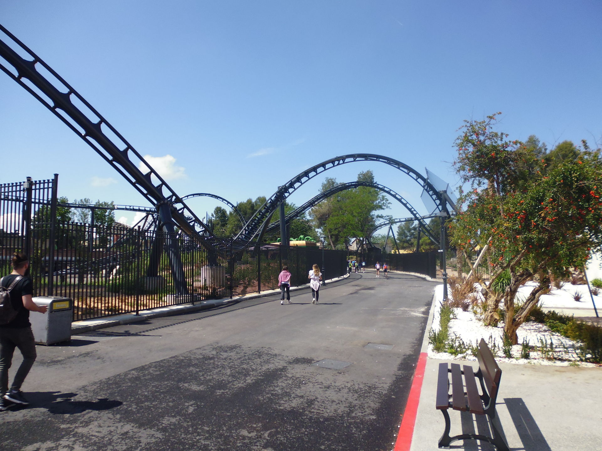 Ich hab mich innerlich ja schon auf eine gewisse Wartezeit eingestellt, aber das was man hier ertragen musste war dann doch einfach bloss zum Kotzen. Trotz einer Art Pergoladach über einem kurzen Abschnitt der Queue stand man sich da mehrheitlich völlig sonnenexponiert eine gefühlte Ewigkeit lang an der gleichen Stelle nur so die Beine in den Bauch. Das war schlicht unerträglich. Natürlich hatte das Teenie-Grüppchen vor mir dann nichts besseres zu tun als zu rauchen. Typisch Spanien halt. Ein absoluter Alptraum. Leider ist die Neuheit mit ihren offenbar nur zwei Zügen à zwölf Passagieren selbstredend schon von Natur aus eine Kapazitätsgurke par excellence. Aber was die Warterei eben zumindest bei meinem Erscheinen noch doppelt mühsam gemacht hat: viel schattenreichere Bereiche der Aussenwartezone und eigentlich sämtliche Korridore nach der Preshow im Gebäude selber blieben ungenutzt. Ich will mir das gar nicht vorstellen, wie man hier im