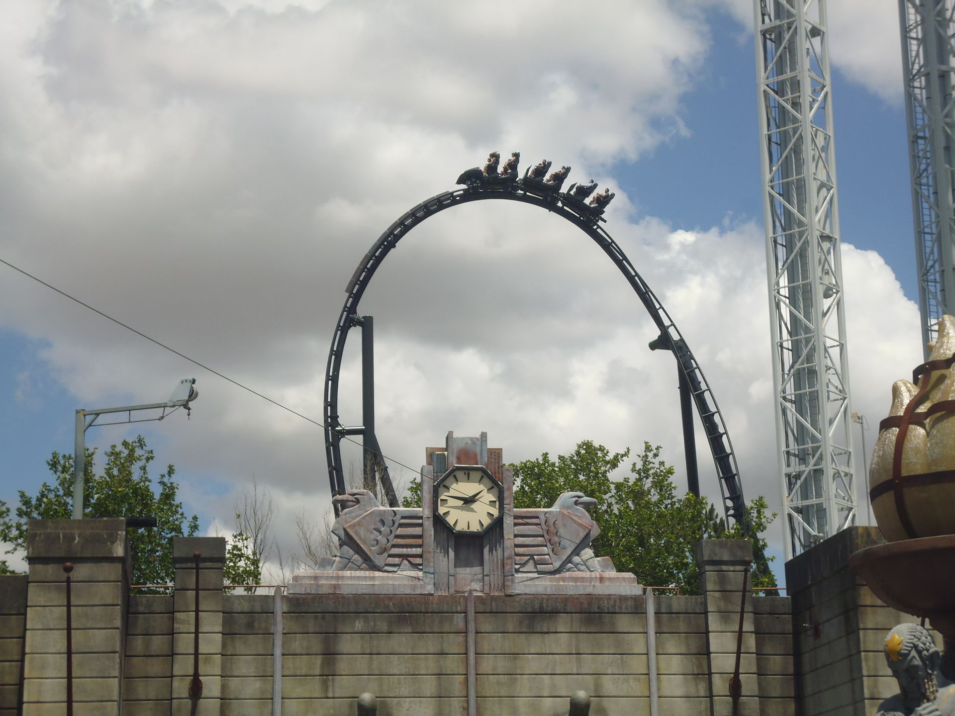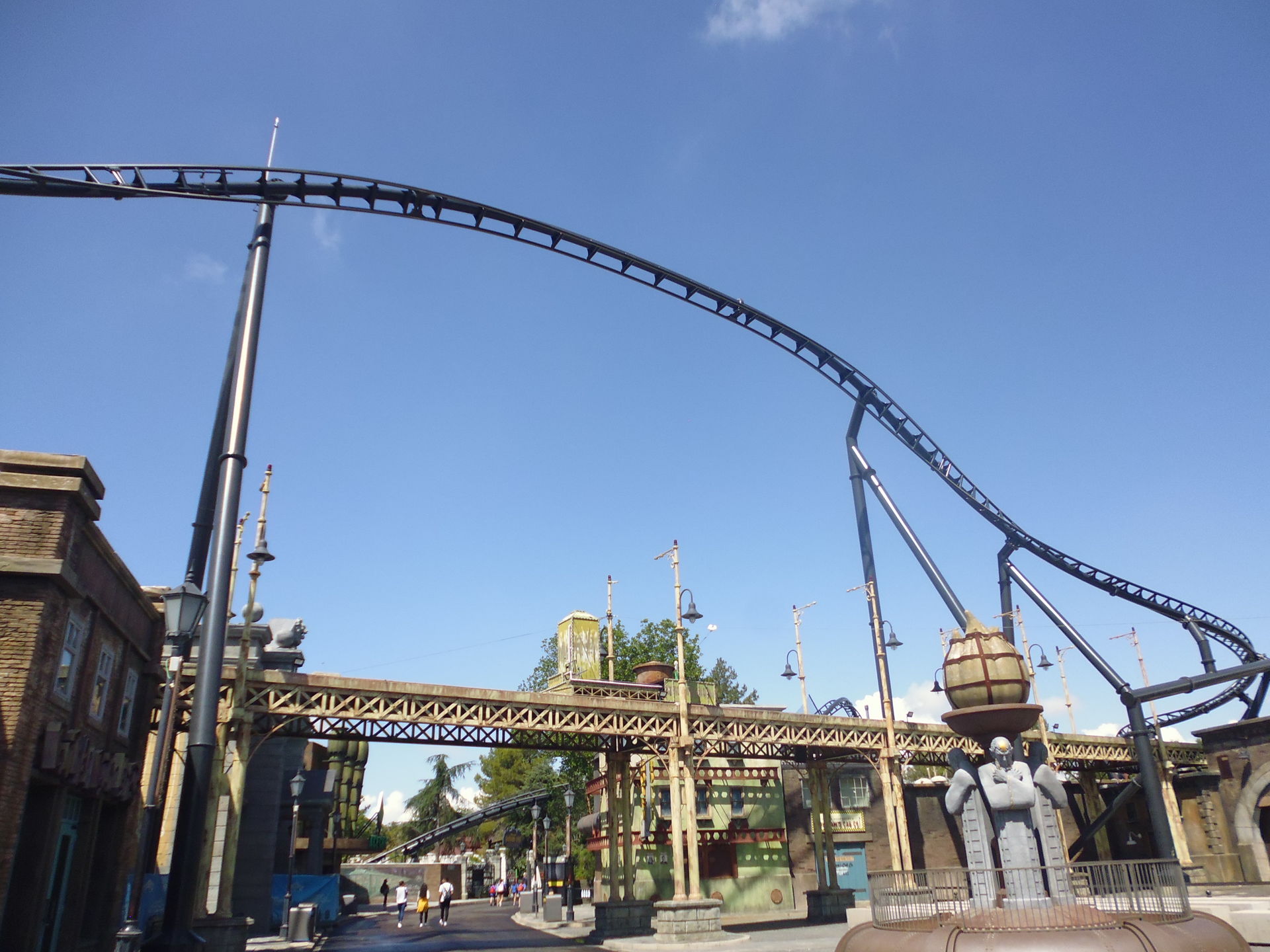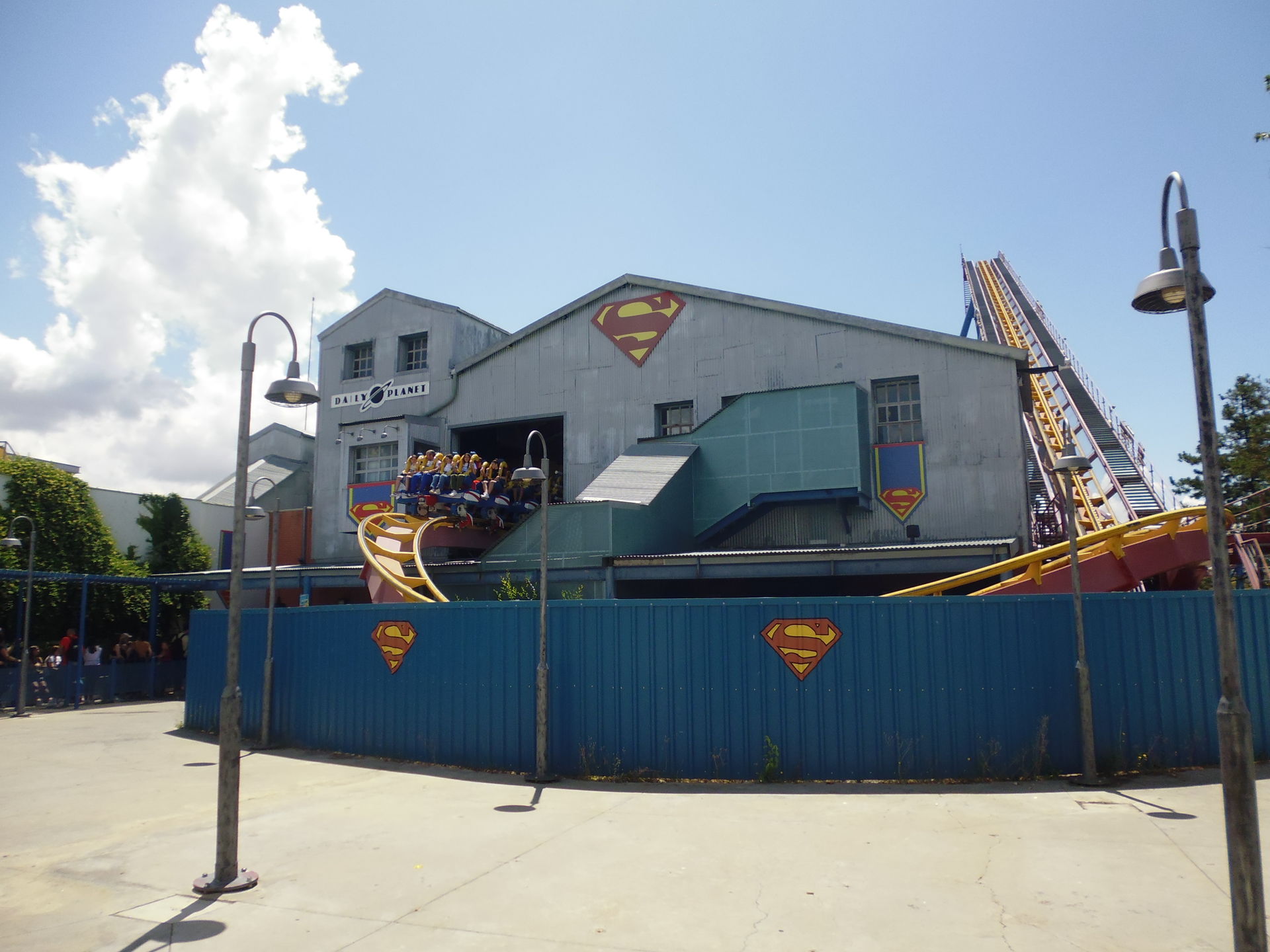 Die nächste halbe Stunde habe ich eigentlich nur mit Fotografieren, Umherwandern und Wieder-Umkehren nach entsetztem Blick auf vorherrschende Schlangen und Abfertigungstakte verbracht. Der Park war schlicht unangenehm voll. Wartezeitanzeigen gab es zwar, aber die waren bis auf eine Ausnahme alle einfach abgeschaltet, so dass man eben selber einschätzen musste, ob man sich das jetzt antun will oder nicht. Bei Superman stand man z.B. bis in die Zickzacks nach den Daily-Planet-Büros, und obschon beide Züge im Einsatz waren, verliess nur etwa alle fünf Minuten einer die Station... Beim Batman-Klon (muss man inzwischen ja so betonen