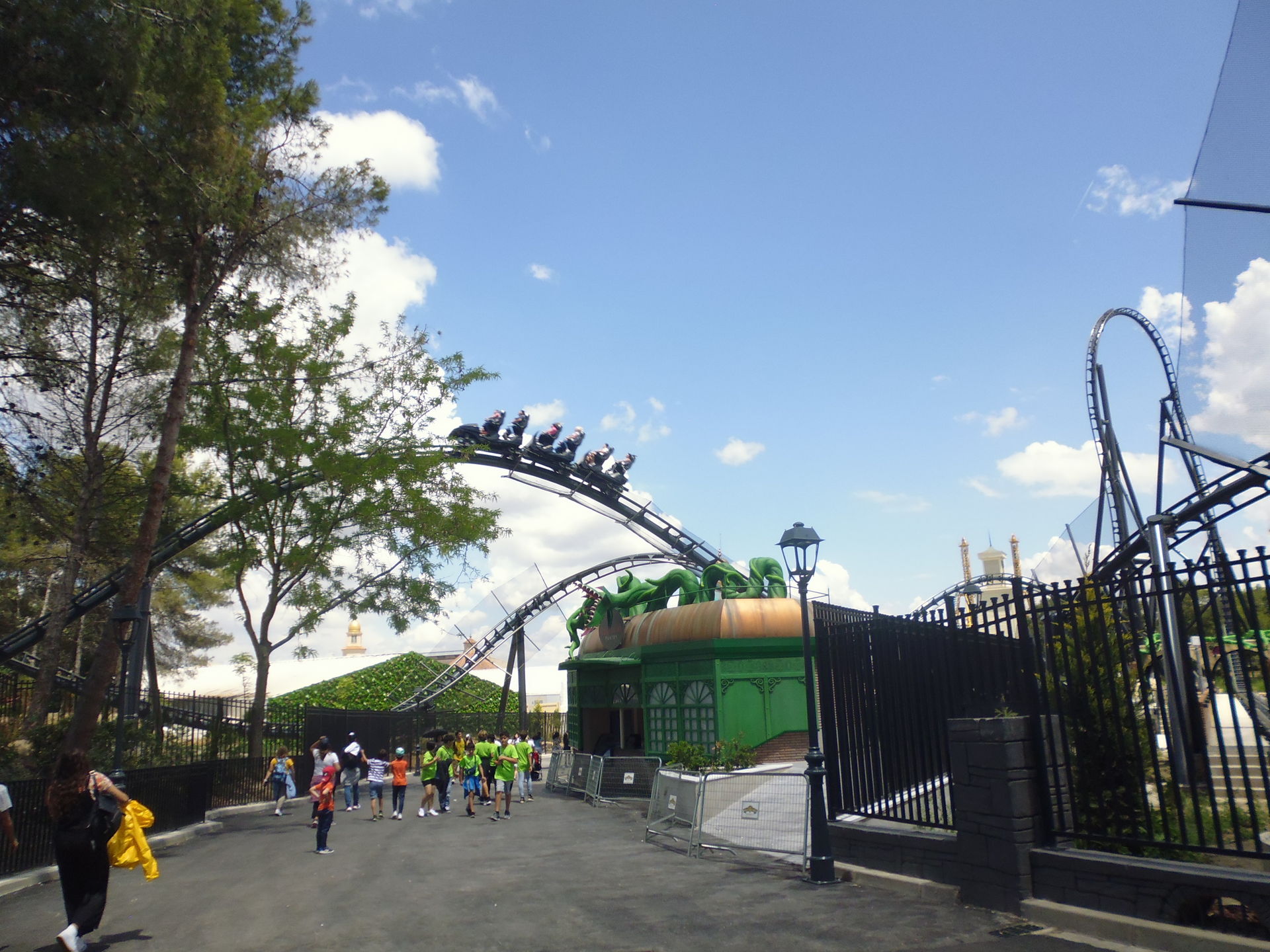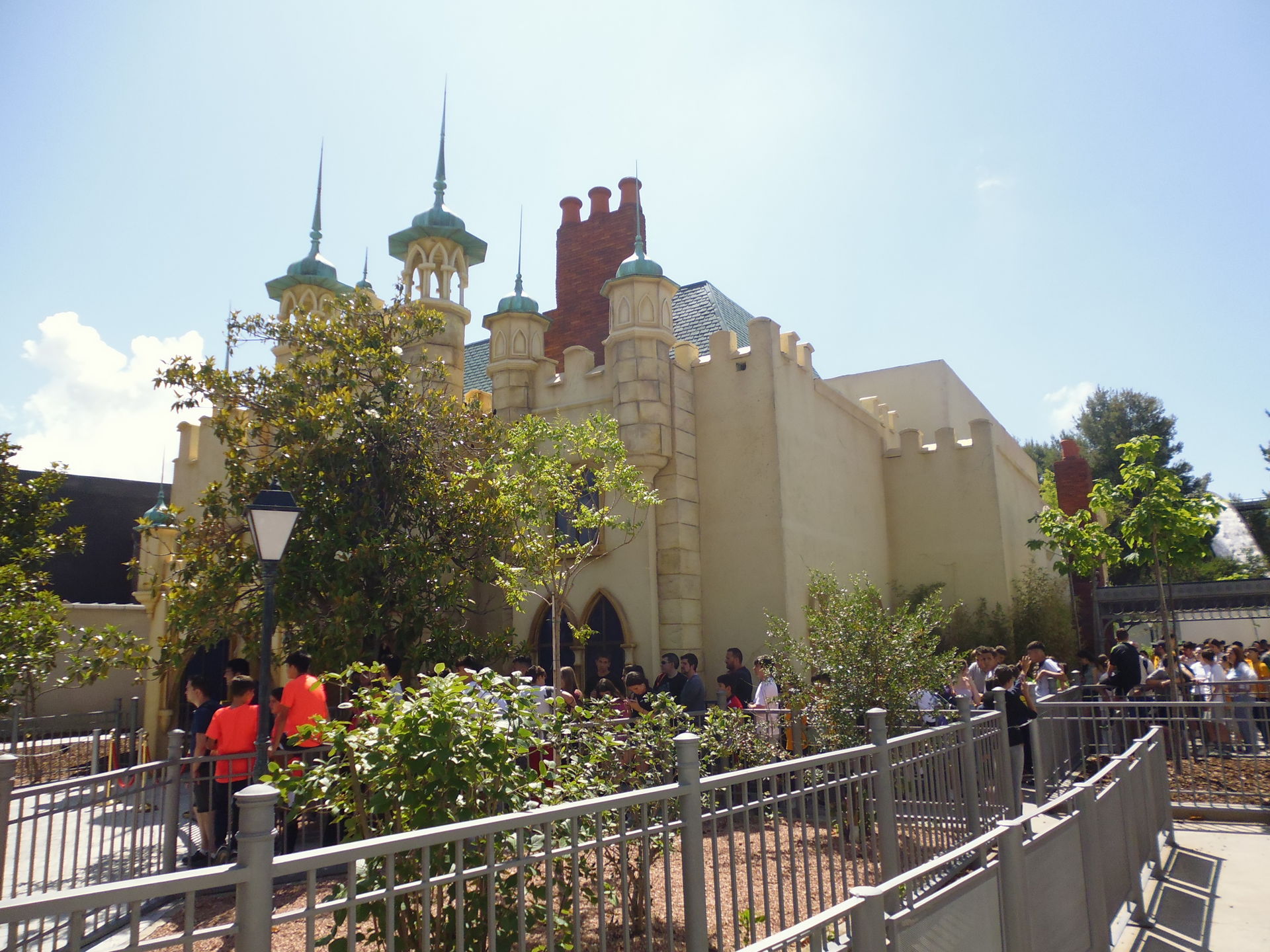 Dabei hiess es beim Online-Ticketkauf auf der Park-Website zu Hause in der Schweiz noch, dies sei einer von "Días de poca afluencia" in dieser Woche, weshalb ein anständig reduzierter Eintrittspreis von 44.90€ veranschlagt wurde. Der Marsch vom Haltepunkt des Busses über den grossen Vorplatz zu den eigentlichen Eingangsportalen war durch die ganzen Menschenmassen wahrlich kein schönes Erlebnis und überhaupt kein gutes Vorzeichen. Überall standen plärrende, johlende und kreischende spanische Schulkinder in riesigen Trauben zusammen und überforderte Lehrkräfte versuchten verzweifelt, der Lage und der Lautstärkenkulisse Herr zu werden. Da aber einmal durchgeboxt erreichte ich alsbald die in Blickrichtung des Eingangs ganz rechte Einlassschlange, wo allem Anschein nach nur private Kleingruppen und Familien anstanden. Obwohl sie sehr abschreckend und lang aussah bewegte sie sich am zügigsten von allen fort, so dass ich nach schon etwa fünf Minuten bereits im Park stand.
