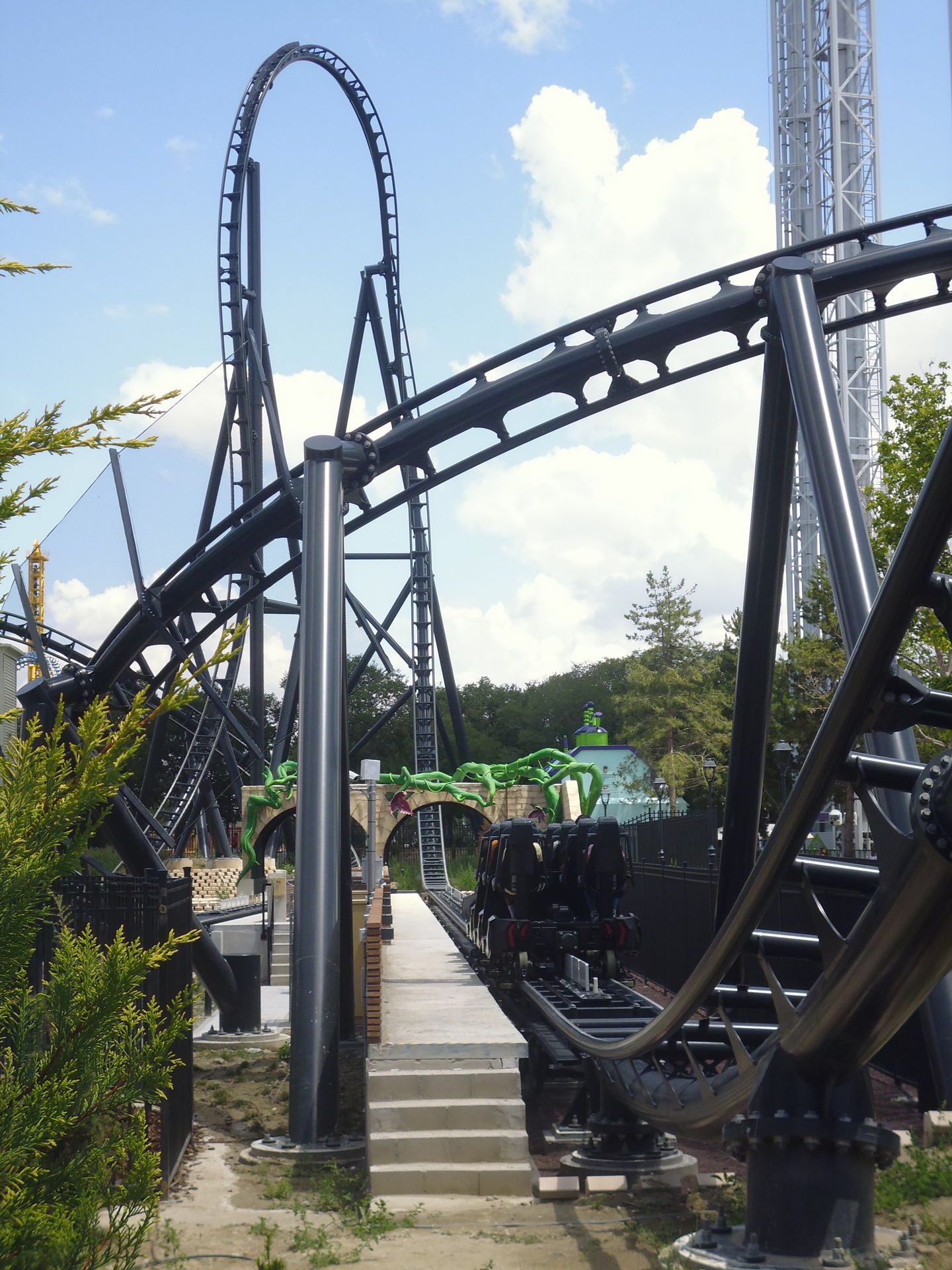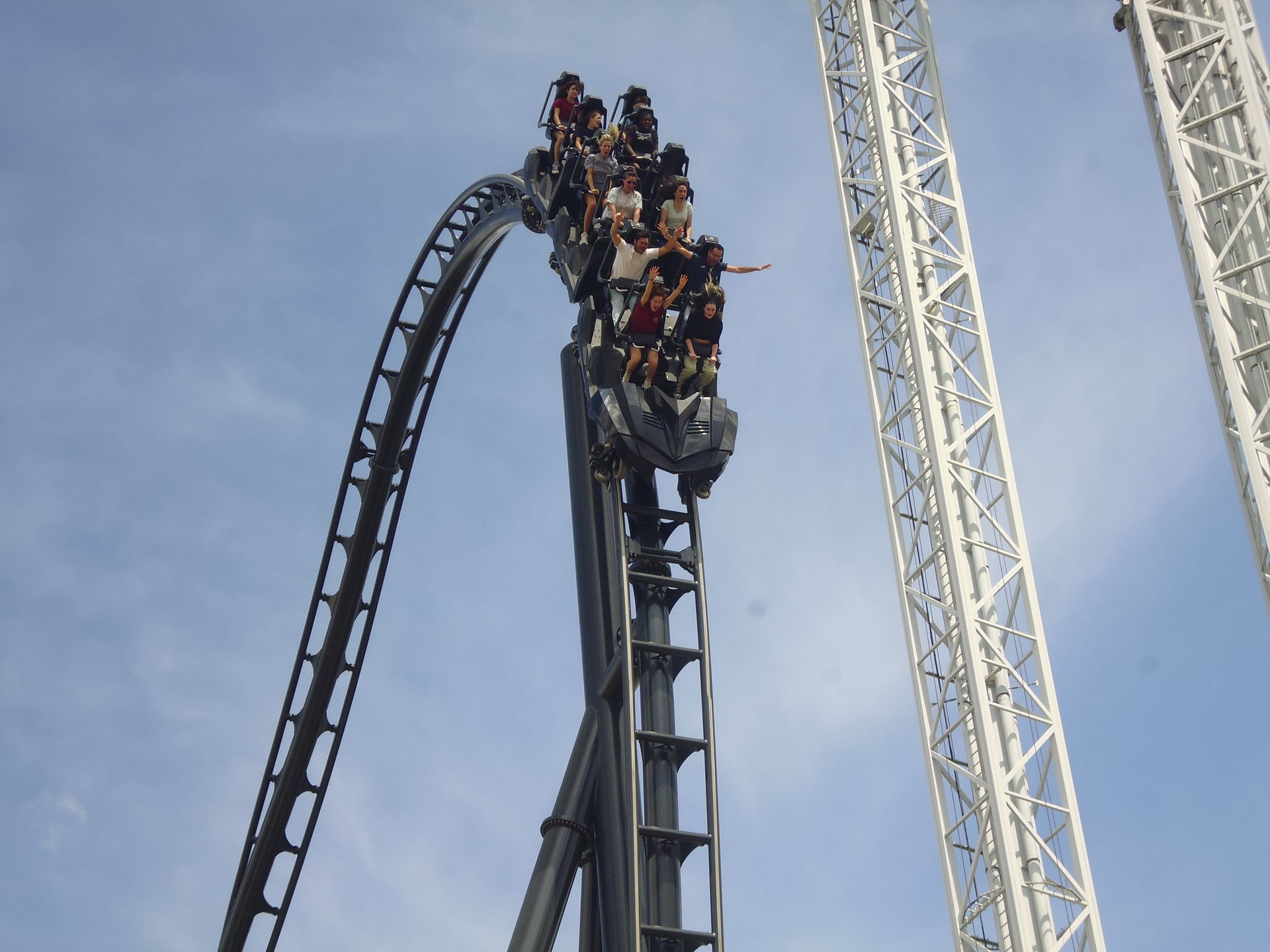 Loop bezeichnen würde, charakteristisch mit diesem "geraden Schienenstück" innerhalb der eigentlichen Korkenzieherhälfte, das die Häupter der Fahrgäste sozusagen zweimal seitlich Anlauf holen lässt, bevor es dann wirklich kopfüber geht. Ähnlich wie beim