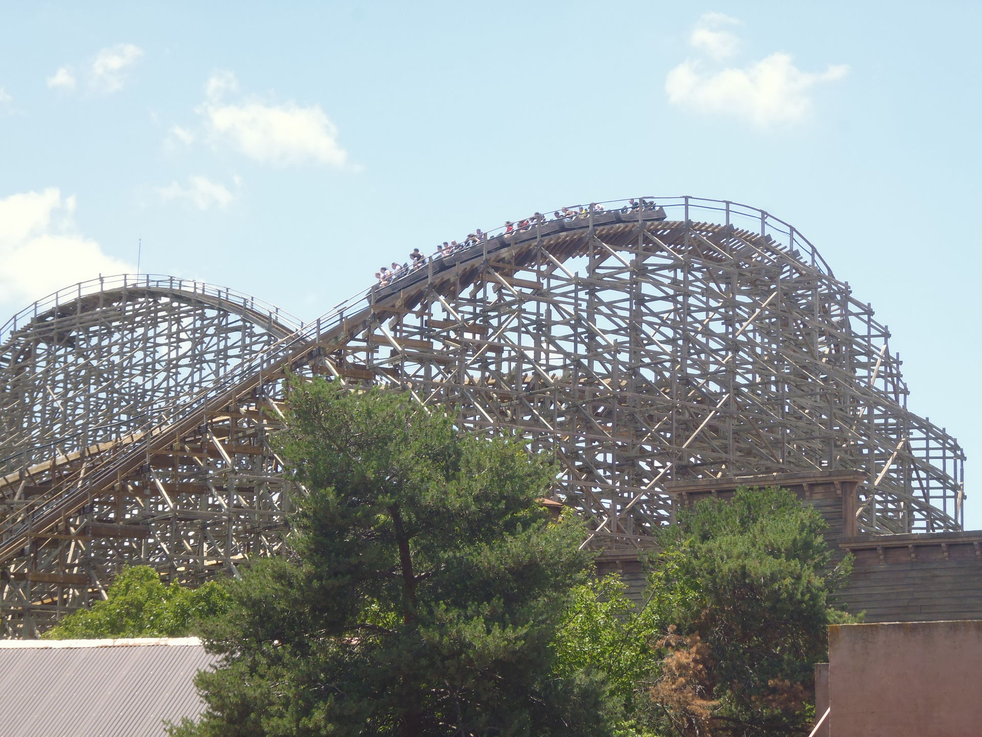 Aber ganz ehrlich: rein von der Fahrt her hat es sich tatsächlich gelohnt, die Reviews sind absolut nicht weit hergeholt. Ich durfte als ich nach 45 statt der angeschriebenen 25 Minuten endlich dran war einen noch leeren Sitz an meinem Wunschplatz füllen, in der Mittelreihe des letzten Sechserwaggons, wo solche Schüttelwoodies ja oft noch eine beachtliche Komfortsteigerung hervorzaubern können. Ob nun das Sitzplatzglück oder aber das reichlich verbaute helle Frischholz hier matchentscheidend waren kann ich natürlich nicht beurteilen, das Resultat war jedenfalls eine wahrhaftig spassige Fahrt mit genau richtigem Holzachterbahn-Feeling, mächtig viel Kurvendruck und sogar einem Hauch von