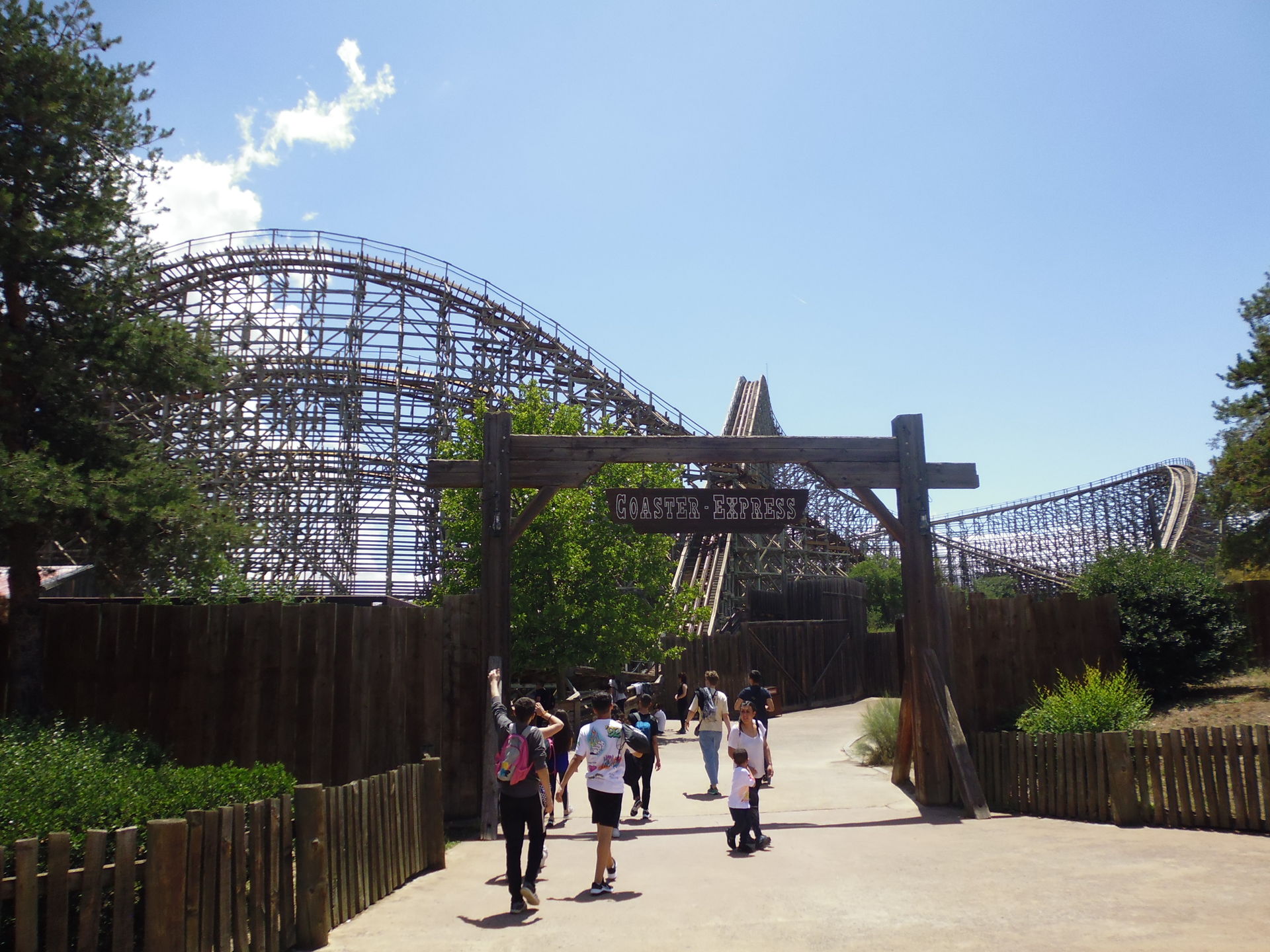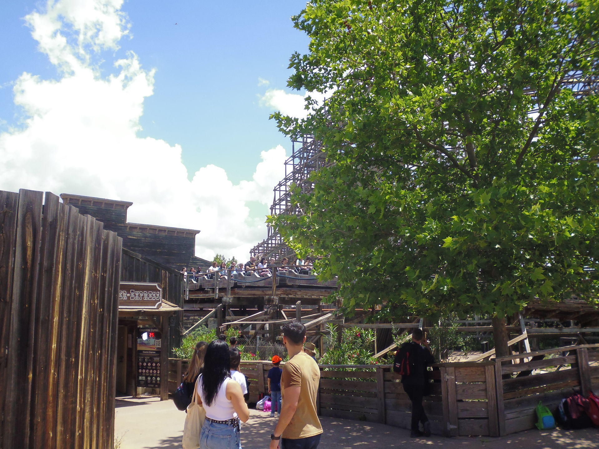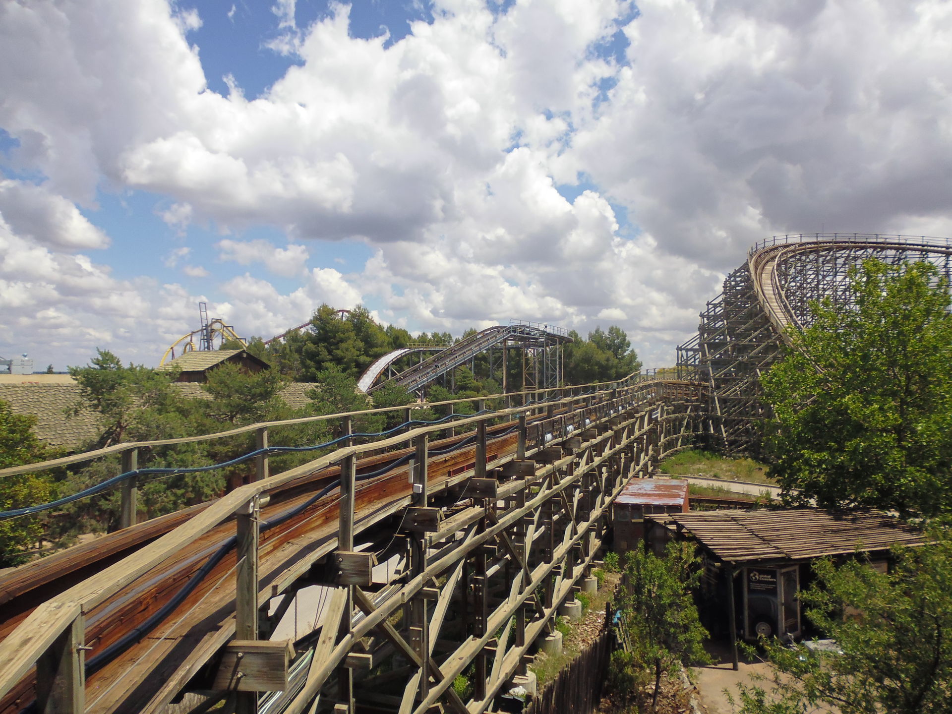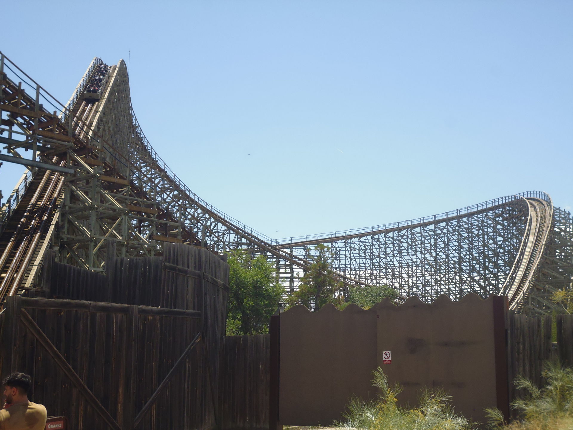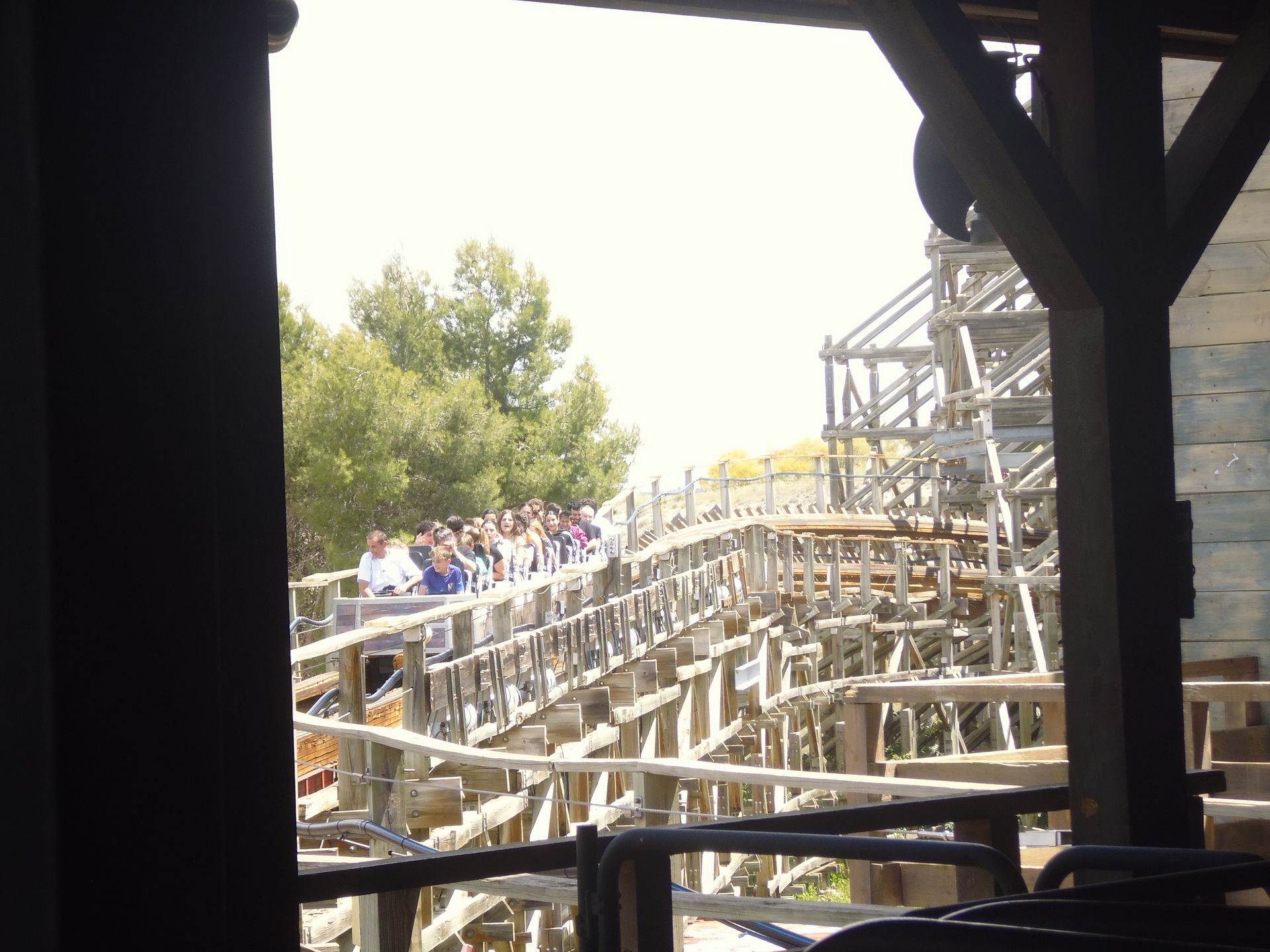 Auf der einzigen funktionierenden Anzeige im Park waren erträgliche 25 Minuten Wartezeit angegeben. Angesichts der auf Google Maps wieder etwas positiver klingenden aktuellen Reviews der Bahn - wohl auch als Konsequenz eines kürzlich erfolgten umfassenden Retrackings - und weil man im Raum Madrid zudem sonst nicht zu seinem Woodie-Fix kommt, dachte ich mir so, dass ich dem Ganzen doch eine Chance geben sollte und begab mich in die Schlange, die zu der Zeit knapp über die zur oberen Wartezone vor der Station führende Treppe hinausragte.