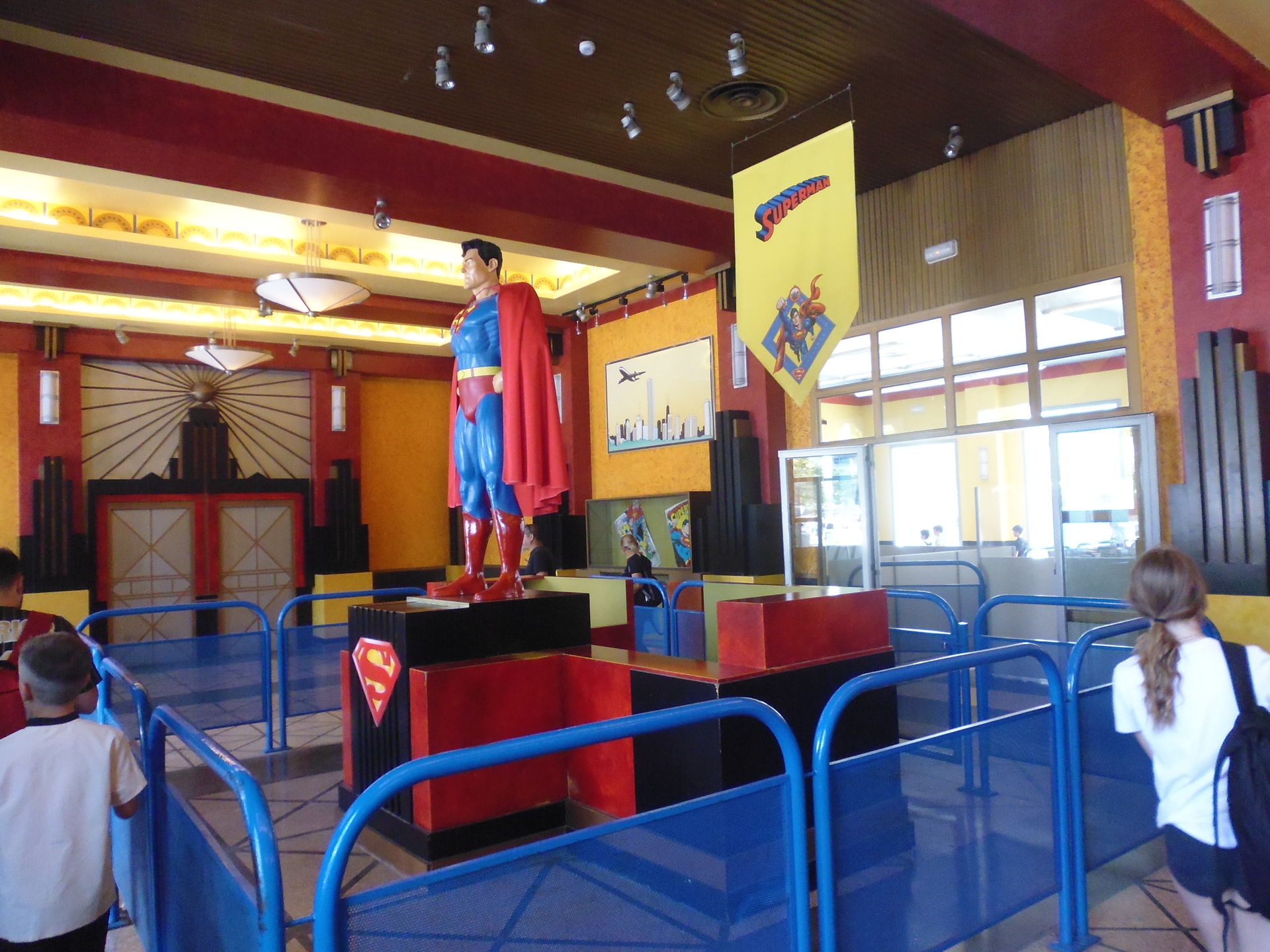 Endlich ist das Eingangsportal zu einem der Hauptgründe für den diesjährigen Kurztrip erreicht. Offenbar wurden Queue und Eingangsgebäude direkt vom Ende 2014 ausser Kommission genommenen Bewegungssimulator Batman Knight Flight übernommen, aber da haben wir dazumals wohl entweder sehr viel Wegführung und die Preshow überspringen können oder es wurde zumindest im unmittelbaren Innern dann doch grundlegend umgestaltet - mir kam jedenfalls absolut nichts mehr bekannt vor.