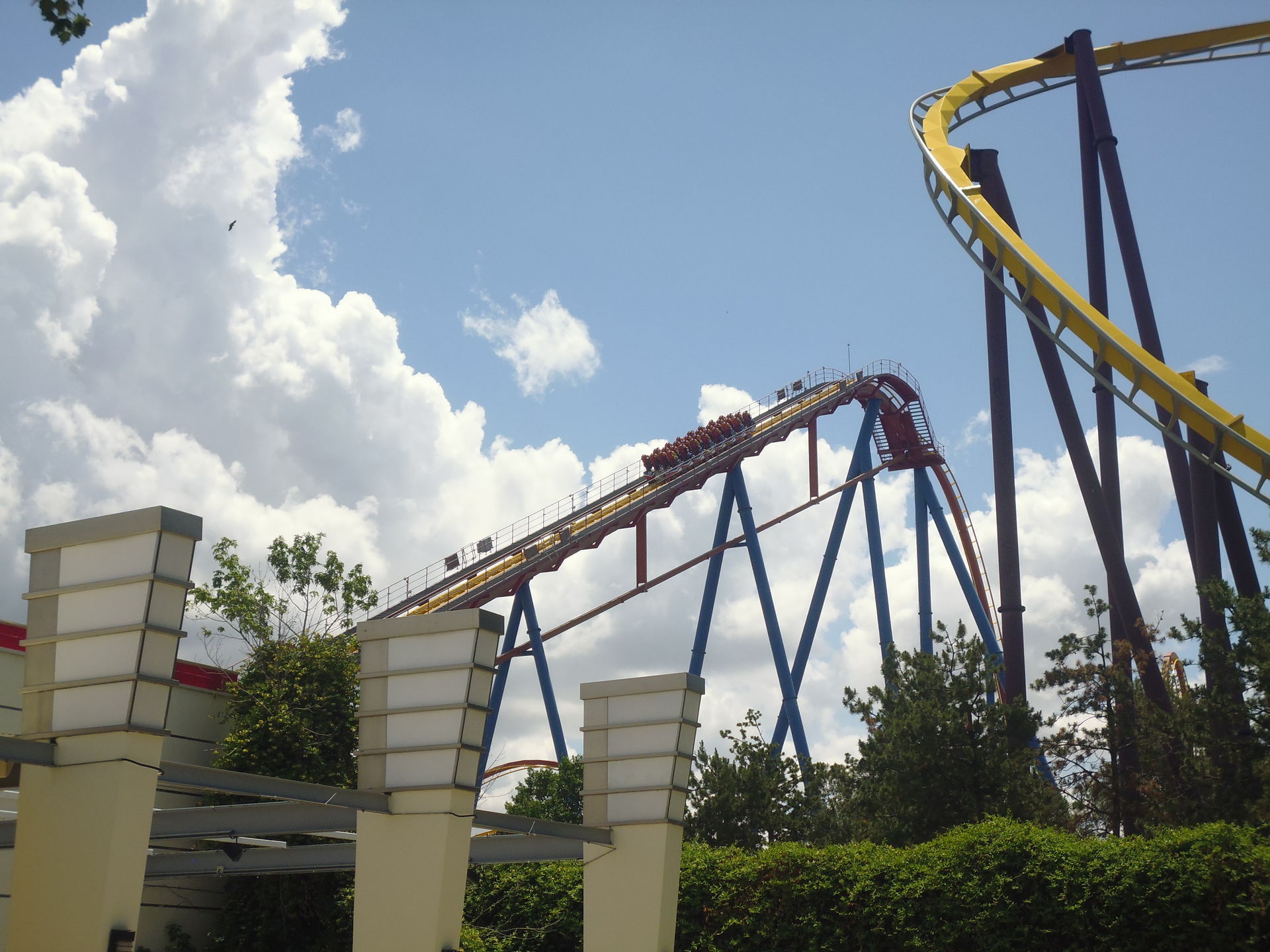 beiden Züge Platz nehmen und sich mit dem Schulterbügel sichern durfte wird der Stationsboden seitlich weggeklappt und es geht los, über eine Kehre aus dem Gebäude hinaus und daraufhin den rund 50 Meter hohen gigantischen Lifthill hoch. An der Spitze angelangt klinkt sich der Zug über den damals noch typischen Pre-Drop von der Kette aus und airtimereich geht es anschliessend auf direktem Wege ins Tal. Mit so erreichtem Schwung von 100 km/h absolviert man druckvoll und wirbelig nun die typische