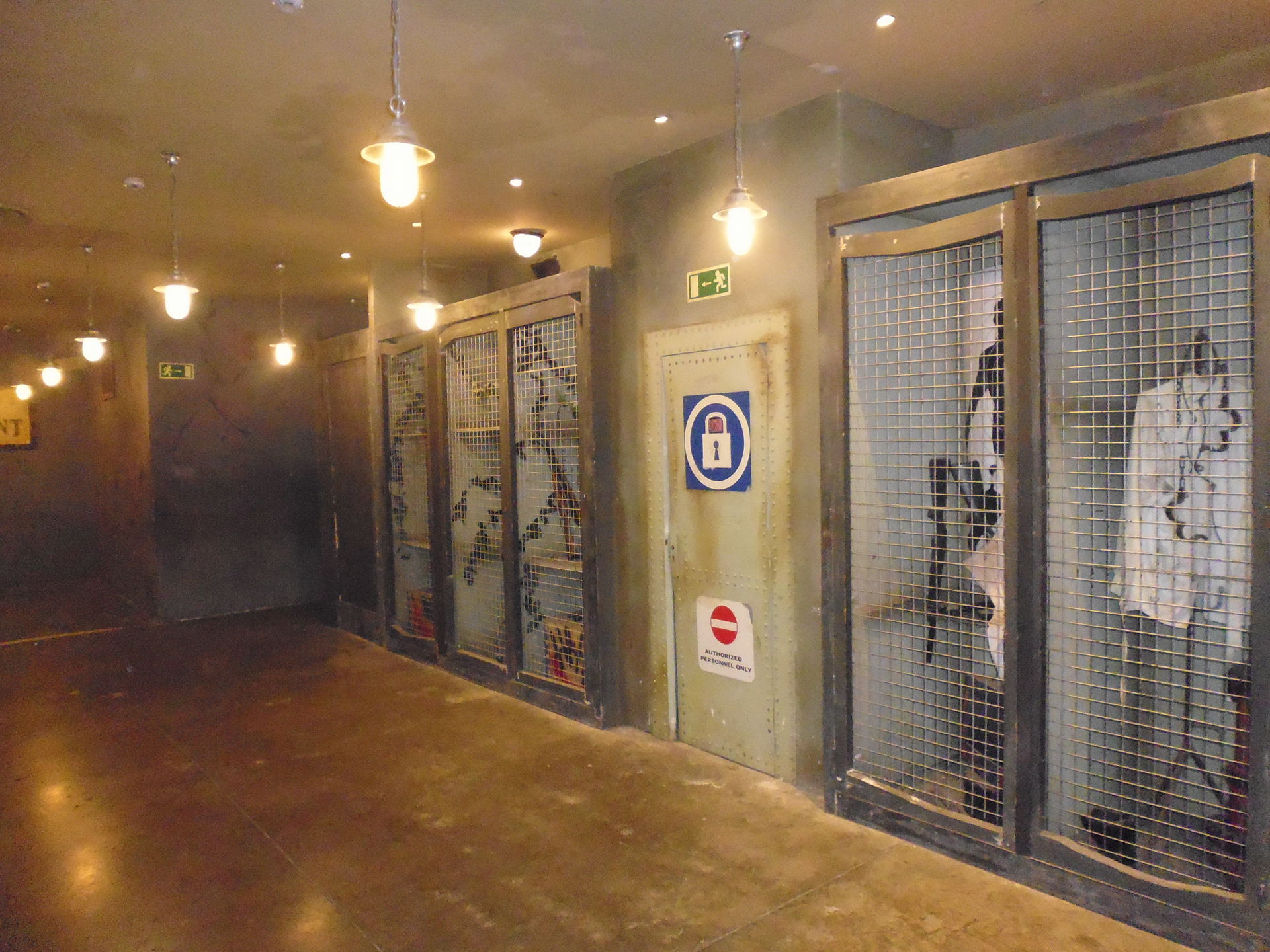 Nun ja, irgendwann wurde endlich auch unser Grüppchen in den Preshow-Raum gebeten, wo man in einer U-Formation um einen zentrierten Zaun herum verteilt wird. Butler Alfred begrüsst uns per Einspieler auf verschiedenen Bildschirmen und möchte gerade die Instruktionen für die folgende Haustour erklären, als er jäh vom Joker unterbrochen und grün erleuchtetes Lachgas durch das Cheminée eingeleitet wird. Gerade zu dem Zeitpunkt öffnen sich endlich Fluchttüren und ein automatisiertes Evakuierungsprogramm wird eingeleitet - nun werden die Gäste über Geheimgänge in einen U-Bahnhof geleitet, wo dann eben die Achterbahnzüge zur eigentlichen Flucht warten. Das Ganze ist zwar durchaus nett gemacht, aber rein logistisch zumindest fragwürdig gelöst. Wer zuvorderst an der Absperrkette gestanden hat und beim Einlass der nächsten 40 entsprechend durch das gesamte "U" im Preshow-Raum gedrängt wird, hat die Arschkarte gezogen. Denn die Fluchttür zum U-Bahnhof befindet sich dann quasi genau am anderen Ende des Raums, im "Bogen" des Us, wodurch man also praktisch von der hinteren Gruppenhälfte überholt wird.