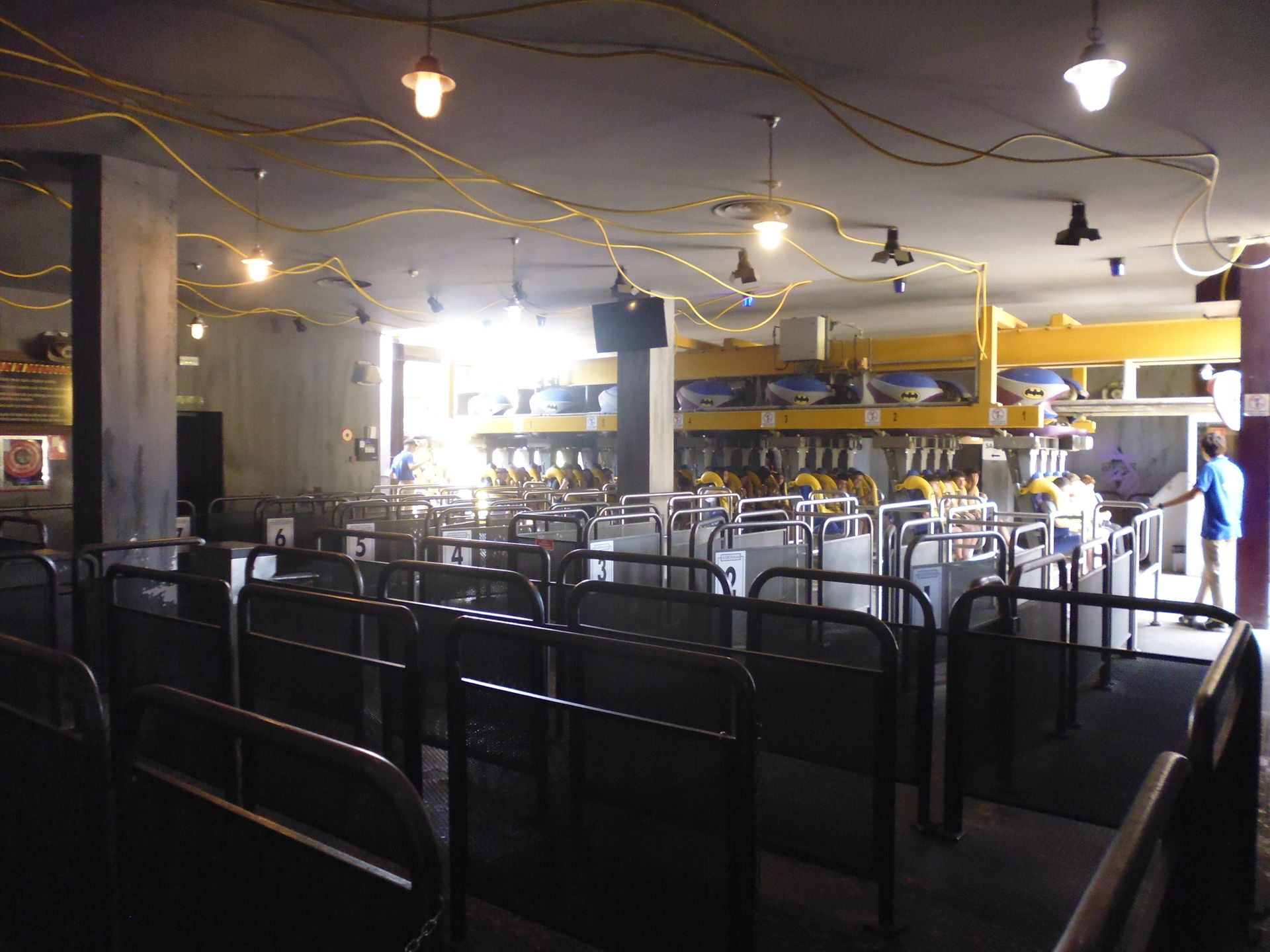 Bis man im Gebäude war brauchte es erst einmal recht viel Geduld. Obschon ich ja um kurz nach zwölf vor Ort eingetroffen bin, war die Schlange bereits etwa zwei Zickzacks im rechten Seitengarten des offenen Wartebereichs lang. Soweit ich das erkennen konnte - da befindet man sich halt in einer Art Patio des im Rahmen der Thematisierung nachgebildeten Wayne Manors, von wo aus der Bahnbetrieb schwierig zu beobachten ist - führte man zu Beginn noch eine Zeitlang Testfahrten durch, bevor dann die ersten Wartenden aus der Schlange ins Gebäude gelassen wurden. Ungefähr alle zehn Minuten oder so wurde dann jeweils ein weiteres Grüppchen von geschätzt etwa 40 Personen für die Preshow ins Innere geführt.
