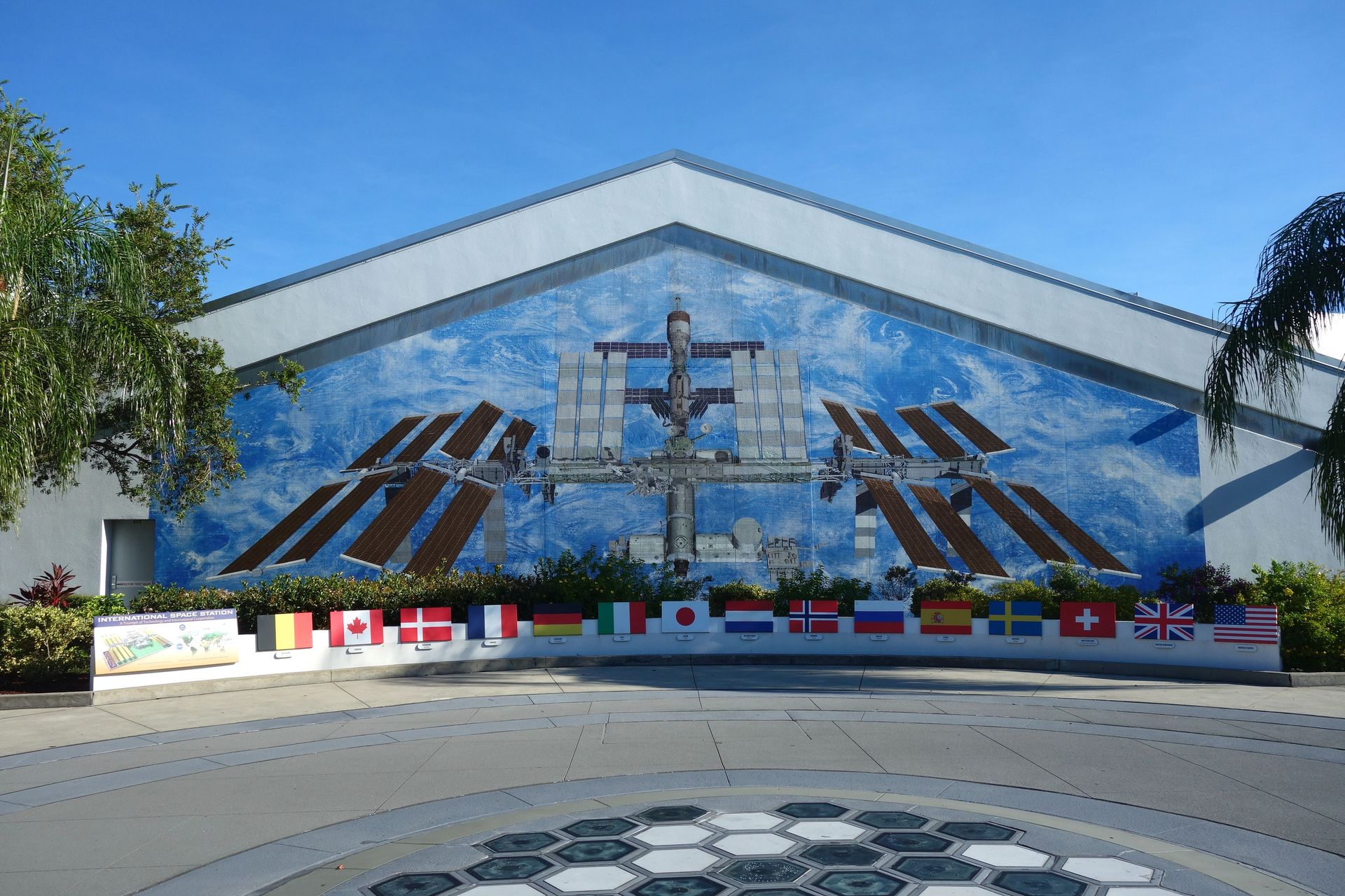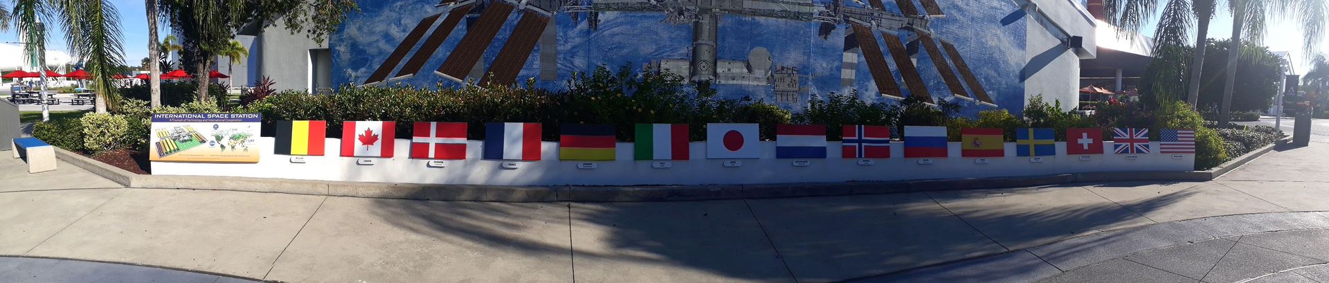 Unter dem Wandgemälde sind übrigens alle an der ISS beteiligten Nationen mit ihren Flaggen aufgeführt.
