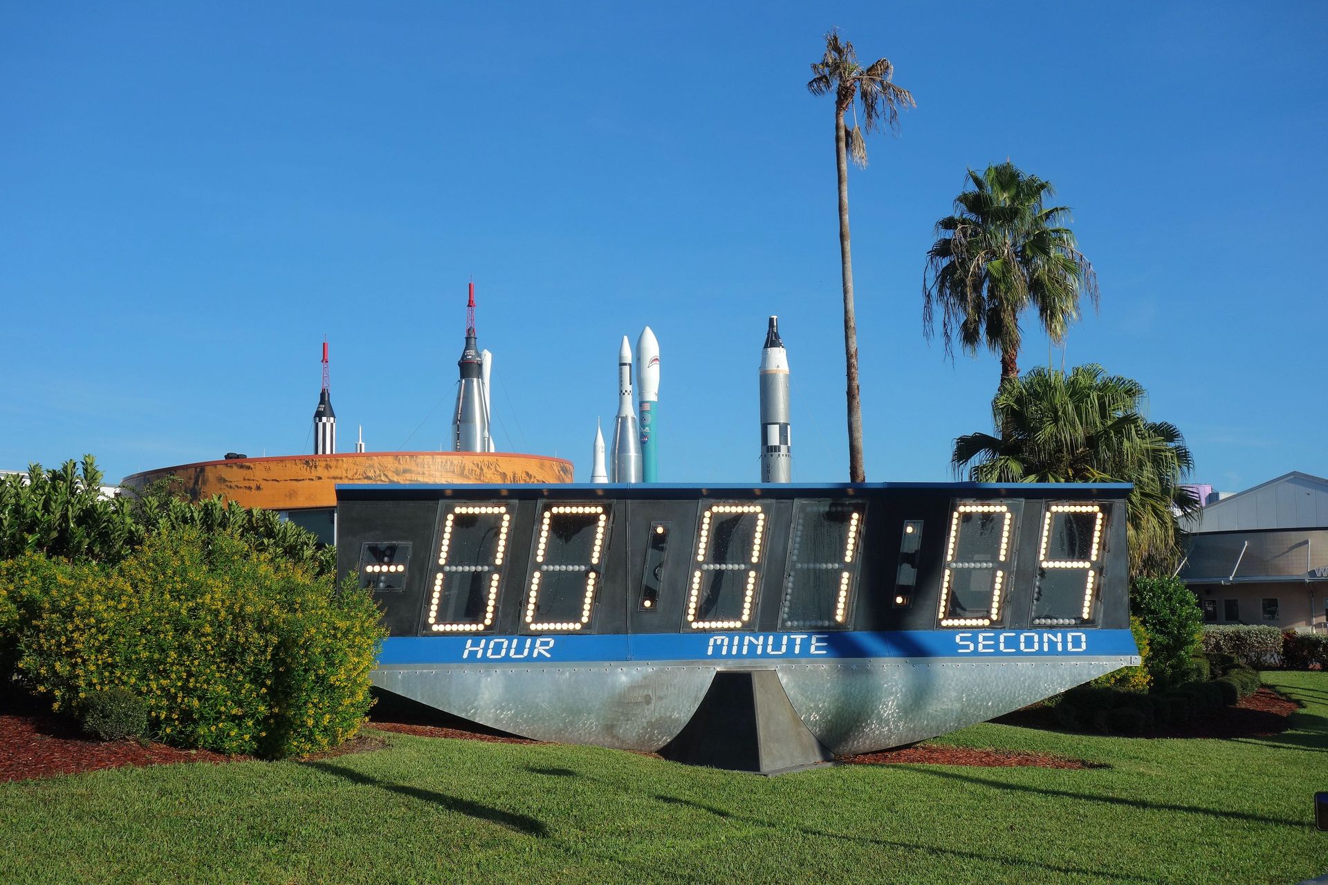 Es handelt sich tatsächlich um jene Uhr, welche 1969 von der NASA dort errichtet wurde, wo die Presse die Starts verfolgen konnte - ihren ersten Einsatz hatte sie beim Start von Apollo 12. Ende 2014 wurde die 8 Meter breite Uhr in den Ruhestand versetzt, da die gut 1,20 Meter hohen und 60 Zentimeter breiten Ziffern bestehend aus 349 einzelnen 40-Watt-Glühlampen einfach nicht mehr zeitgemäß waren. Ihren Platz nahm eine ähnlich große LED-Tafel ein, die neben dem Countdown auch Live-Bilder der Astronauten zeigen kann. Generalüberholt mit neuer Steuerung und einfacher zu wechselnden Lampen wurde die historische alte Uhr 2016 vor dem Eingang des Visitor Complex platziert. Dort tickt sie wohl gelegentlich herunter, während zugehörige Audio-Mitschnitte abgespielt werden. Warum das nun ausgerechnet diese 69 Sekunden sind, konnte ich aber leider nicht herausfinden.
