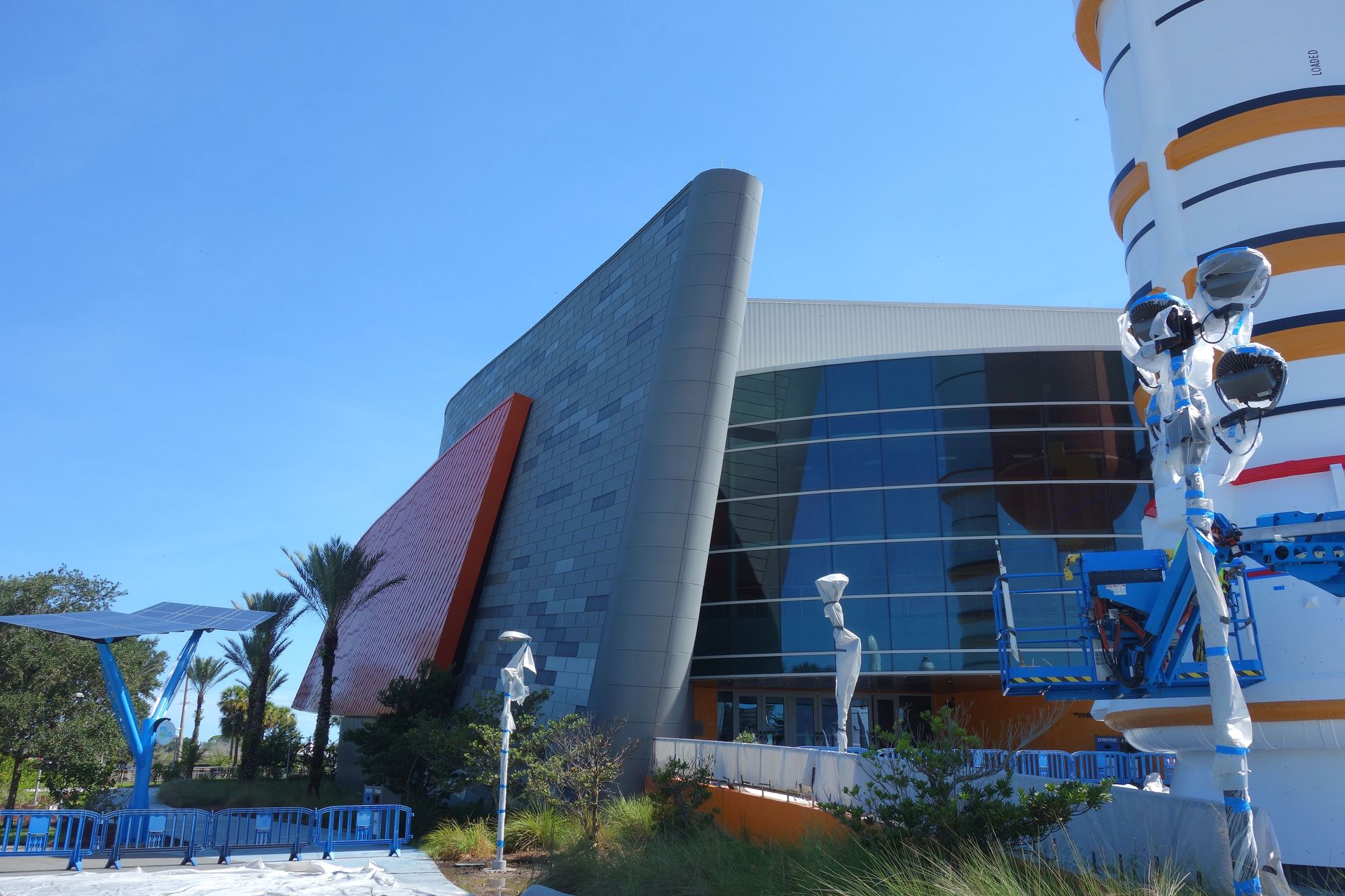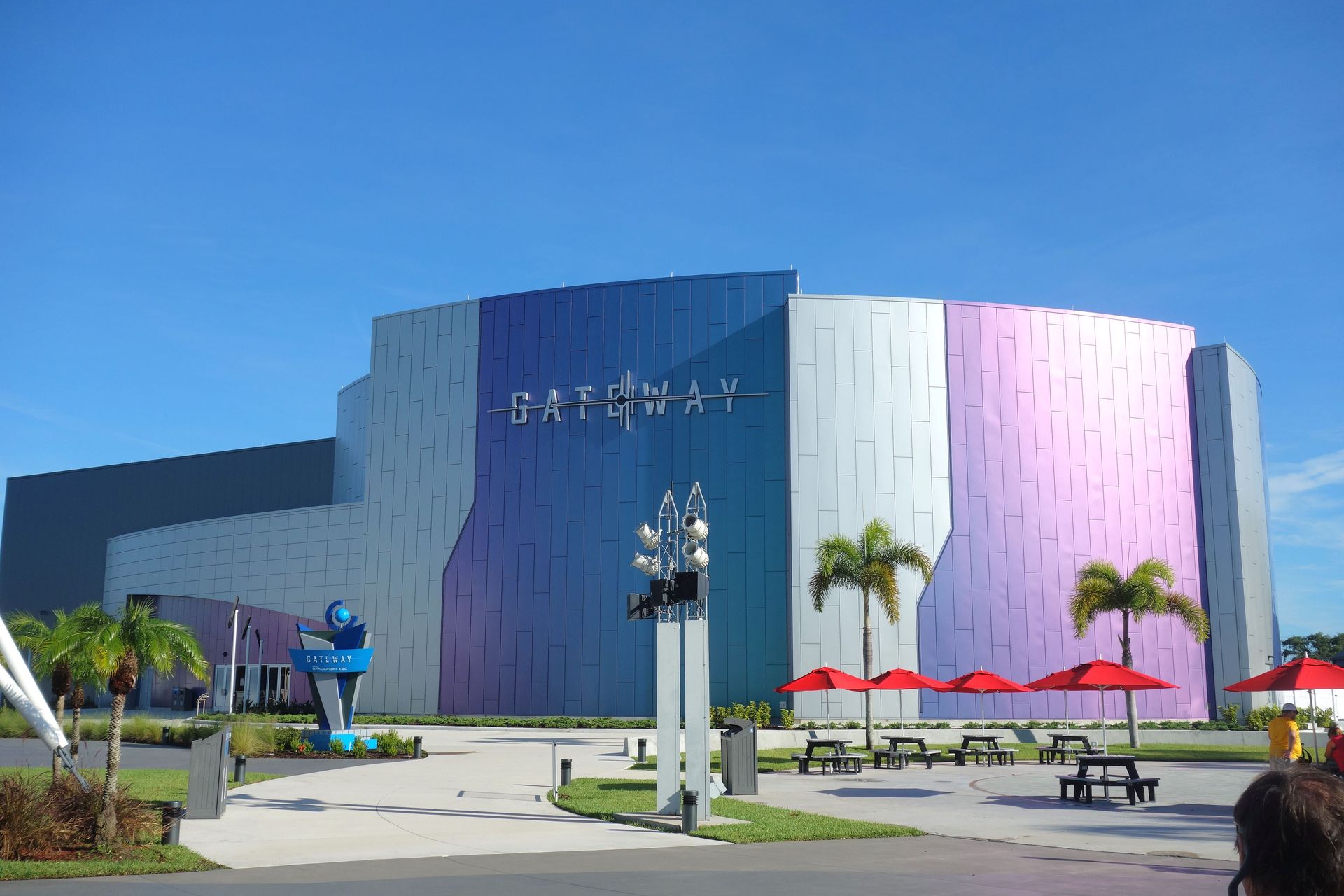 An der Halle vorbei gelangt man zu einer Outdoor-Veranstaltungsfläche und Tribünen für Besucher von Raketenstarts.