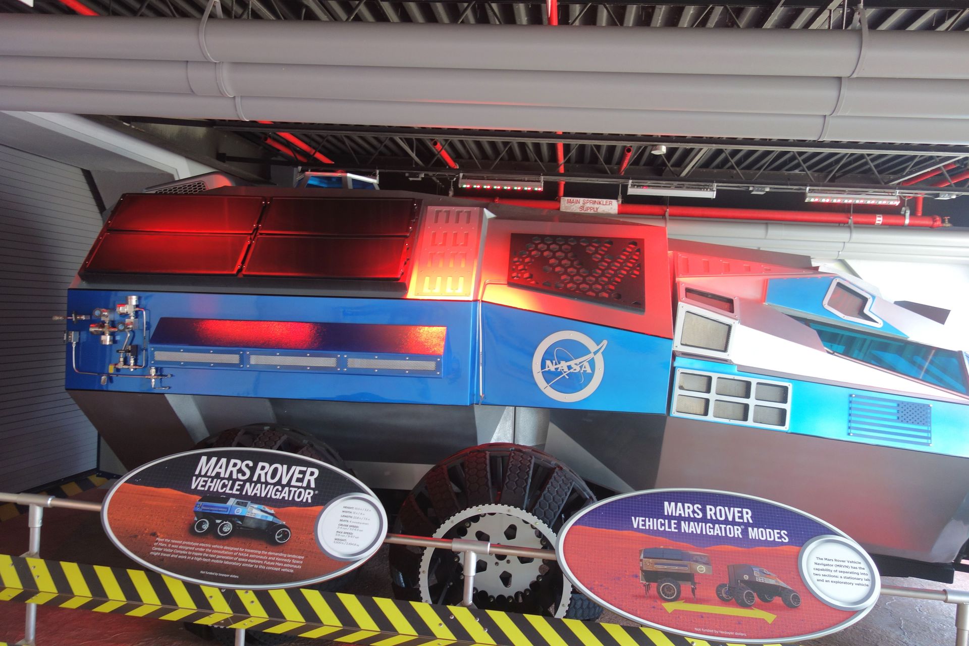 Denn die Mondlandefähre LM-9 hätte eigentlich mit Apollo 15 zum Mond fliegen sollen. Doch nachdem das Apollo-Programm um drei Missionen gekürzt wurde, wurde auch der Einsatz des Mond-Rovers um eine Mission vorgezogen. Dessen Transport erforderte jedoch den Einsatz eines verbesserten Lunar Modules, welches auch längere Aufenthalte auf der Mondoberfläche erlaubte. LM-9 blieb daher ungenutzt und konnte im Kennedy Space Center ausgestellt werden. Zunächst an der Decke hängend, ließ man die Fähre zum 50. Jubiläum der ersten Mondlandung 2019 inmitten der Halle in einem kleinen Diorama landen, wo sie sicherlich deutlich besser zur Geltung kommt. Vom Lunar Roving Vehicle wurden dagegen - neben verschiedenen Test- und Trainingseinheiten - vier Stück gebaut, von denen eben drei mit Apollo 15, 16 und 17 zum Mond flogen und dort verblieben. Der hier ausgestellte vierte Rover diente laut englischer Wikipedia angeblich als Ersatzteilspender für die anderen drei. Sinniger finde ich da die gegenteilige Beschreibung des National Air and Space Museums (welches LRV-4 wohl ans Kennedy Space Center ausgeliehen hat), wonach es sich auch hierbei um ein nicht einsatzfähiges Ausstellungsstück handelt, welches überwiegend aus übrig gebliebenen Ersatzteilen der drei Originalrover gebaut wurde.
