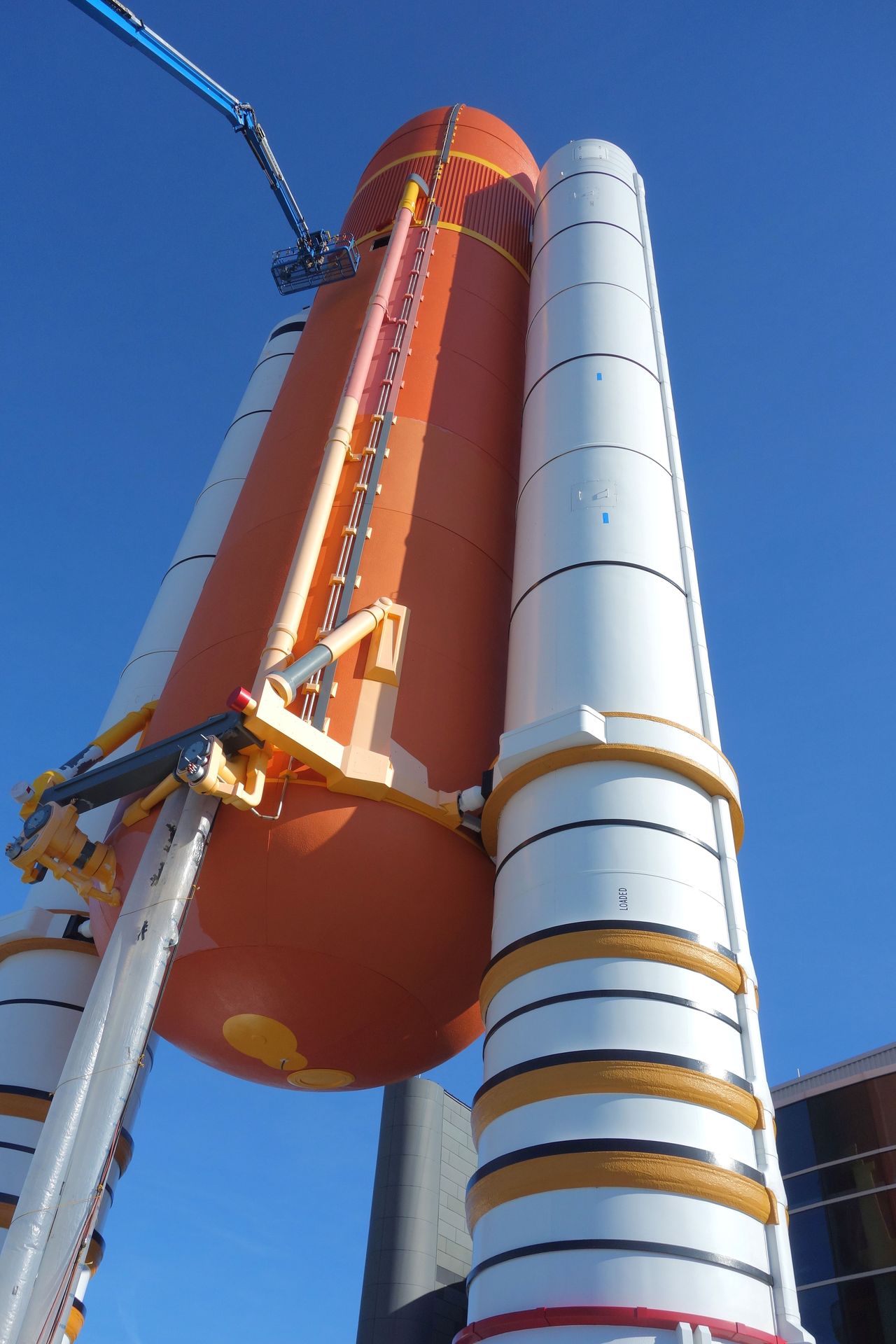 Der im Original stolze 120 Meter hohe Turm war einst Teil des Mobile Launchers und versorgte über 9 Ausleger die Saturn V mit Treibstoff, Sauerstoff, Strom und allem, was die Rakete sonst noch zum Starten brauchte. Und natürlich dienten die Ausleger auch dem Zugang für Techniker, sowie natürlich für die Astronauten. Vier der Arme wurden kurz vor dem Launch beiseite geschwenkt, die übrigen fünf blieben bis zum Start verbunden und wurden erst mit dem Abheben verschwenkt.