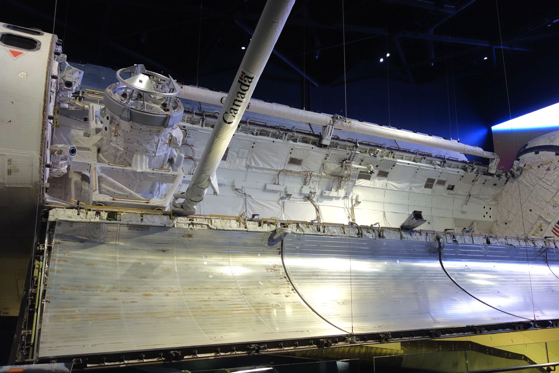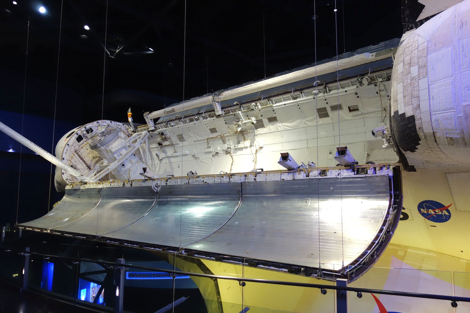 In einem Winkel von 43,21° wurde der Orbiter mit offener Ladebucht und ausgefahrenem Canadarm im ersten Stock der Halle drapiert.