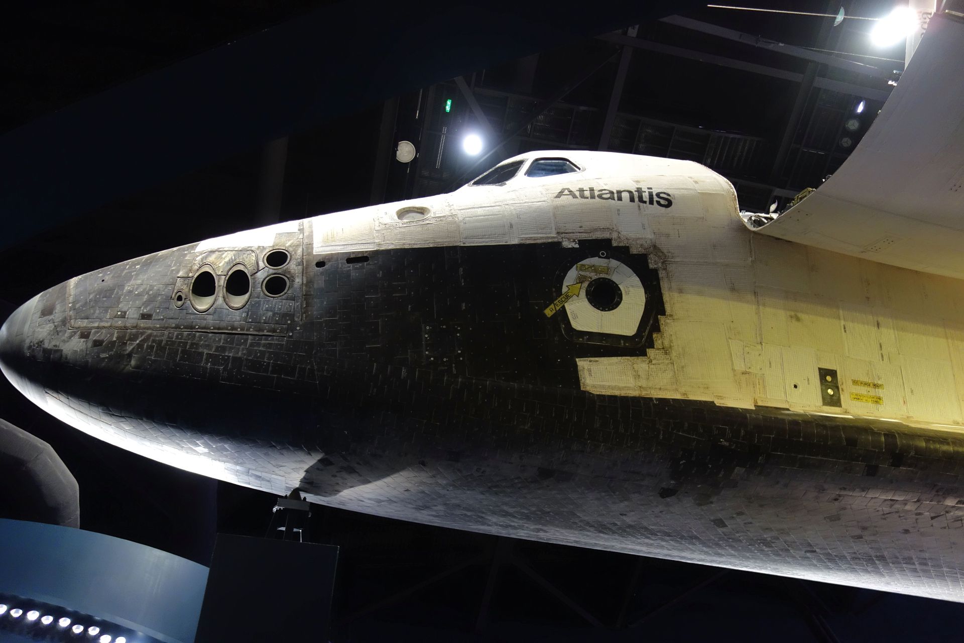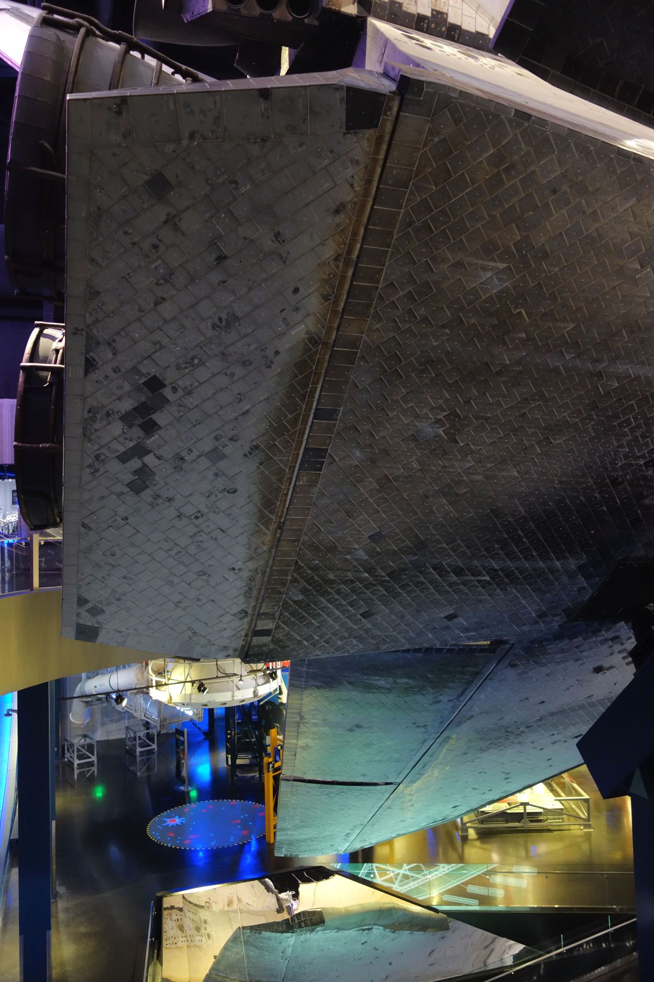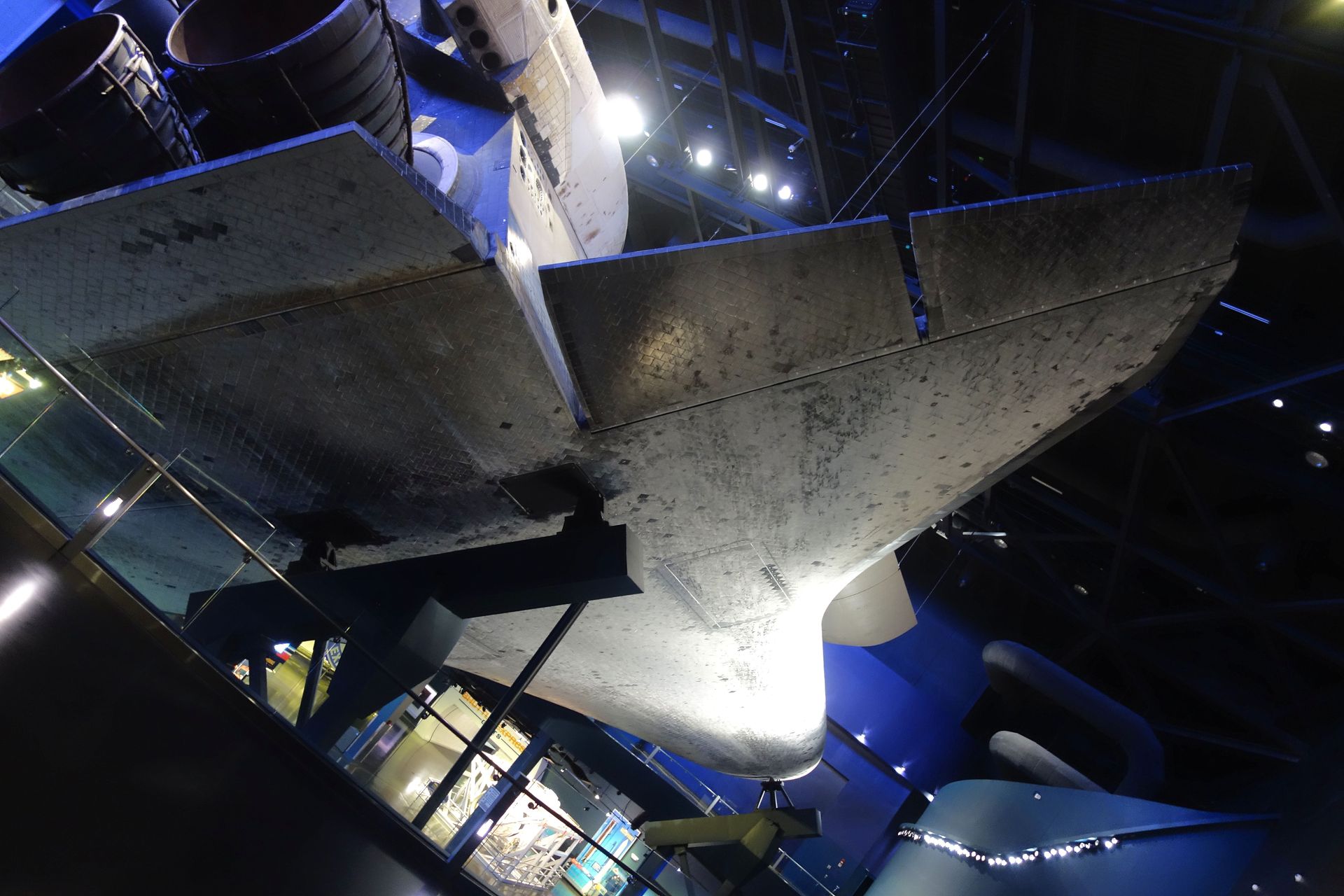 Von unten kann der Hitzeschild der Atlantis nochmal genauer unter die Lupe genommen werden.