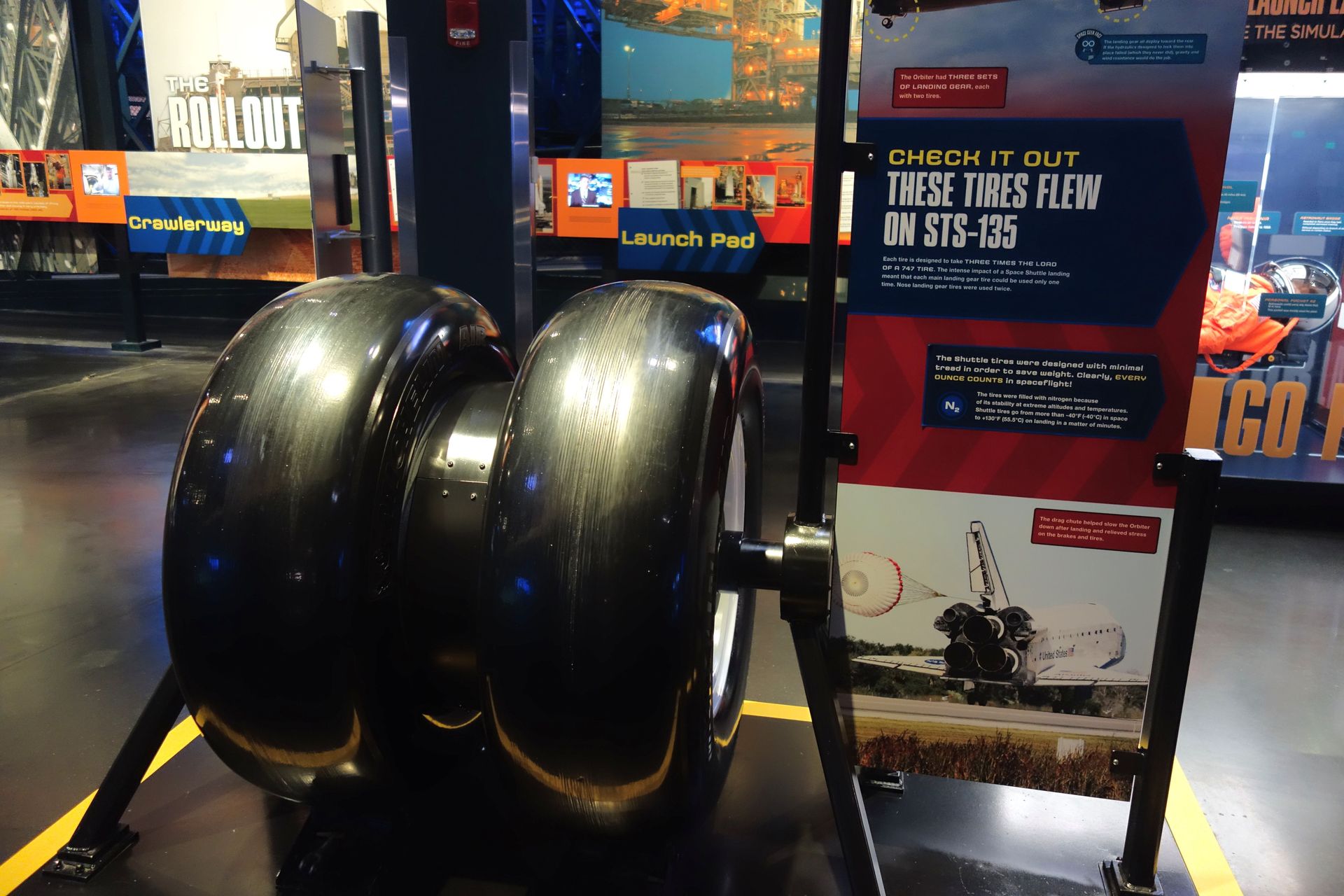 Vom Jungfernflug zum Abschiedsflug. Die originalen Reifen des allerletzten Shuttle-Fluges können sogar berührt und gedreht werden.