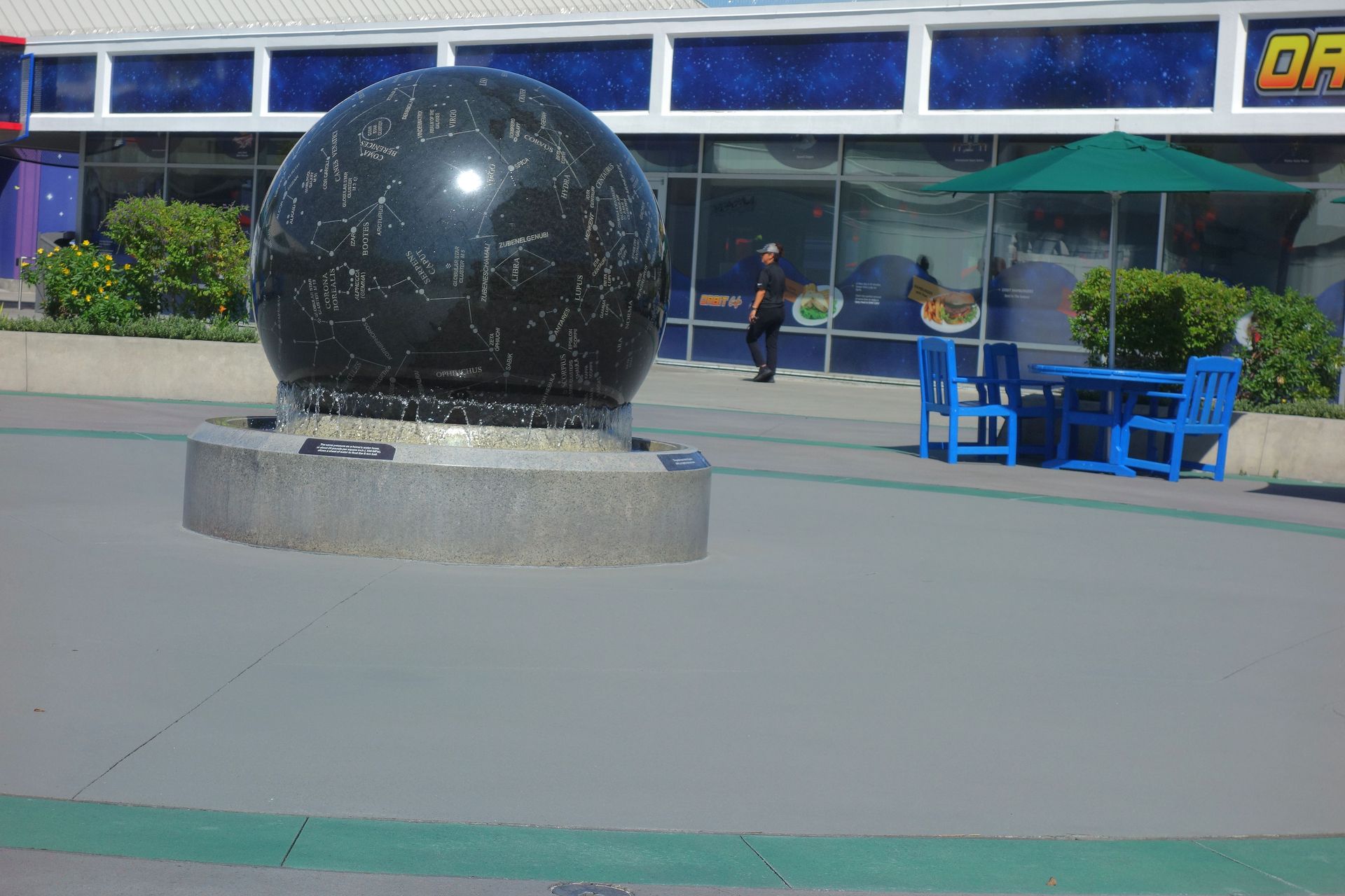 Wir mussten daher einmal ums Orbit Café herum. Vorbei am Kugelbrunnen, dessen 9 Tonnen schwere Granitkugel mit 88 Sternbildern versehen wurde.