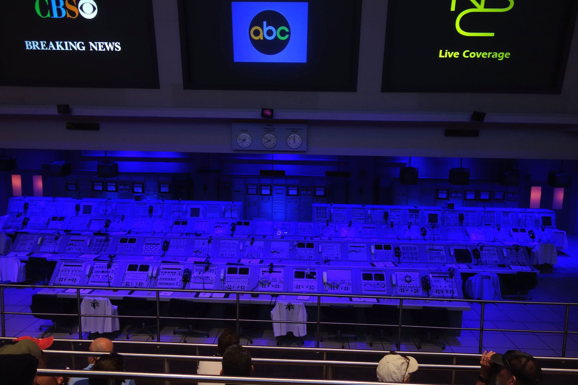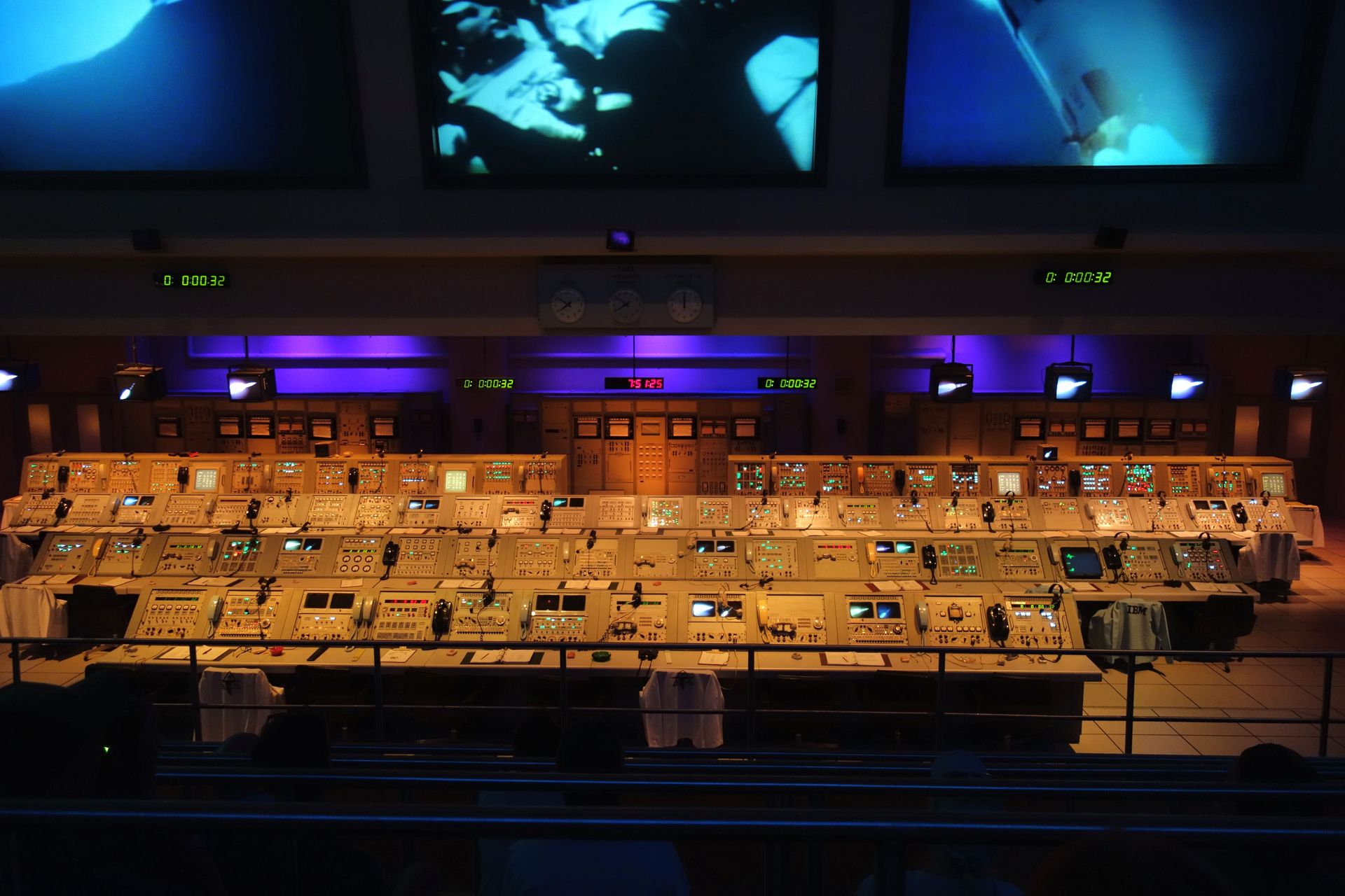 Anschließend geht es in einen nachgebauten Firing Room des LCC aus der Apollo-Zeit - wobei der echte neun statt vier Reihen hatte.