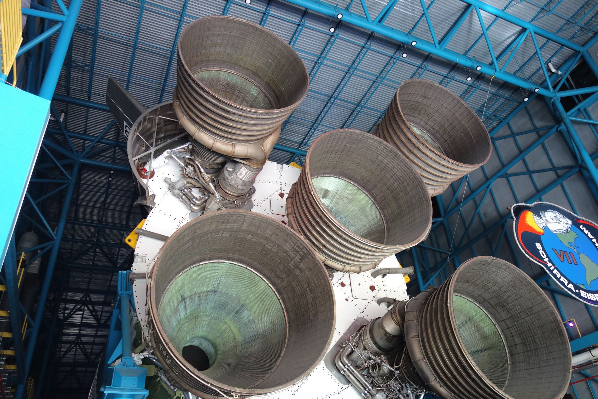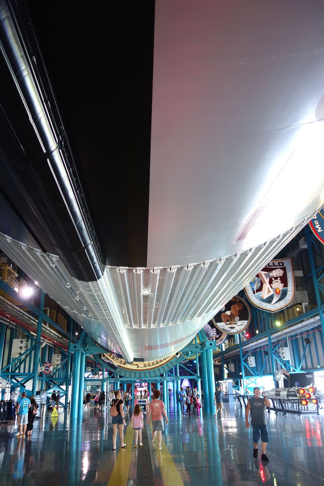 Ähnlich wie in Houston werden entlang der Halle die Logos der Apollo-Missionen präsentiert.