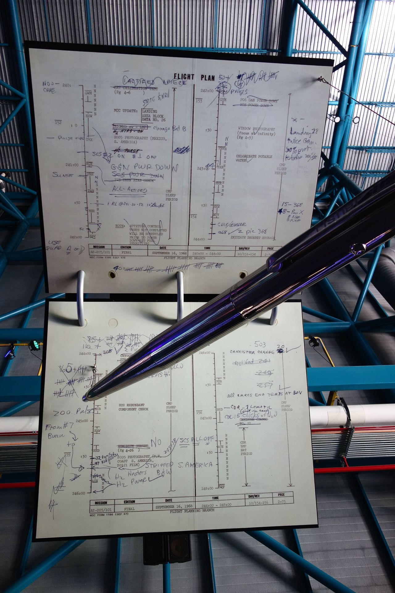 Über den Köpfen der Besucher hängt ein übergroßer Flugplan von Apollo 7 inklusive des dort erstmals genutzten Space Pens.