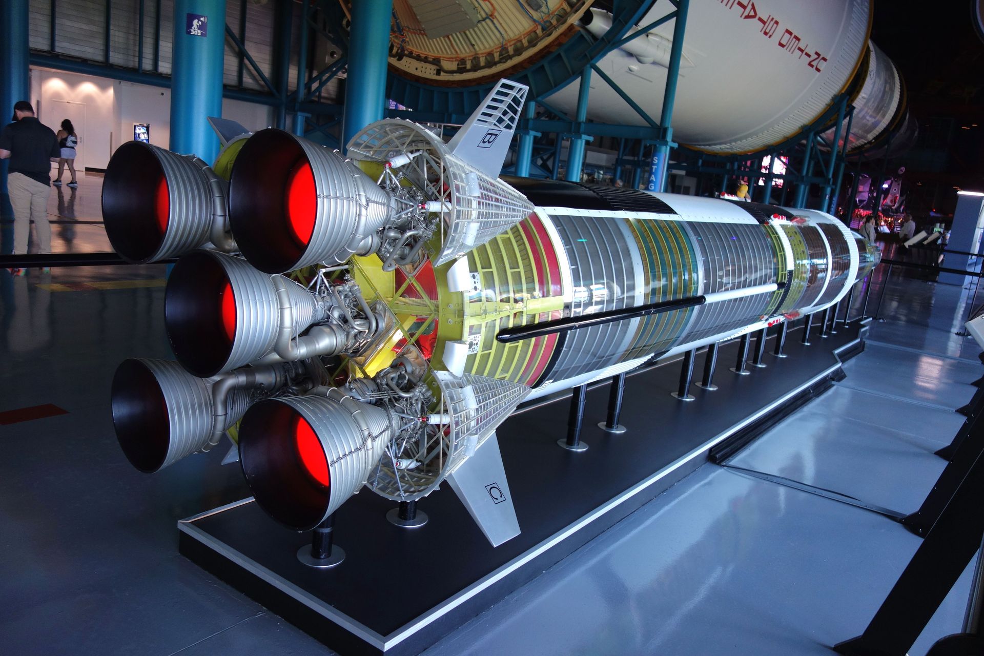 Ein unwesentlich kleineres Modell zeigt die Innereien einer solchen Saturn V.