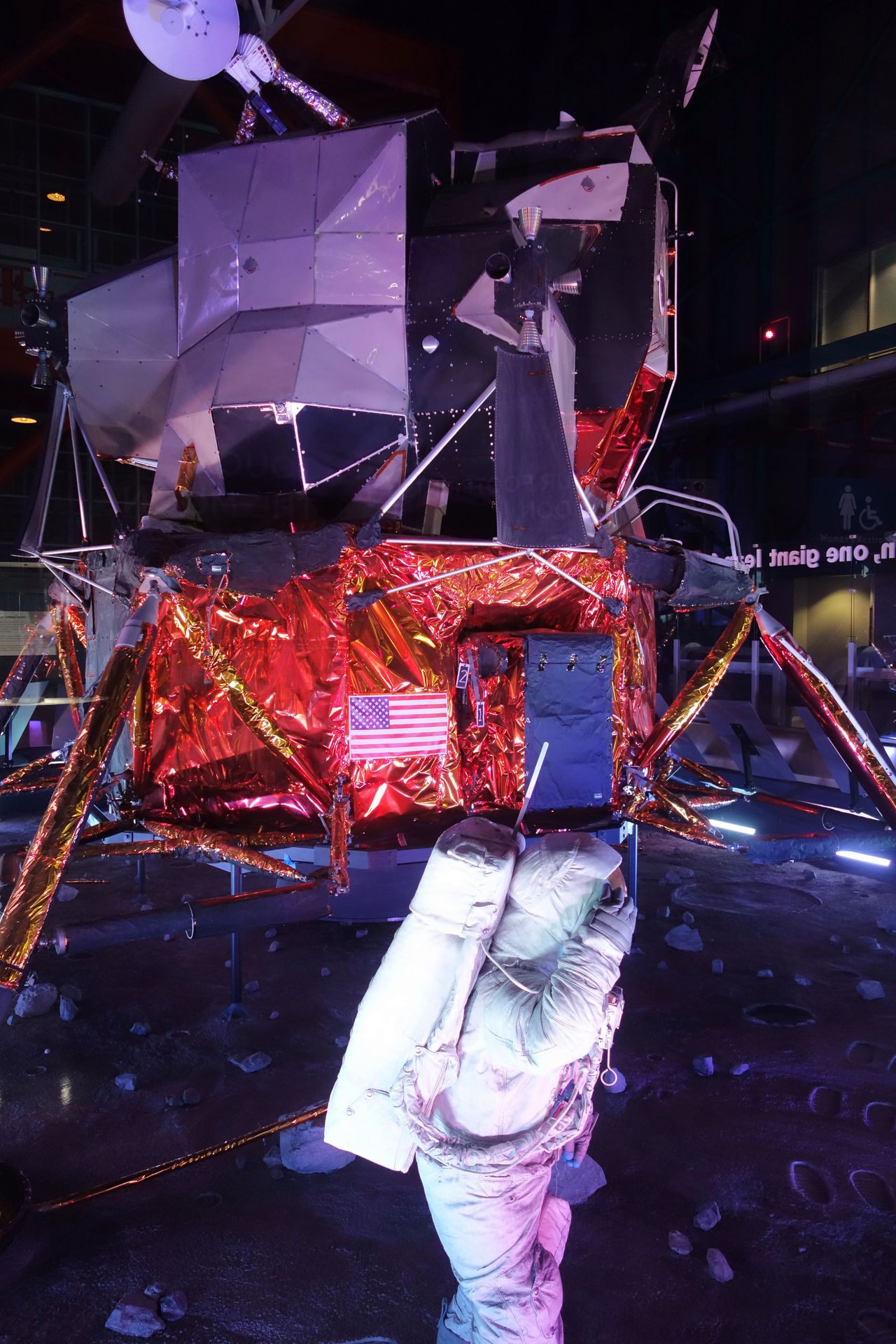 - Erklärung aller Probleme und Störungen, denen sich die Astronauten an Bord der Mondlandefähre ausgesetzt sahen, schwebt dabei ein Modell einer solchen Fähre auf die Bühne herab und landet. Hinzu kommt eine große Leinwand direkt daneben, welche Neil Armstrong beim Verlassen des Gefährts mit seinem berühmten Spruch zeigt. In der Zwischenzeit wird die Dunkelheit genutzt, um eine Astronautenfigur und eine amerikanische Flagge aus dem Boden der Bühne emporfahren zu lassen. Es folgen weitere Aufnahmen auch von den späteren Mondmissionen und schließlich wird der gesamte Hintergrund mit Sternen, Erde, Mars, ISS und Galaxien illuminiert, während einige Kinder darüber berichten, wie gerne sie Astronaut oder Raketenwissenschaftler werden möchten. Hier und da etwas langatmig, aber der Mondlandungs-Teil der Show ist schon ziemlich gut umgesetzt. Im Ausgang des Theaters sind dann zahlreiche originale Artefakte ausgestellt. Werkzeuge, Raumanzüge - darunter jener von Alan Shepard mit original Mondstaub übersät...