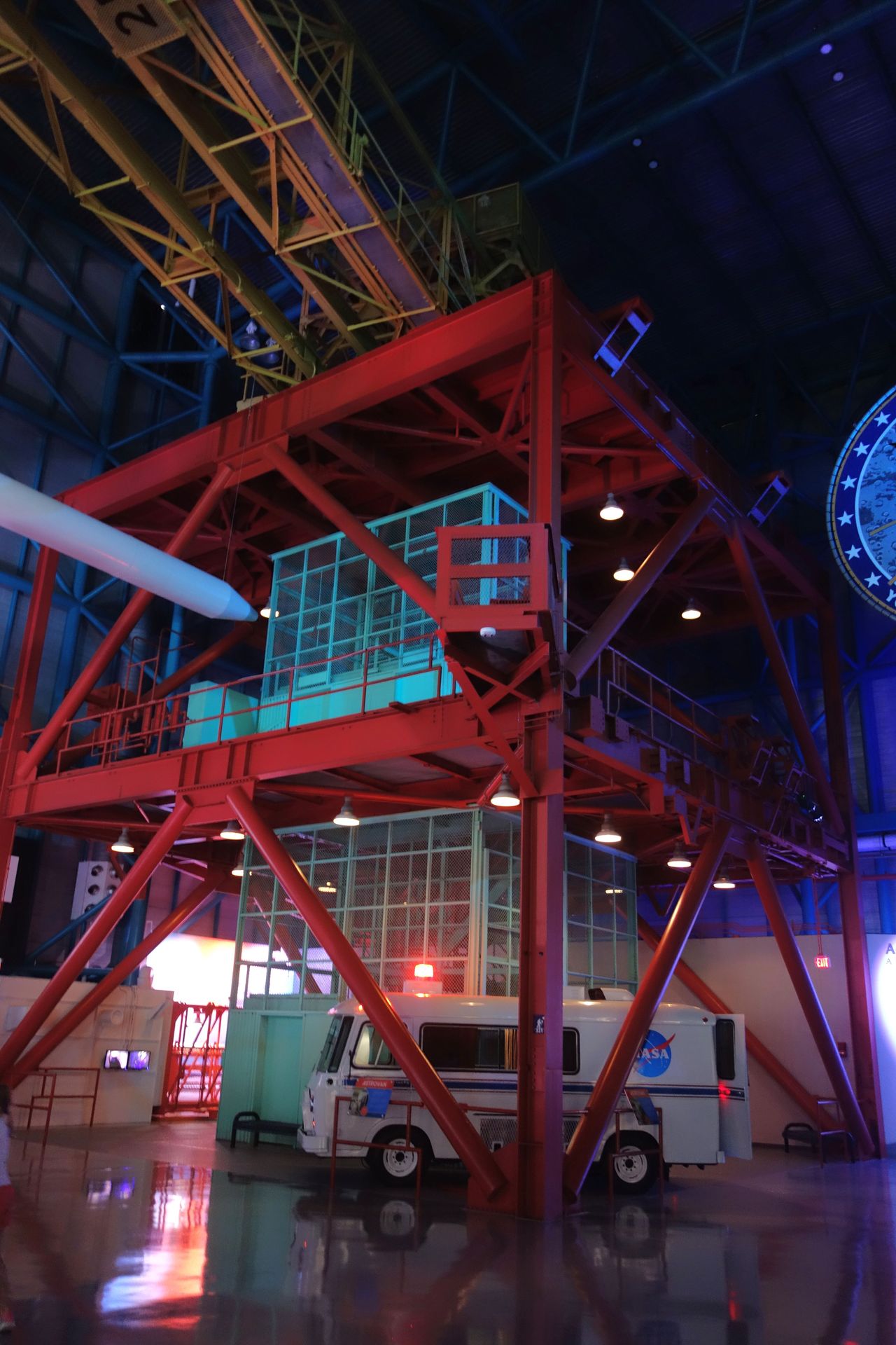 Untendrunter parkt der Astrovan, mit dem die Apollo-Astronauten zur Startrampe gefahren wurden.