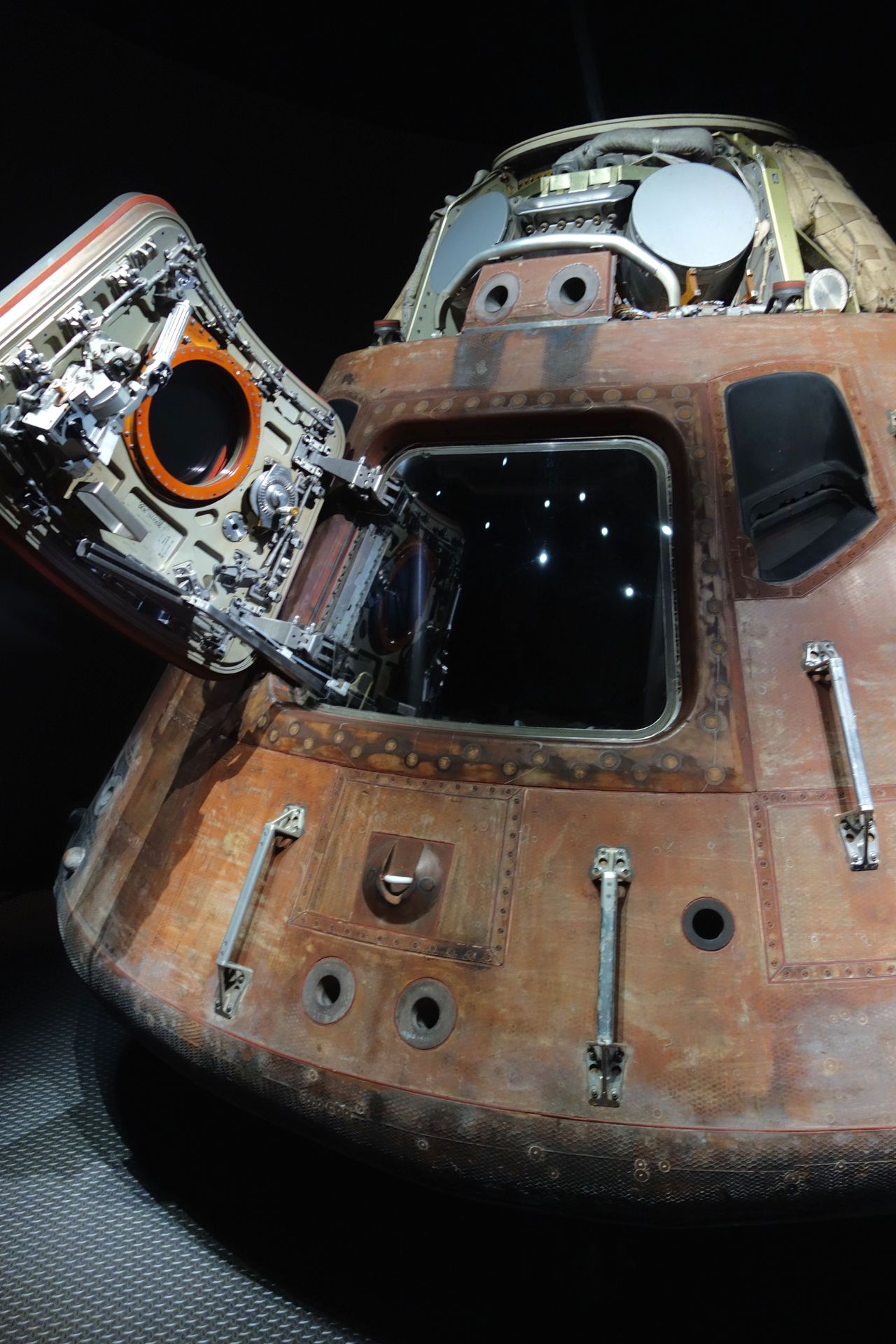 und das Command Module Kitty Hawk, welches Apollo 14 zum Mond brachte und dem man die enorme Belastung beim Wiedereintritt ansehen kann.