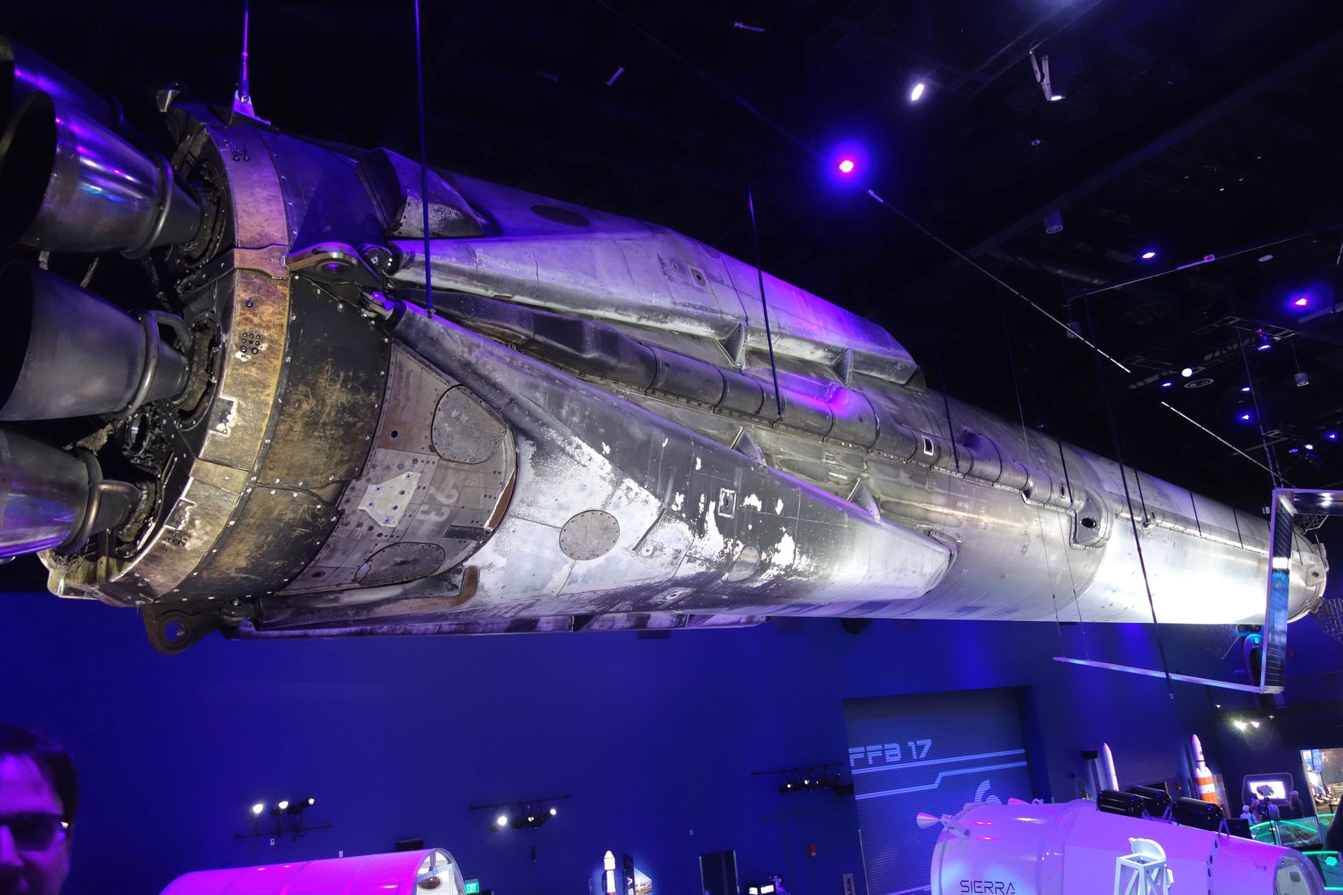 Der an der Decke hängende Booster mit der Nummer B1023 war sogar schon zweimal im All. Einmal als Erststufe einer Falcon 9 im Jahr 2019.