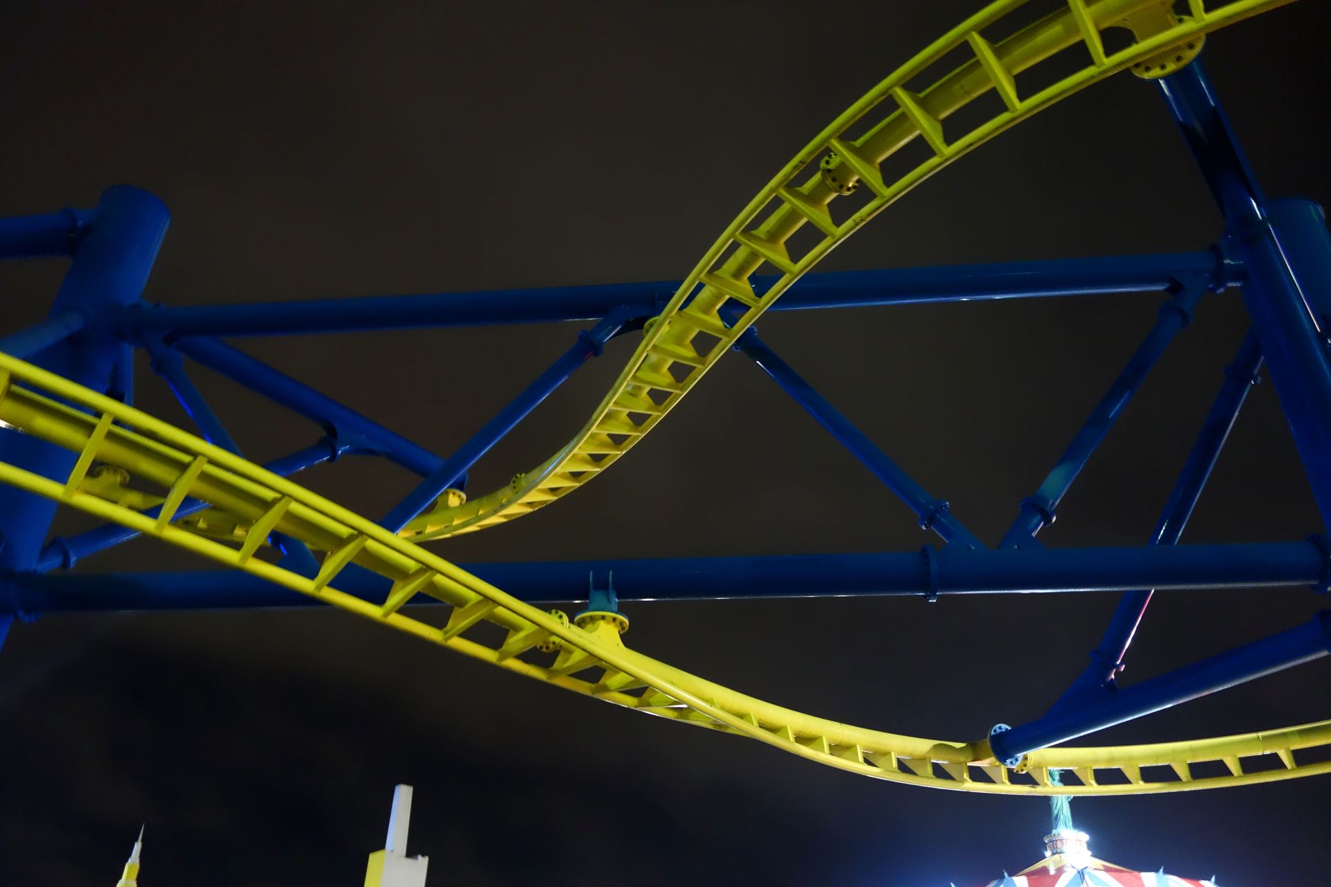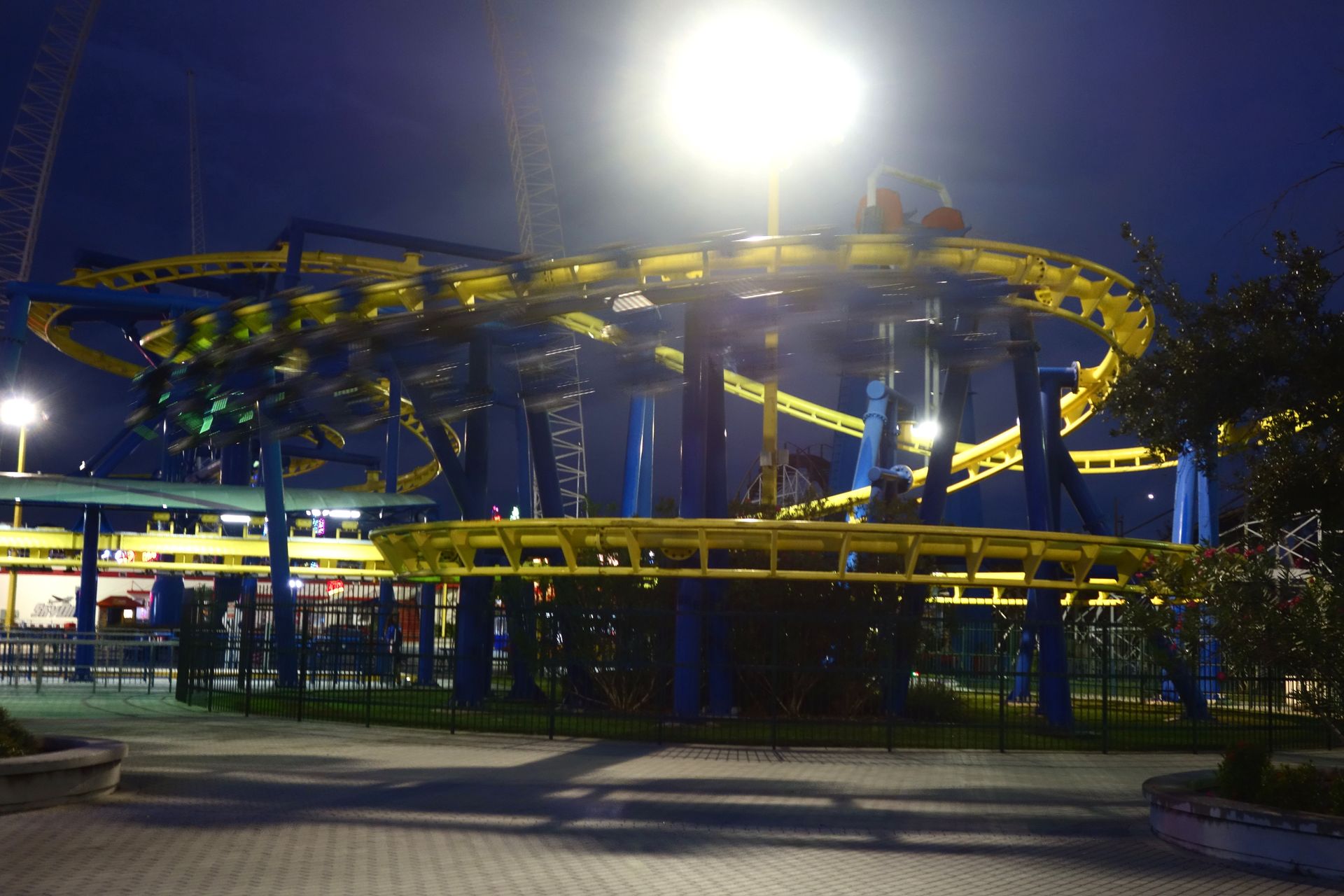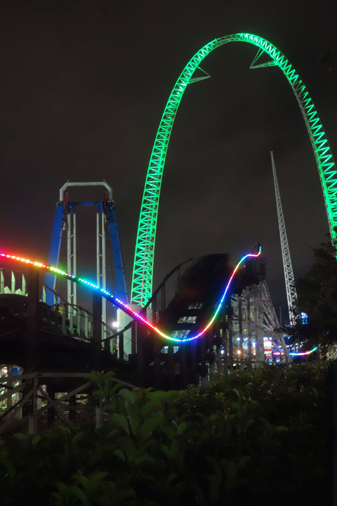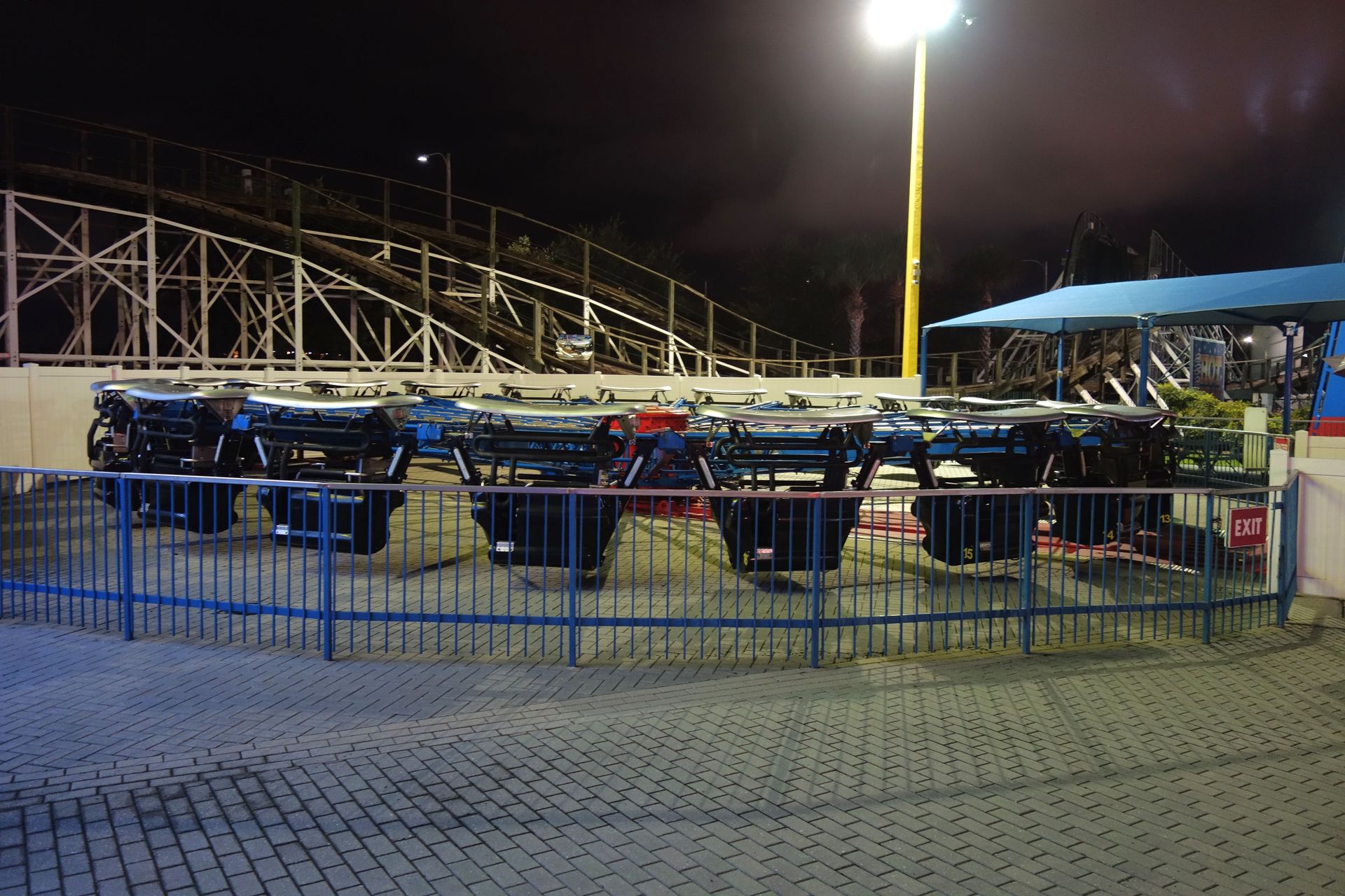 Helix, die blaue Conquest und die rote Thrasher, wobei letztere als einzige komplett ebenerdig verläuft. Laut des Mitarbeiters war allerdings nur noch eine der anderen Bahnen geöffnet. Ich weiß allerdings nicht mehr, welche beiden Bahnen an diesem Abend geschlossen waren.