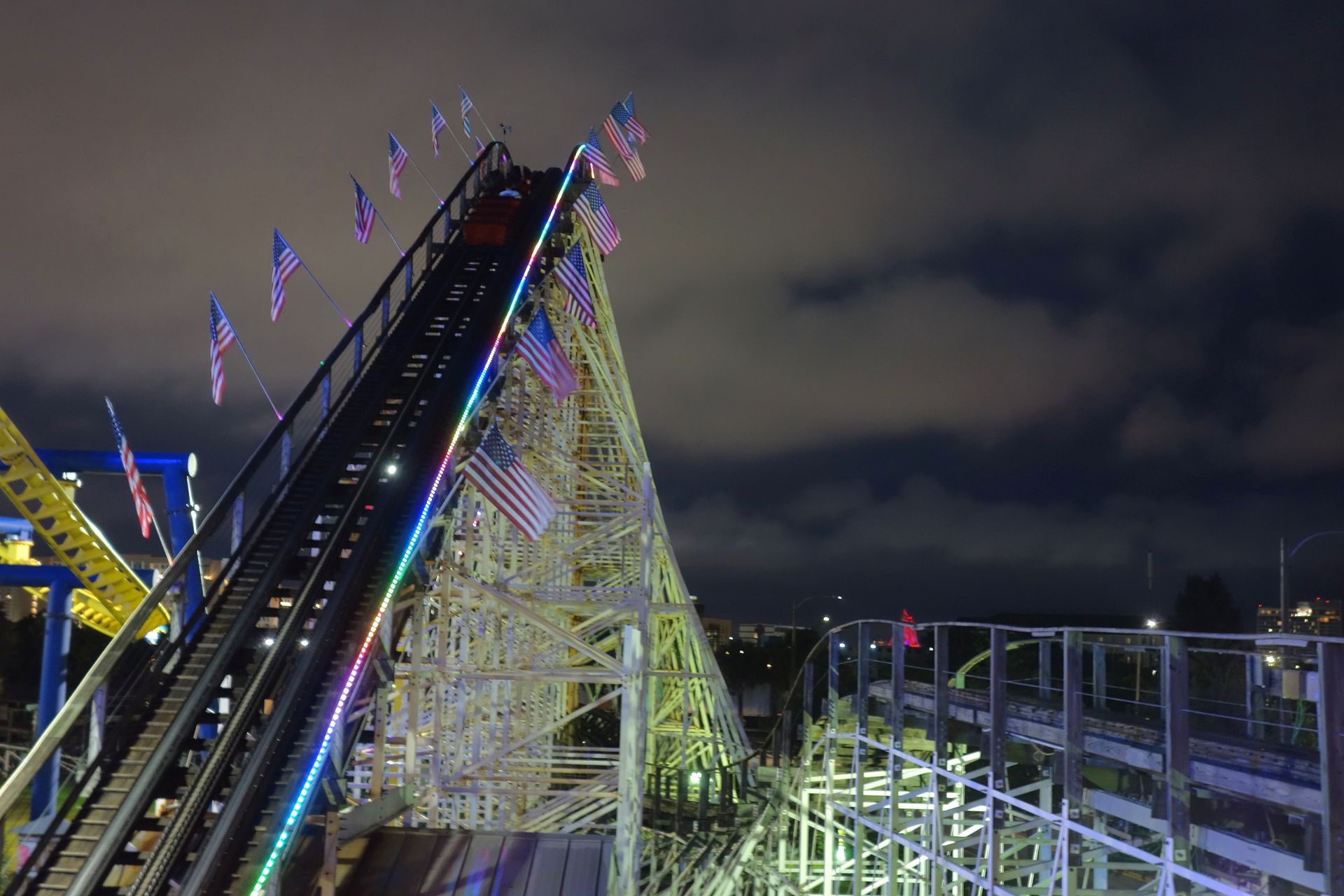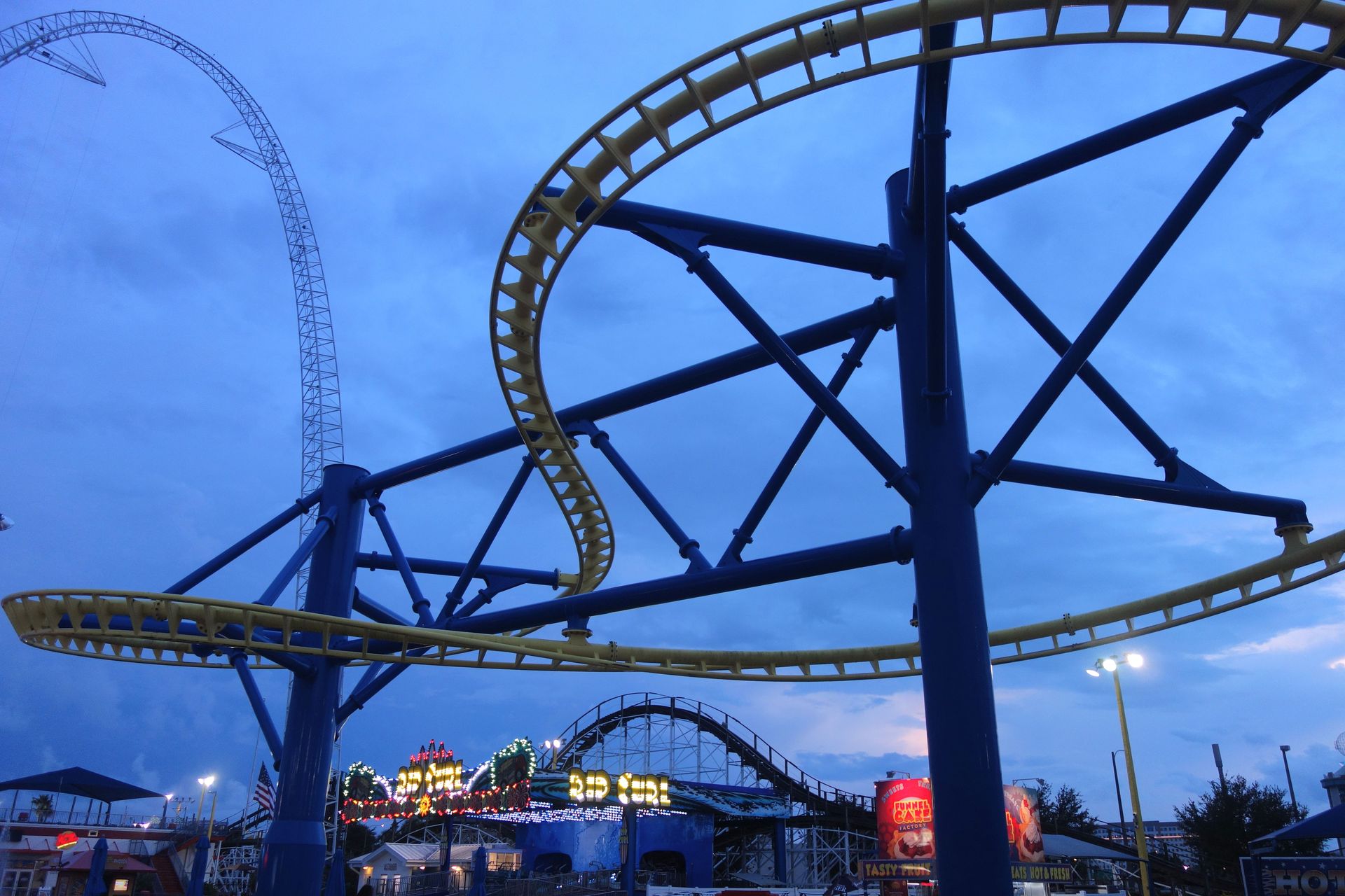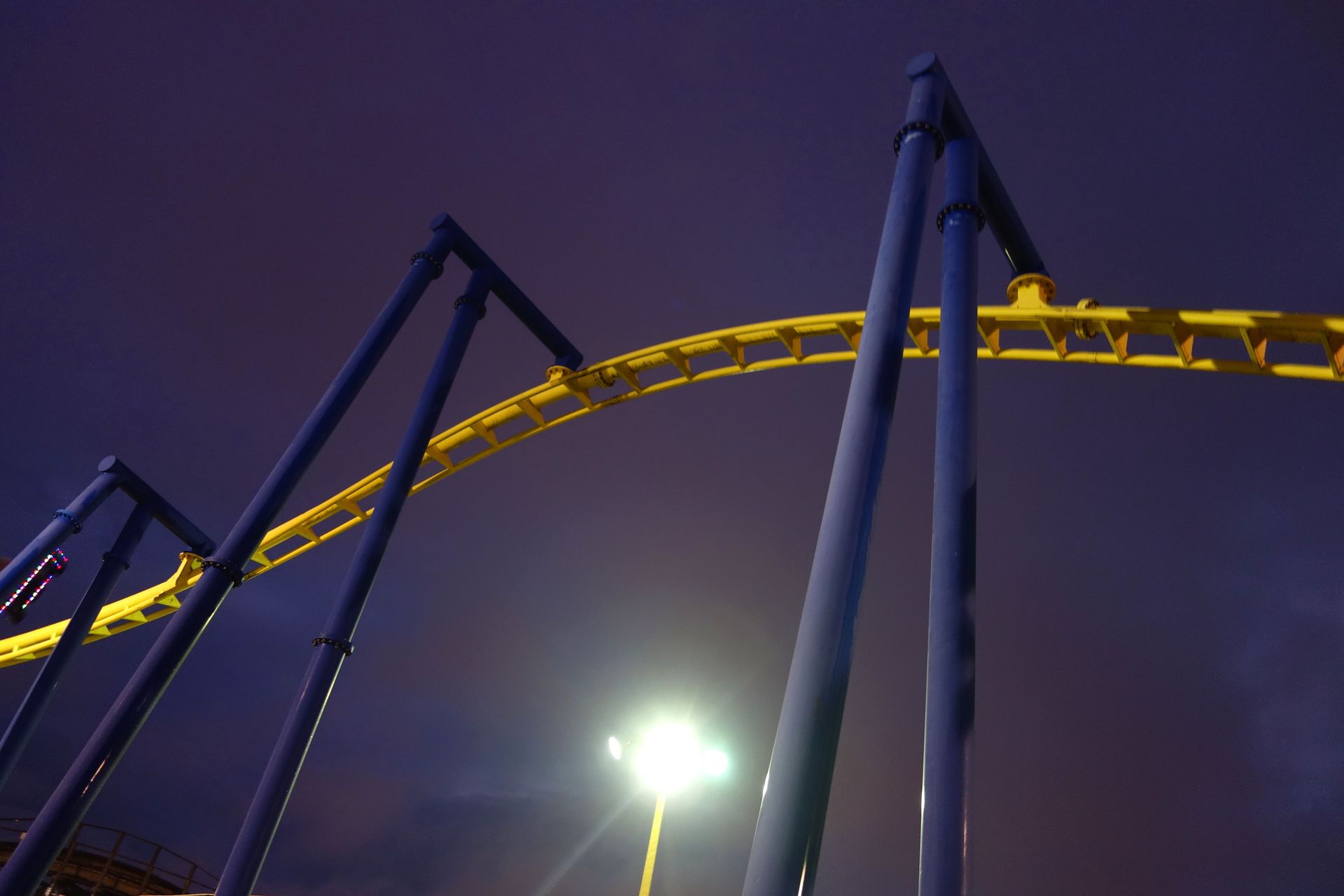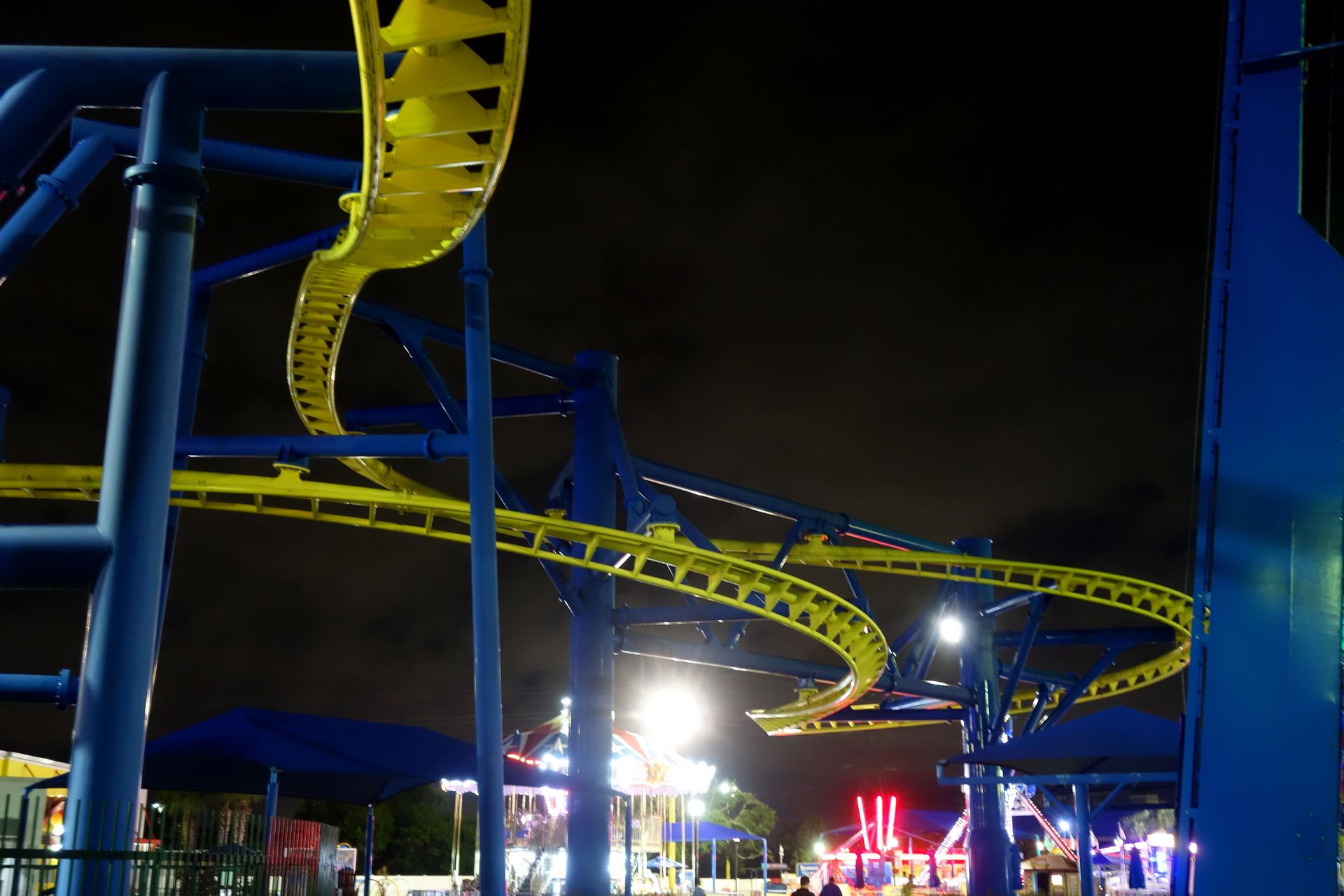 Helix, die blaue Conquest und die rote Thrasher, wobei letztere als einzige komplett ebenerdig verläuft. Laut des Mitarbeiters war allerdings nur noch eine der anderen Bahnen geöffnet. Ich weiß allerdings nicht mehr, welche beiden Bahnen an diesem Abend geschlossen waren.