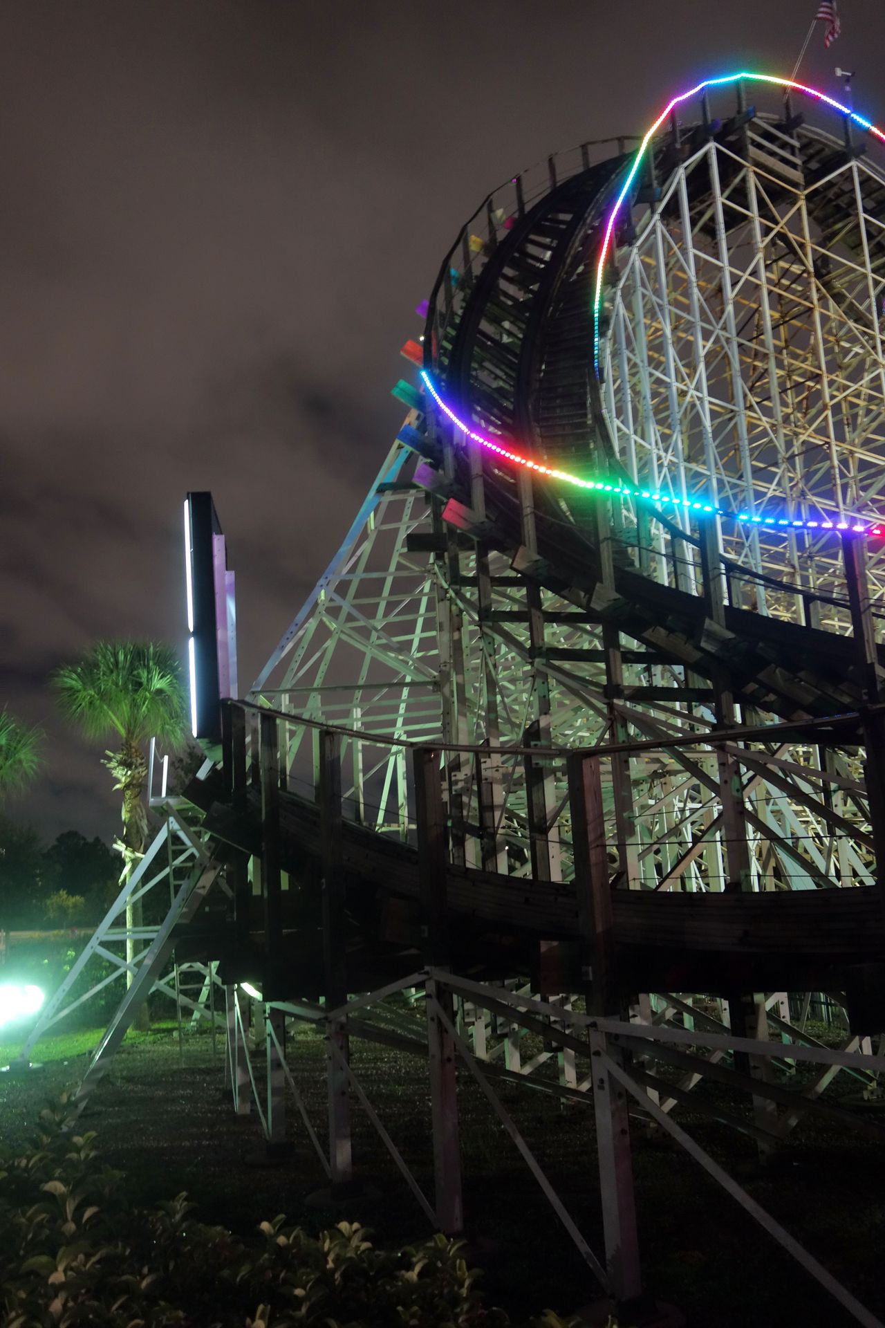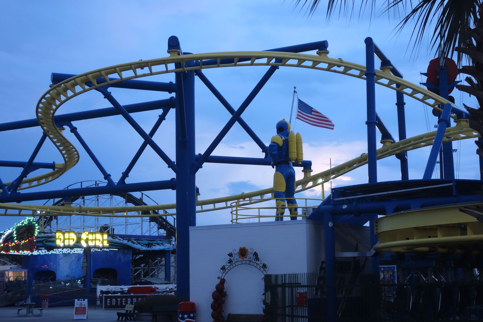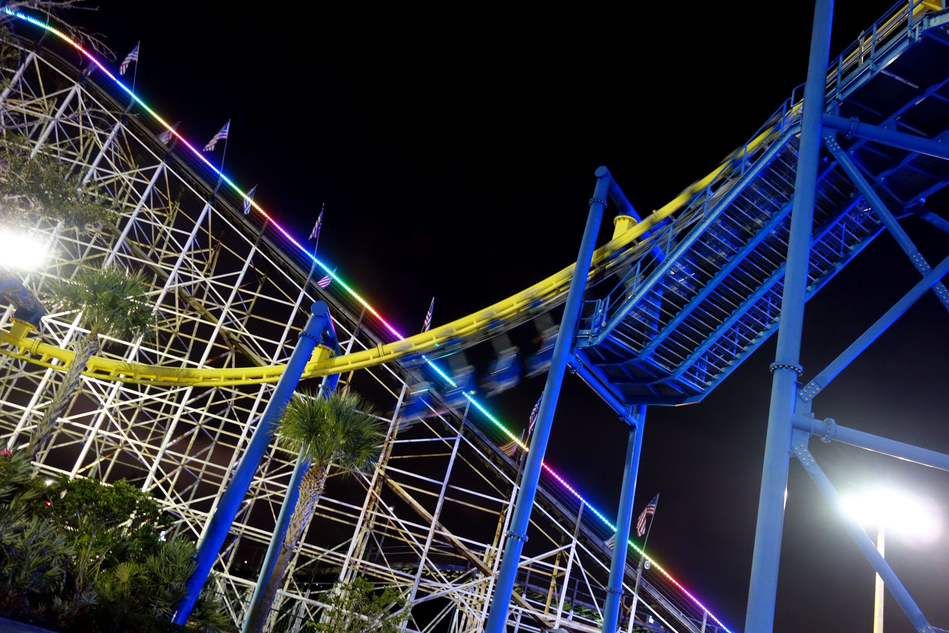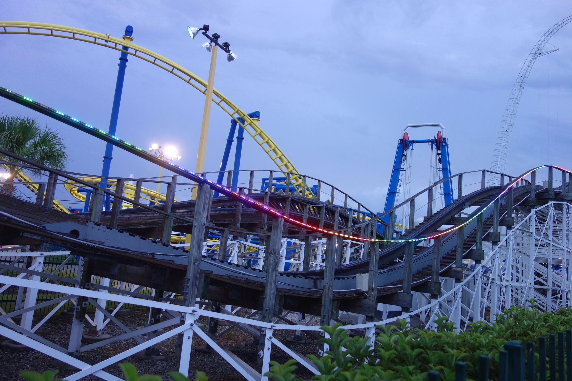 Bei diesem kurzen Stück auf White Lightning, war ein Unterschied in den Fahreigenschaften nicht wirklich festzustellen. Ehe man da hätte etwas merken können, war man ja schon wieder auf der alten Schiene. Mit den drei Achterbahnen hatte ich schon Fahrten im Wert von 31 Dollar absolviert (Einzelfahrten hätten 7 Dollar für Sea Serpent und je 12 Dollar für Freedom Flyer und White Lightning gekostet). Auch wenn die Fun Spots in der Regel bis Mitternacht geöffnet sind, musste ich den Besuch des zweiten Parks bei einsetzender Dunkelheit mangels Mitfahrern endgültig absagen und auf den übernächsten Tag verschieben.