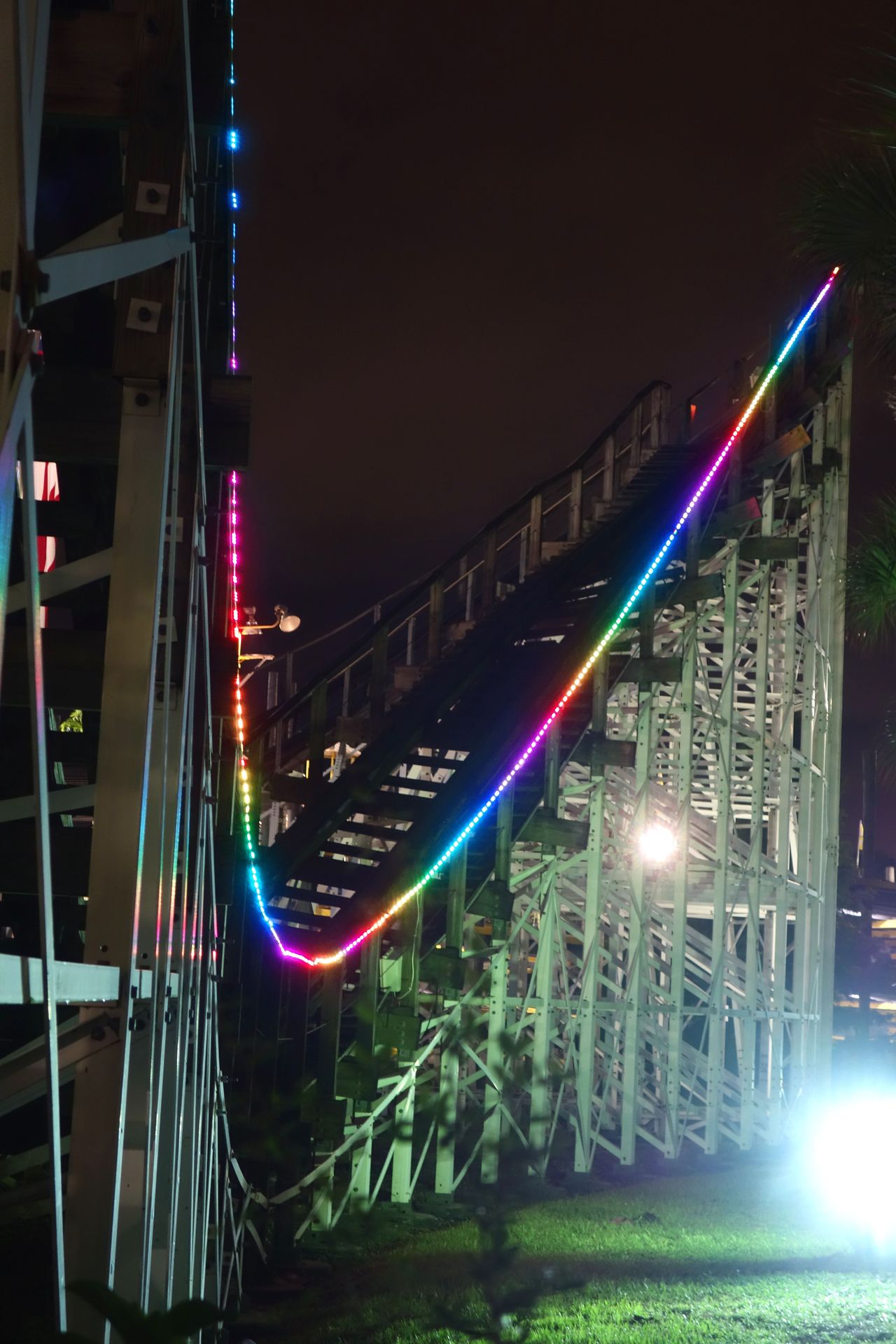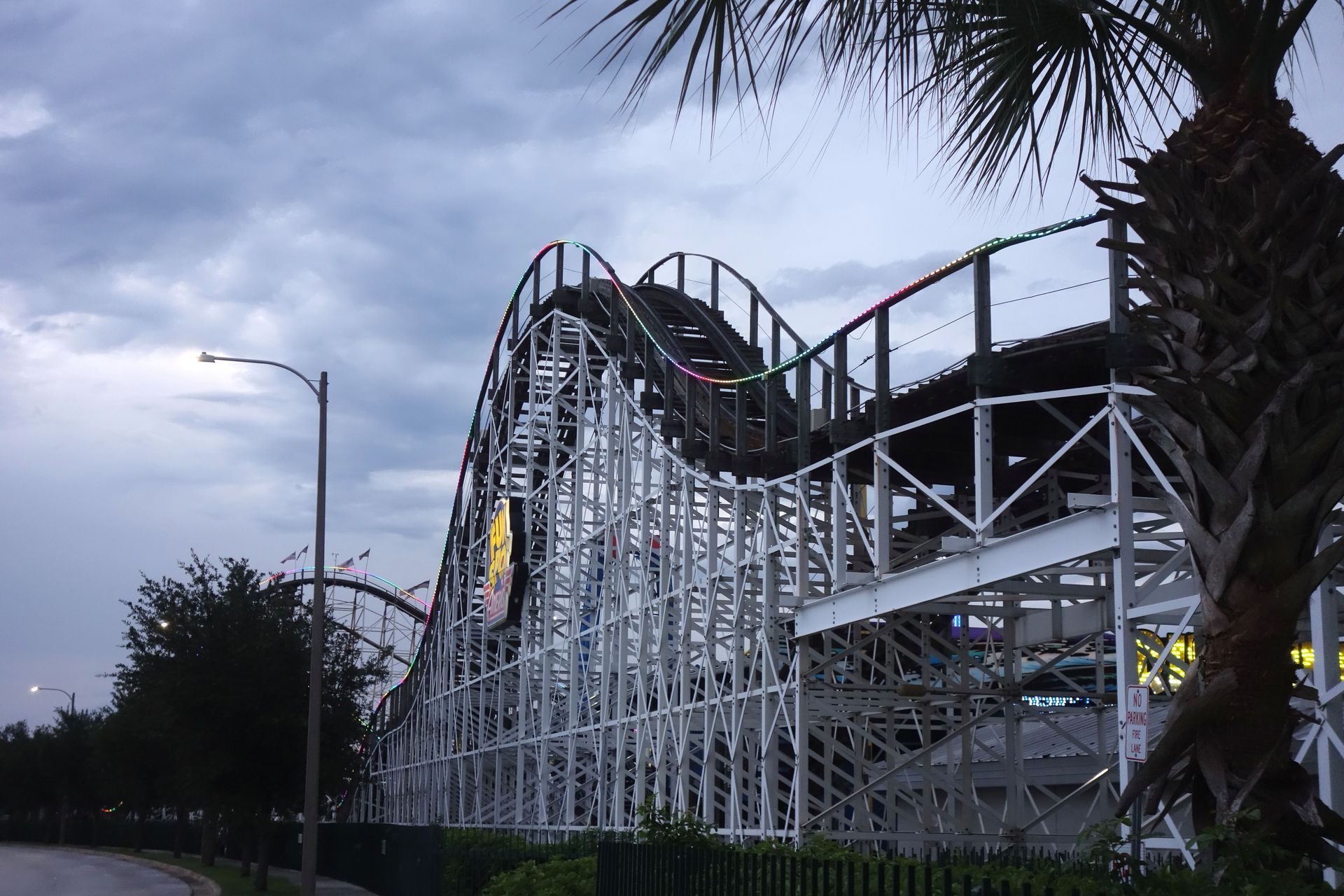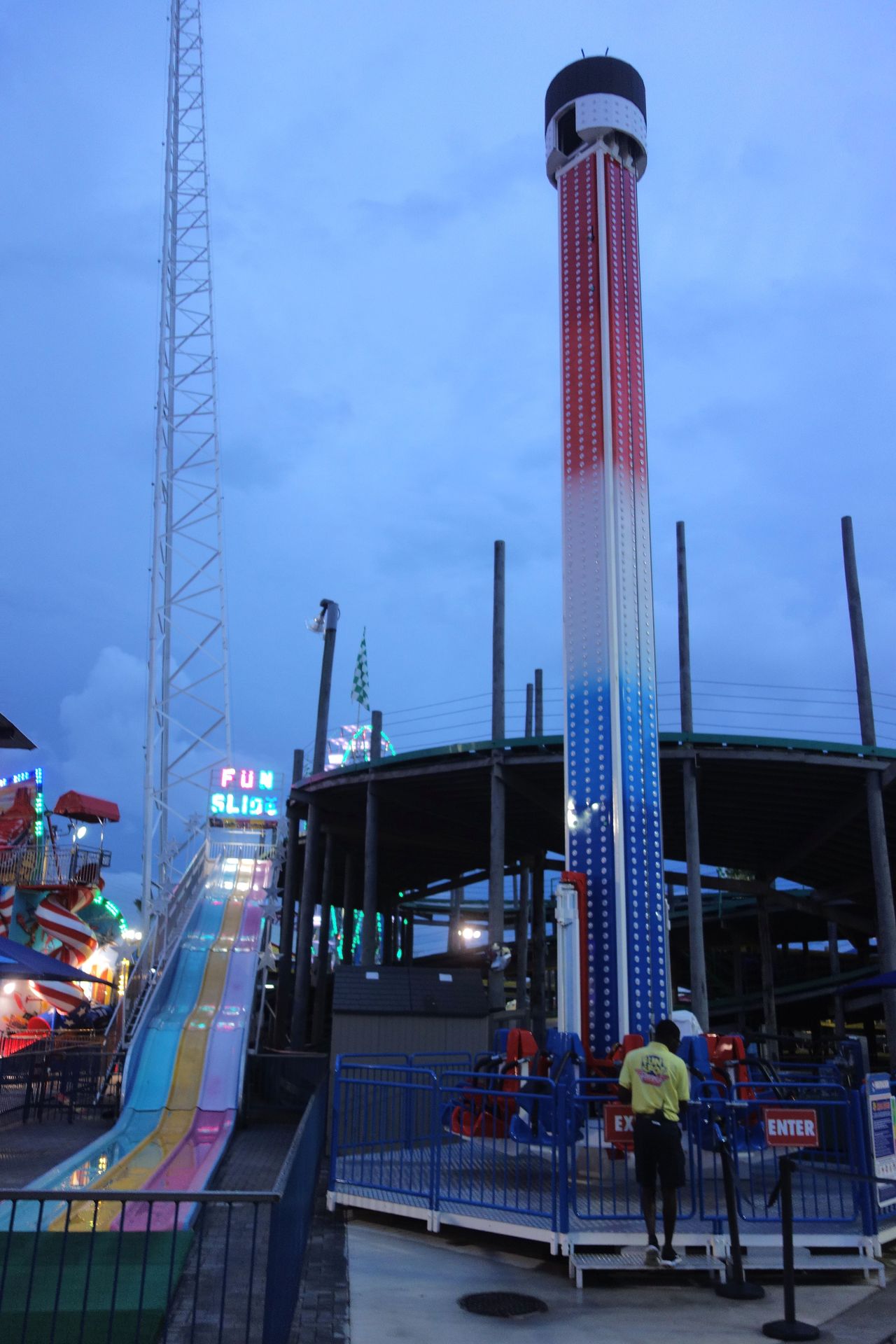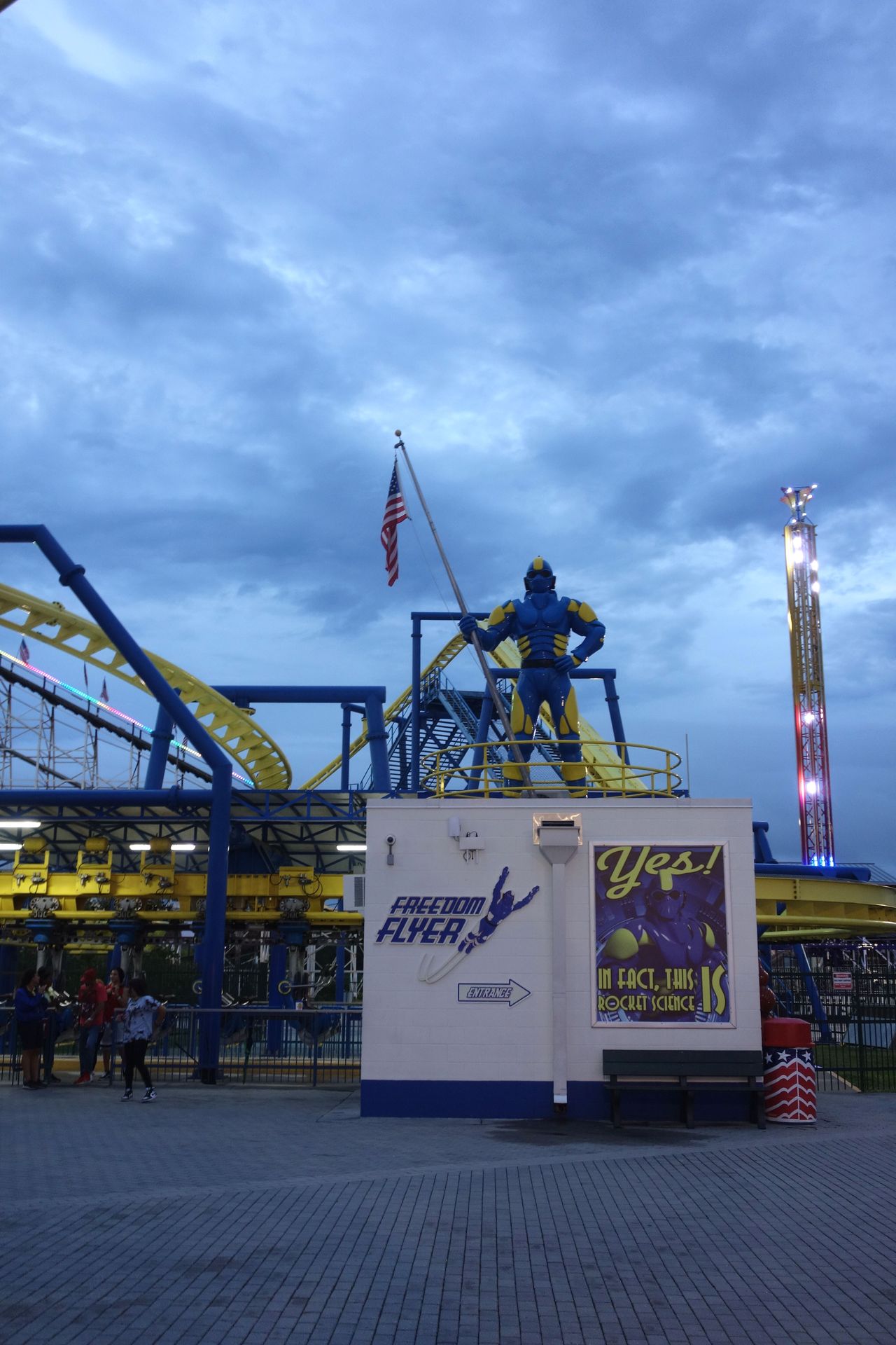 Bei diesem kurzen Stück auf White Lightning, war ein Unterschied in den Fahreigenschaften nicht wirklich festzustellen. Ehe man da hätte etwas merken können, war man ja schon wieder auf der alten Schiene. Mit den drei Achterbahnen hatte ich schon Fahrten im Wert von 31 Dollar absolviert (Einzelfahrten hätten 7 Dollar für Sea Serpent und je 12 Dollar für Freedom Flyer und White Lightning gekostet). Auch wenn die Fun Spots in der Regel bis Mitternacht geöffnet sind, musste ich den Besuch des zweiten Parks bei einsetzender Dunkelheit mangels Mitfahrern endgültig absagen und auf den übernächsten Tag verschieben.
