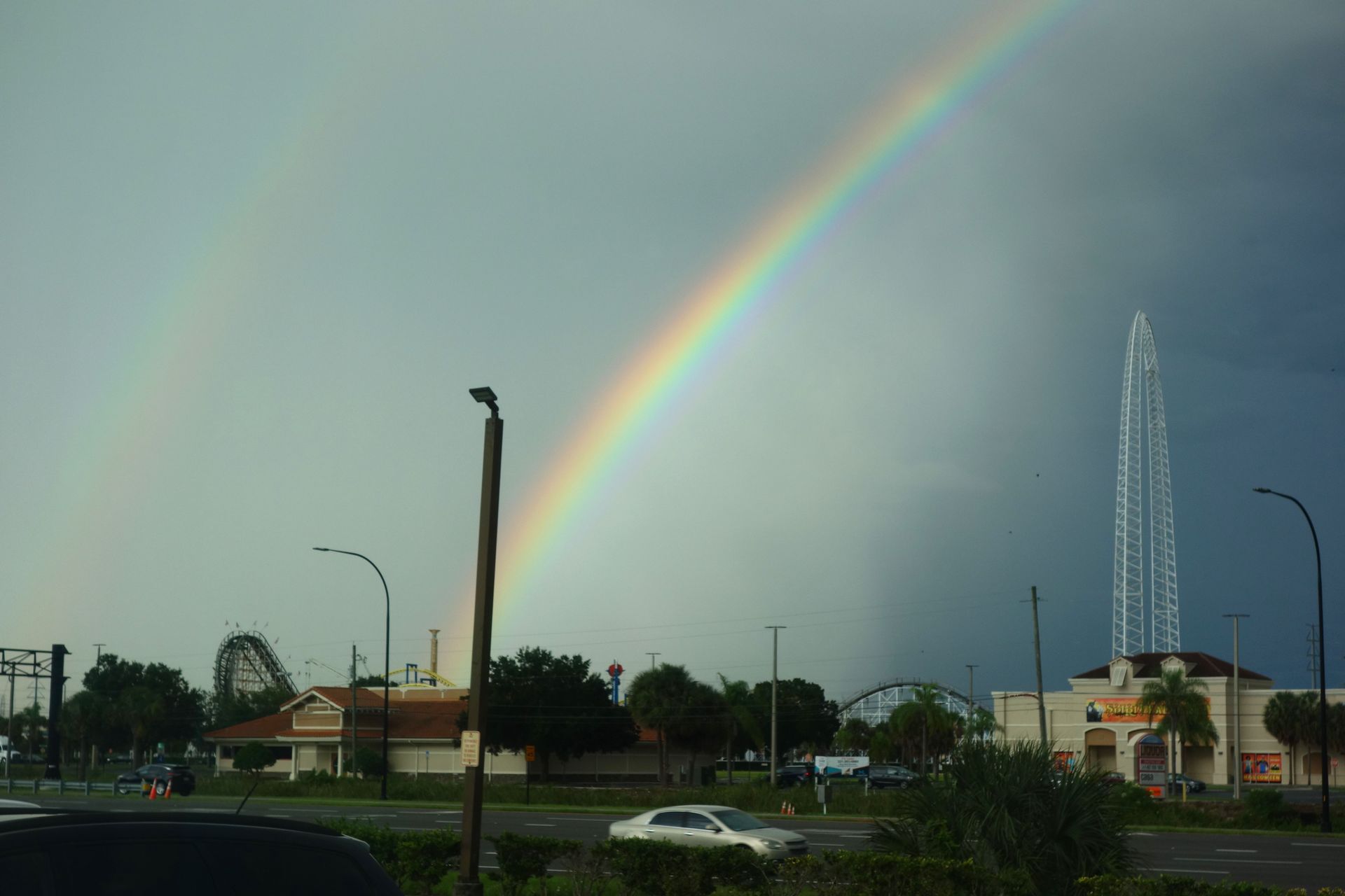 Nach dem morgendlichen Besuch im Wasserpark Volcano Bay sollte es am Nachmittag eigentlich in die beiden Fun Spots gehen. Über Get your Guide hatte ich mir im Voraus ein Wristband für rund 44€ statt der regulären fast 59€ besorgt. Für überschaubare 10 Dollar extra sollte dieses wohl am gleichen Tag auch am zweiten Standort freigeschaltet werden können. Doch das Wetter machte mir wie schon angedeutet einen gehörigen Strich durch die Sparfuchs-Rechnung. Kaum im Hotel angekommen, fing es an zu regnen, im Gruppenchat wurde bereits vermeldet, dass die Attraktionen im Fun Spot den Betrieb eingestellt hätten. So blieb uns nichts anderes übrig, als buchstäblich auf besseres Wetter zu warten. Praktischerweise bot unser Zimmer direkten Blick auf den Luftlinie knapp 400 Meter entfernten Fun Spot-Ableger in Orlando.