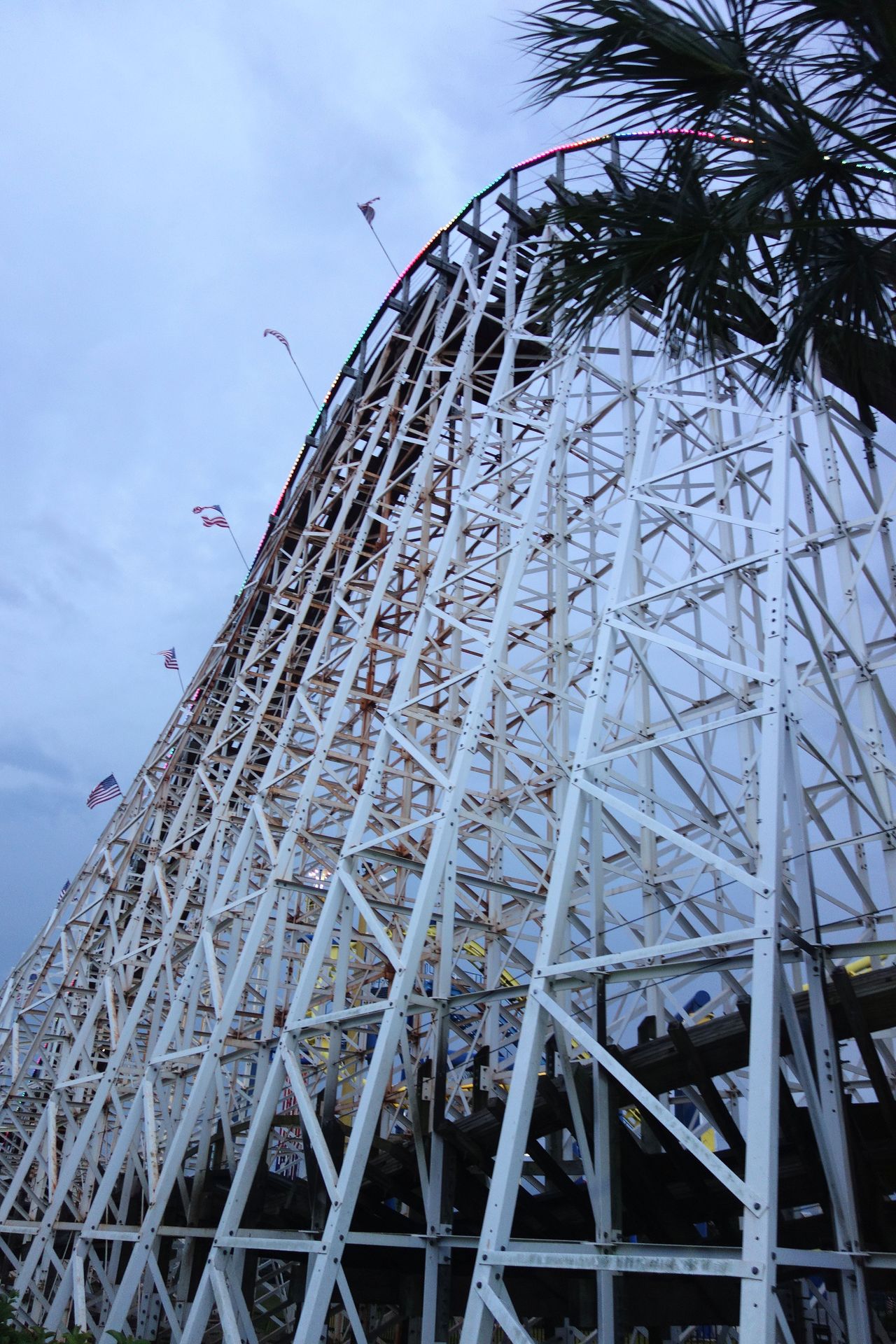 In einem L führt die 21 Meter hohe und 614 Meter lange Strecke am nordwestlichen Parkrand entlang. Gebaut wurde der Hybrid Coaster (Holzschienen auf Stahlstützen) von
