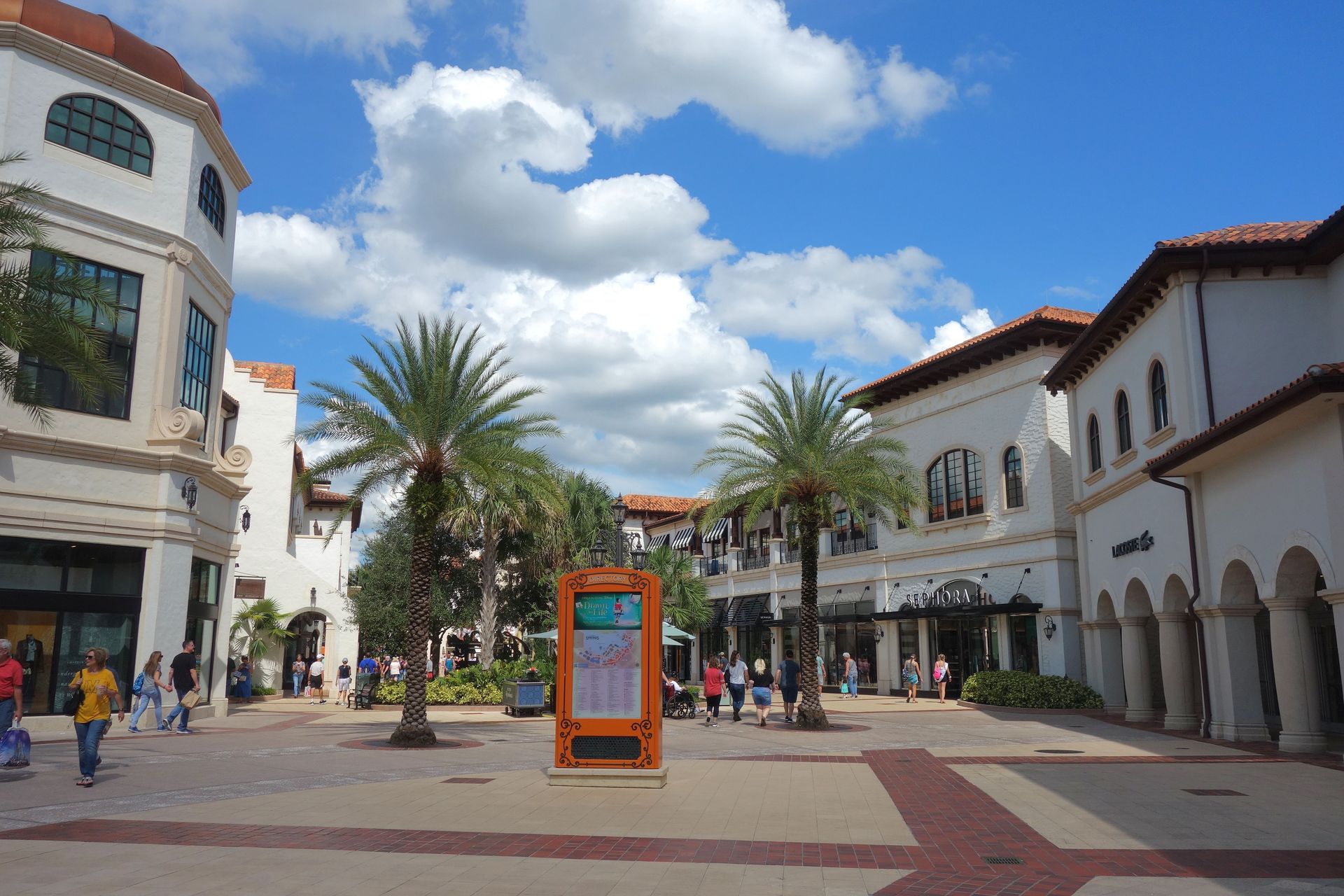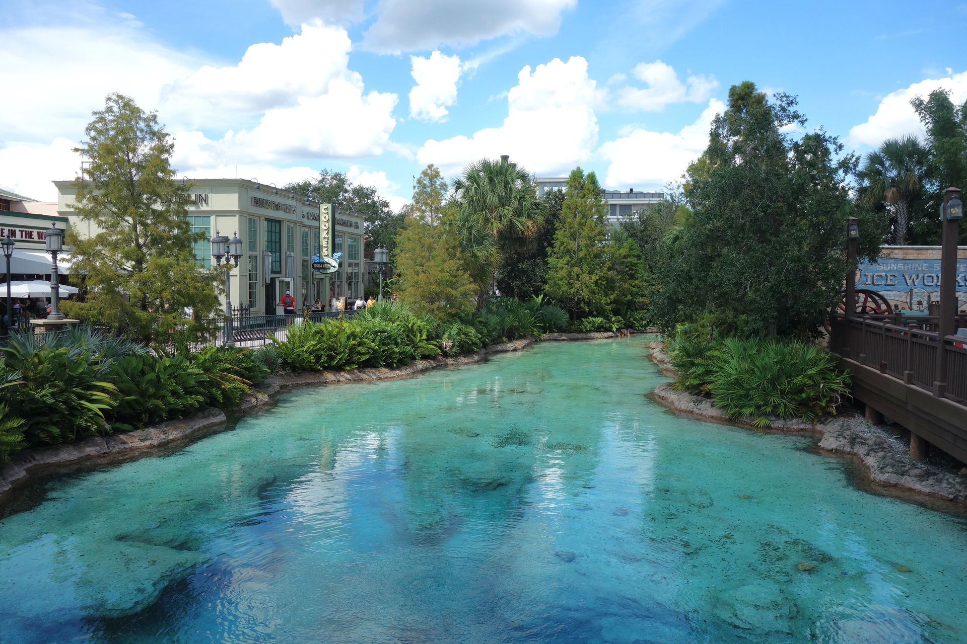 Eröffnet im Jahre 1975 sollte der Bereich dafür sorgen, dass die Besucher in der Disney World bleiben, statt Abends in der Umgebung nach anderweitigen Vergnügungen zu suchen. Neben diversen Namenswechseln gab es im Laufe der Jahre natürlich auch einige Umbauten und Erweiterungen, sodass Disney Springs heute auf einer Fläche von fast 500.000 Quadratmetern vier verschiedene "Themenbereiche" - man könnte auch sagen Viertel - umfasst. Mit dem Bus landet man quasi direkt im Town Center, welches im spanischen Kolonialstil der 1920er-Jahre erstrahlt. An der Bushaltestelle sprach mich ein Mitarbeiter an und erklärte, dass ich irgendwie da hinten um die Ecke und dann auf der anderen Seite der Absperrung wieder zurückkommen sollte. Ich habe keine Ahnung, ob es da um eine Taschenkontrolle gehen sollte, oder das einfach nur die Wegbeschreibung für den Umstieg in einen anderen Bus war.