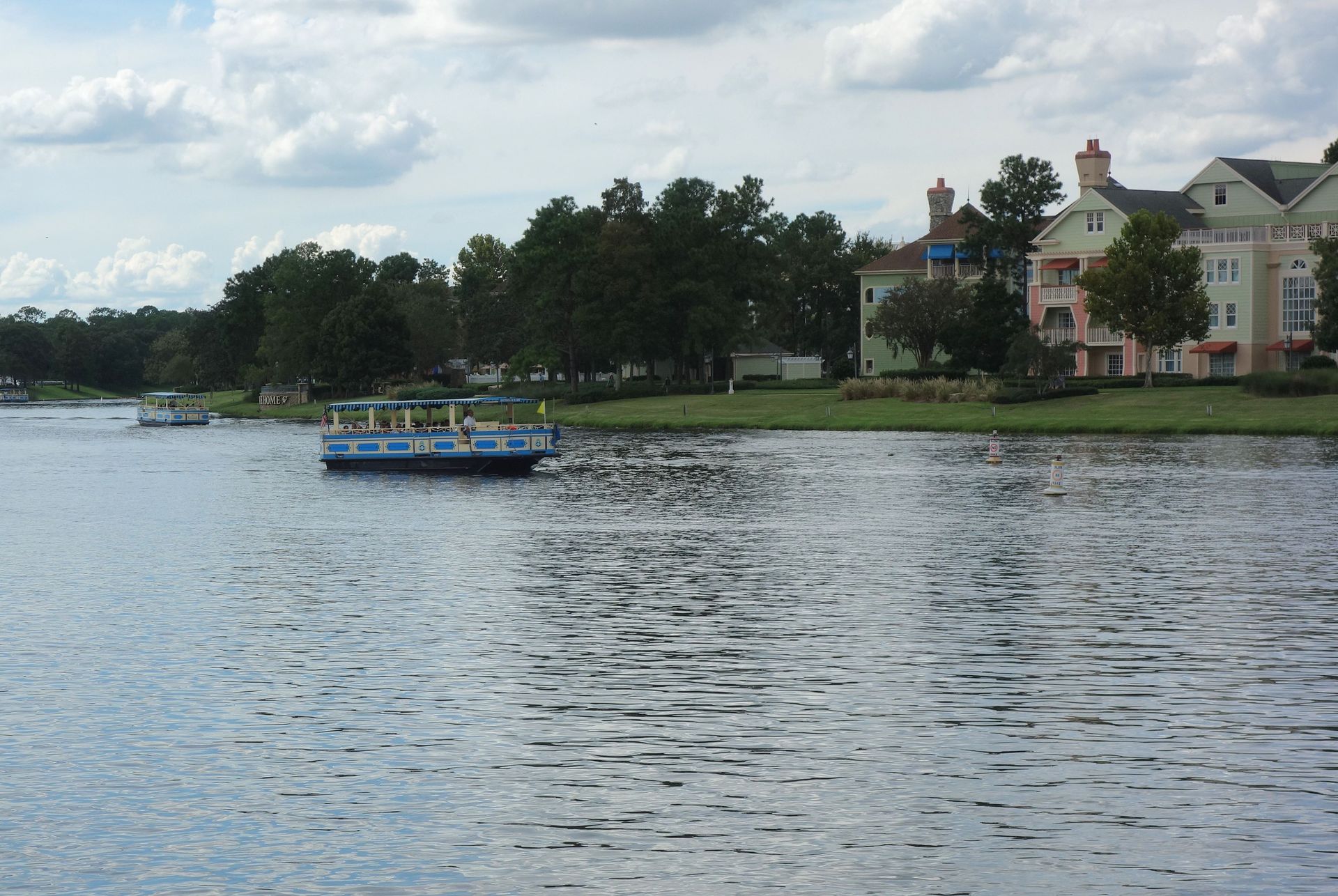 Die Wassertaxis verkehren von dort auf verschiedenen Linien zum weiter entfernten Teil des Saratoga Springs Resort, zum Port Orleans Resort und zum Old Key West Resort. Wie im entsprechenden Bericht kurz erwähnt, verkehren auch zwischen Epcot, den Hollywood Studios und den angrenzenden Hotels solche Wassertaxis und natürlich gelangt man auch von den Hotels rund um die Seven Seas Lagoon auf dem Wasserweg zum Magic Kingdom. Ich finde, man hätte die Kanäle ruhig ausweiten und verbinden können, sodass das gesamte Resort per Wassertaxis hätte erschlossen werden können - ebenso wie die Monorail alle vier Parks (plus Wasserparks und Disney Springs) hätte verbinden müssen. Grundsätzlich ist der Transport innerhalb der Disney World zwar gut organisiert und immerhin kostenfrei. Aber es nervt dann doch etwas, wenn man ständig umsteigen muss und dann teils eine gefühlte Ewigkeit auf den richtigen Bus warten muss. Im Falle des Wassertaxis war mir das Ziel relativ egal, ich musste letztlich ja nur zu irgendeinem Resorthotel, von dem aus ich per Bus zu den Hollywood Studios weiterfahren wollte. Da traf es sich ganz gut, dass gerade ein Boot anlegte, dessen Kapitän sich offenbar in Ausbildung befand. Man hatte also keine feste Linie zugeteilt, sondern fragte die wartenden Besucher einfach, wo sie denn hinwollen würden. So wurde dann nach kurzer Routenplanung verkündet, dass man nun über Saratoga Springs zu Old Key West fahre und Besucher mit diesen Zielen gerne zusteigen sollten.