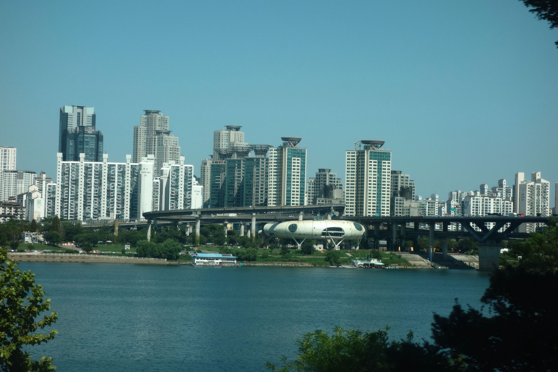 Das komische Ufo unter der Brückenrampe nennt sich übrigens J-Bug, weil es wohl der Form einer Mottenlarve ähnelt. Gelegen am Ttukseom Hangang Park handelt es sich um ein Kulturzentrum mit einem Café, einer Aussichtsplattform, einer Bücherei und Räumen für Meetings. Errichtet wurde es 2009.