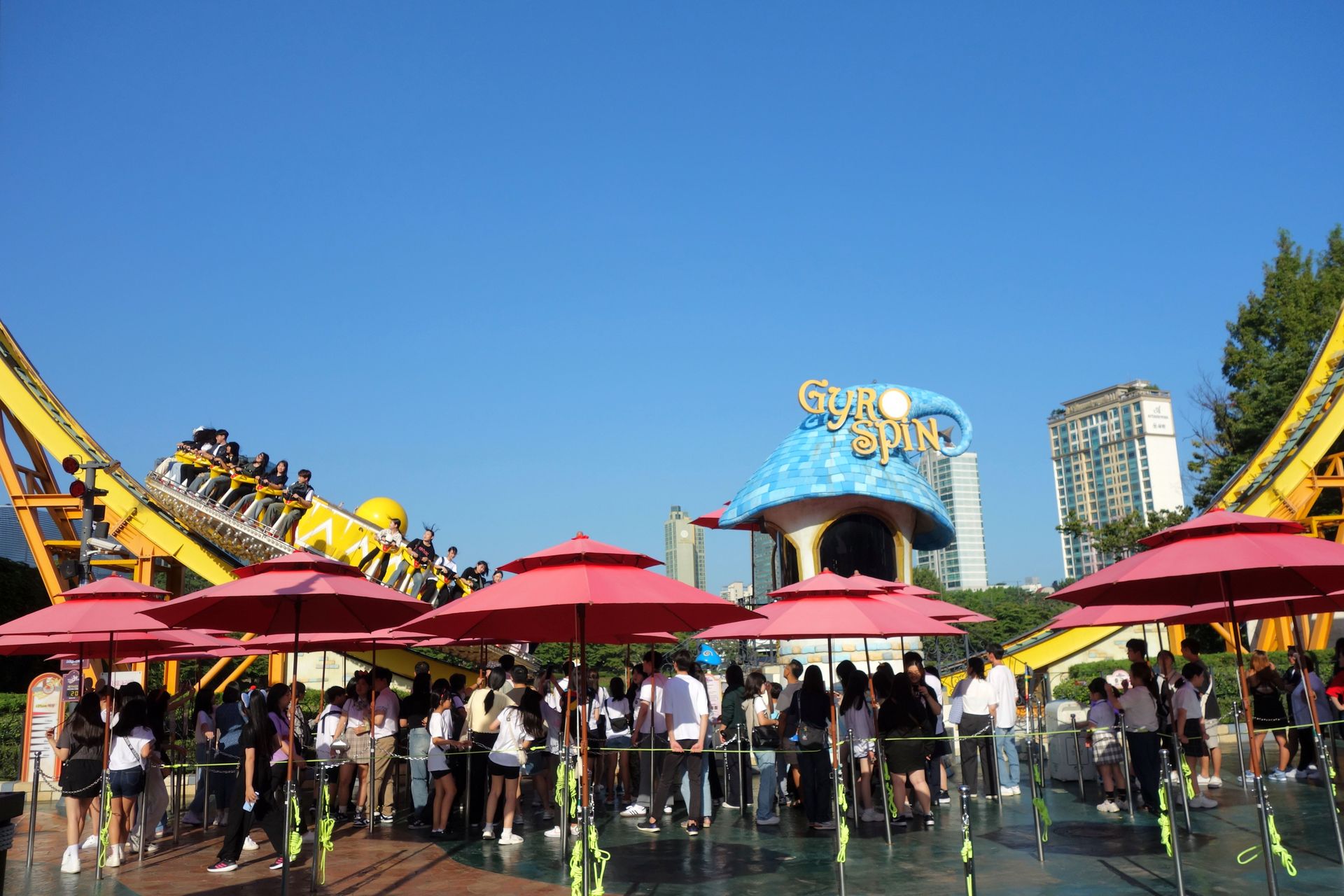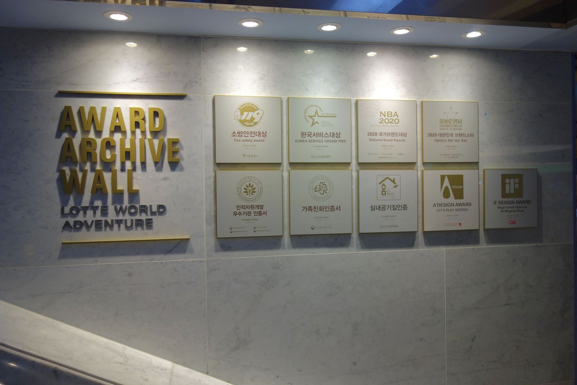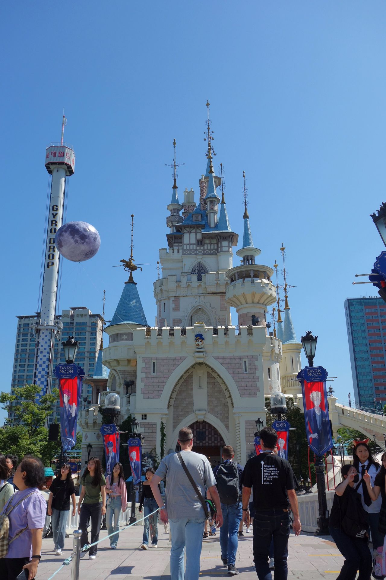 Für uns von Interesse ist natürlich die 1989 eröffnete Lotte World. Der Freizeitpark teilt sich den gigantischen Gebäudekomplex mit einem bereits ein Jahr zuvor eröffneten Einkaufszentrum, welches sich vorwiegend unterirdisch erstreckt und direkt an die Jamsil Station der U-Bahn angeschlossen ist, sowie einem Hotel. Anstelle eines ebenfalls zugehörigen Schwimmbads wurde 2010 die Kinderstadt KidZania eröffnet. Bei dem aus Mexiko stammenden Konzept können Kinder schonmal in das Leben der Erwachsenen hineinschnuppern und verschiedenste Berufe ausprobieren. Noch ehe der Komplex fertiggestellt war, begannen bereits die Planungen für Lotte World 2 auf dem Nachbargrundstück. Angedacht war ein 450 Meter hoher Wolkenkratzer, der jedoch nicht umsetzbar schien und zunächst auf 143 Meter reduziert wurde. Nachdem eine Finanzkrise das Projekt zwischenzeitlich komplett auf Eis gelegt hatte, stockte man 2002 wieder auf stolze 555 Meter auf. Der Spatenstich erfolgte 2006, jedoch erhielt der Turm keine Genehmigung, bis eine der beiden Runways der Seoul Air Base um 3° verlegt wurde, um Kollisionen auszuschließen. So startete der eigentliche Bau erst 2009. Die Lotte World Mall mit Kino und Aquarium öffnete schließlich 2014, der Lotte World Tower 2017. Passend zur Stellung des Unternehmens im eigenen Land handelte es sich bei Eröffnung um das fünfthöchste Gebäude der Welt, 2023 wurde der Lotte World Tower auf Platz 6 verdrängt. In Südkorea ist er natürlich mit deutlichem Abstand das höchste Gebäude. Die Aussichtsplattform in den obersten Stockwerken gehört ebenfalls zu den höchsten der Welt, unter jenen mit Glasboden belegt man mit 478 Metern sogar den Spitzenplatz. Leider hatten wir dafür jedoch keine Zeit...