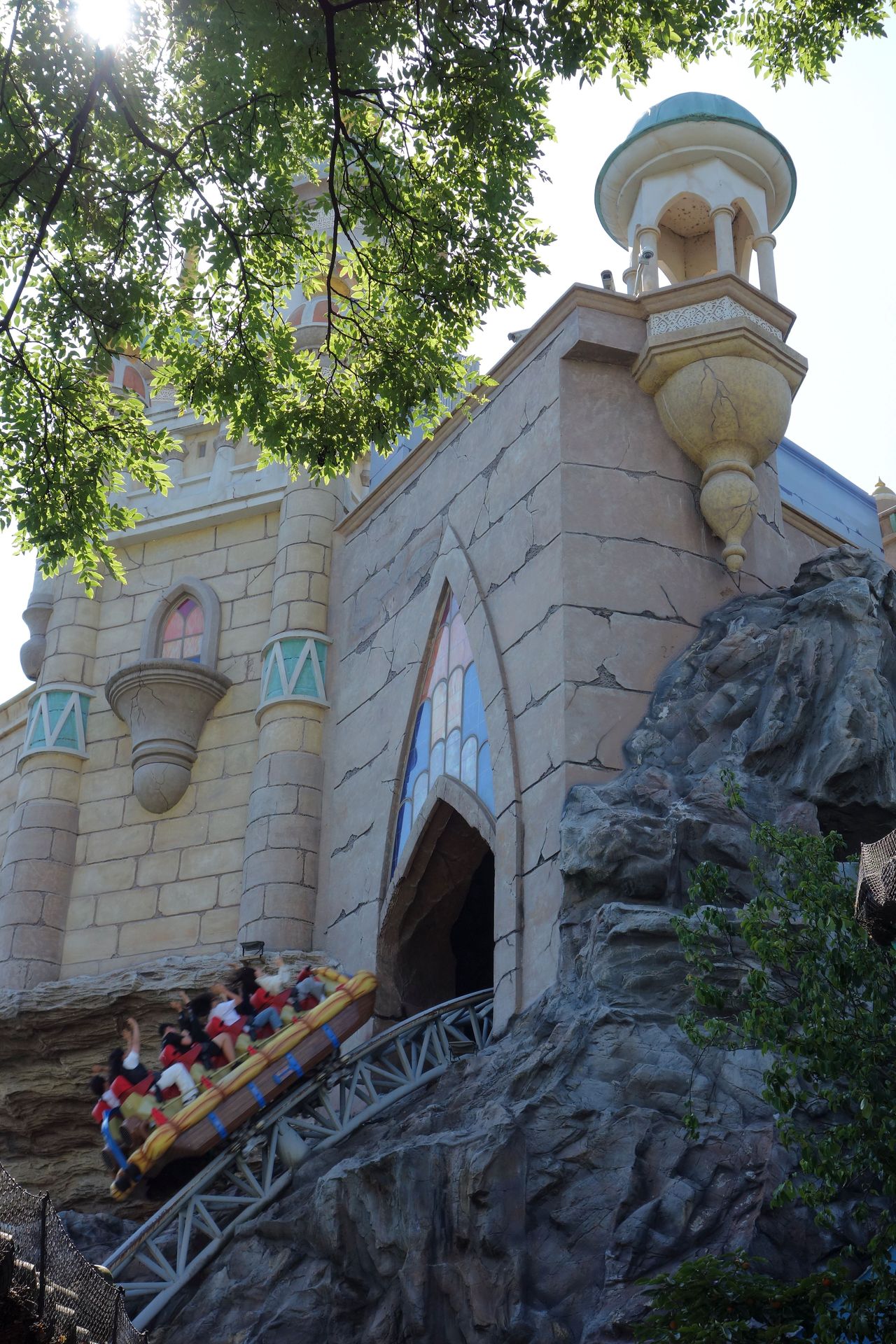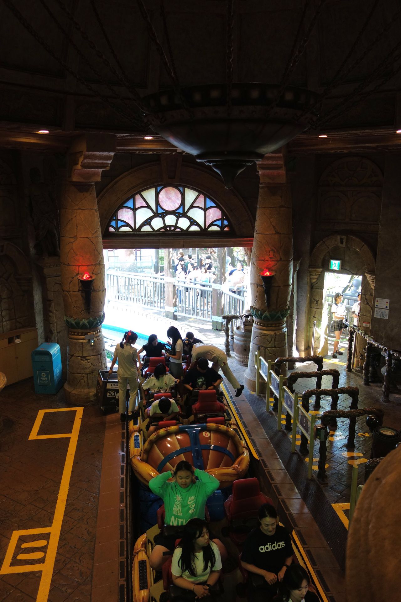Dank der 20-sitzigen Boote herrschte dort tatsächlich Walk-On, wir hatten das Boot sogar fast für uns alleine. Nach einer offenen Kurve in der Halle taucht man mit einem ersten Drop ins düstere Untergeschoss ab. Und kurz darauf folgt sogar noch eine zweite Abfahrt. Aus den ganz tiefen Katakomben geht es aber nach einigen Metern schon wieder ein Stück nach oben. Zurück auf Stationshöhe geht es natürlich erst ganz zum Schluss wieder, nach einer langen und unfassbar gut gestalteten Fahrt. The Adventures of Sinbad muss sich definitiv nicht vor Pirates und Konsorten verstecken. Da ist wirklich alles durchthematisiert, mir sind keinerlei unverkleidete Ecken oder gar offen herumhängende Scheinwerfer und dergleichen aufgefallen. Selbst die Öffnungen für die Belüftungsanlage und Lautsprecher wurden so gut es ging in die Kulissen eingearbeitet. Also rein von der Gestaltung her würde ich fast behaupten, dass ich noch keinen anderen Darkride gefahren bin, bei dem das so perfekt umgesetzt wurde - und zwar von vorne bis hinten. Gut, dafür hält sich die Zahl der Animatronics in Grenzen, aber die vorhandenen sind - auch in Anbetracht des Alters - absolut ausreichend. Besonders interessant fand ich den Kontrast zum Sindbad-Darkride in DisneySea. Obwohl die zugrunde liegende Geschichte quasi die gleiche ist, hat man bei Disney natürlich eine eher familienfreundliche, mit fröhlicher Musik untermalte Umsetzung gewählt, während sich in Lotte World die wohl realitätsnahere Atmosphäre mit dunklen Höhlen und furchteinflößender Geräuschkulisse durchgesetzt hat. Und beide gehören für mich zu den besten Darkrides der Welt, wobei die koreanische Variante in der Gesamtbetrachtung ehrlicherweise sogar die Nase vorne hat.