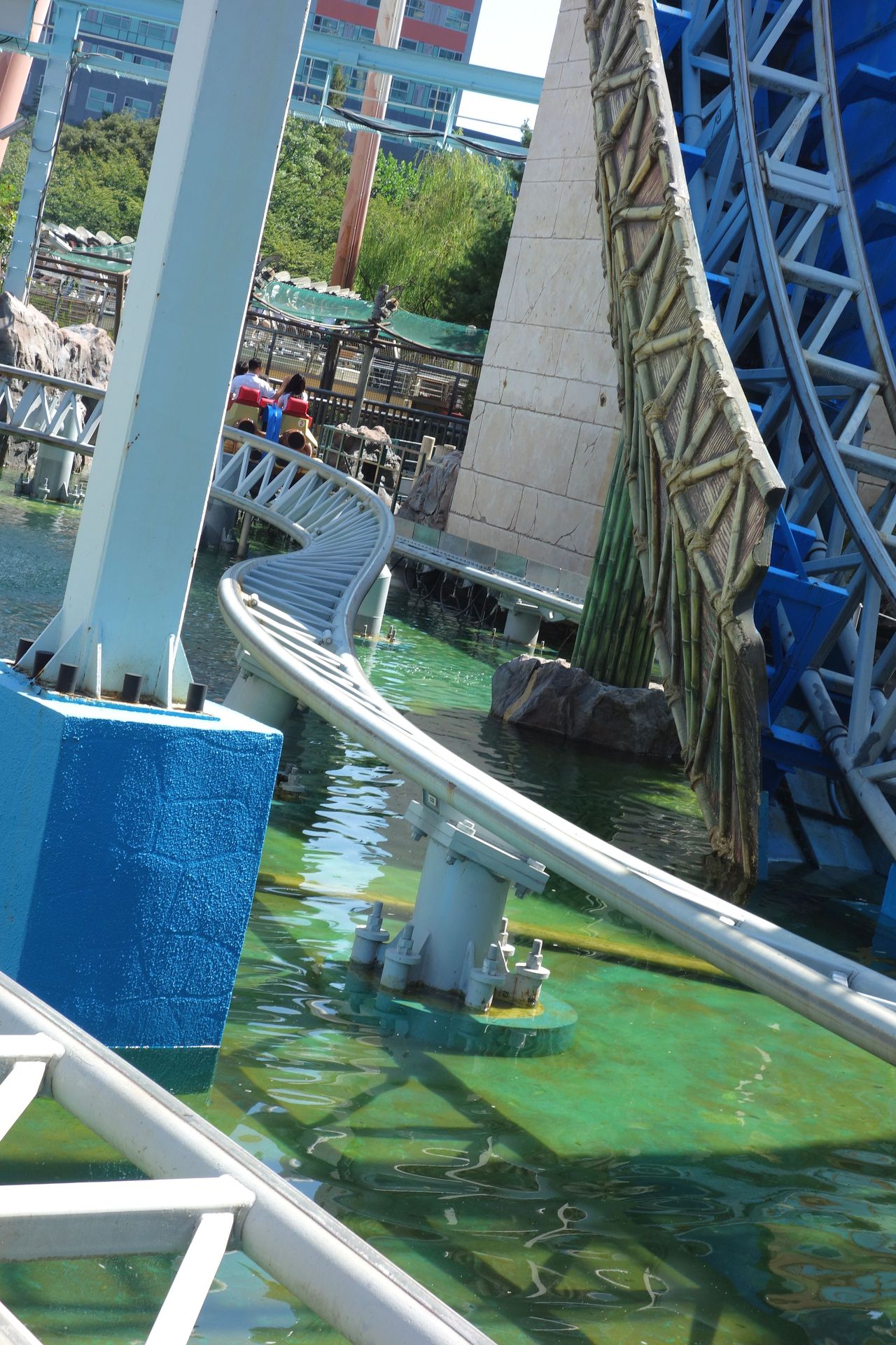 Wenn ich ganz ehrlich bin, habe ich den Hype um dieses Aqua-Trax-Konzept nie so wirklich verstanden. Letztlich handelt es sich ja doch nur um eine mehr oder weniger gewöhnliche Abschuss-Achterbahn, die an wenigen Stellen rein optisch an eine Wasserbahn erinnern soll - und das nichtmal besonders gut, da die Schiene eben deutlich über dem Wasser hängt. Nach wie vor bin ich der Meinung, dass man eine