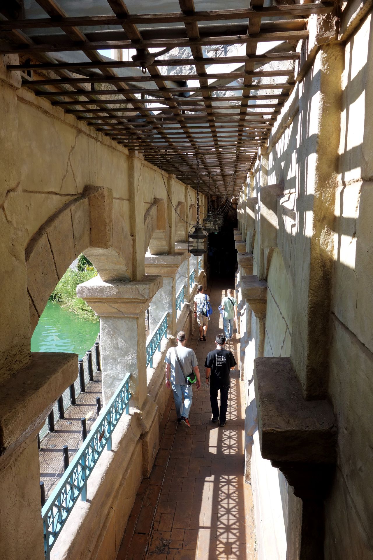 Das lag allerdings vorwiegend daran, dass der eigentliche Wartebereich der Attraktion quasi gar nicht genutzt wurde. Stattdessen führte man die Schlange eben außerhalb durch den Park. Am eigentlichen Eingang wurde man dann Grüppchenweise eingelassen - denn dort erhielten die Inhaber eines Magic Passes ihren bezahlten Vortritt. Ich halte ja bekanntlich nicht viel von solchen Vordrängel-Pässen, aber die Umsetzung hier war doch einfach nur dämlich. Nicht nur, dass man die Besucher ohne Pass benachteiligt, man stellt sich auch noch den halben Park mit wartenden Menschen zu, obwohl da ein völlig ausreichender Wartebereich nahezu komplett brach liegt. So schwer kann es doch nicht sein, den so umzubauen, dass er weiterhin genutzt wird und die Zusammenführung mit den Magic Passlern irgendwo zwischendrin erfolgt.