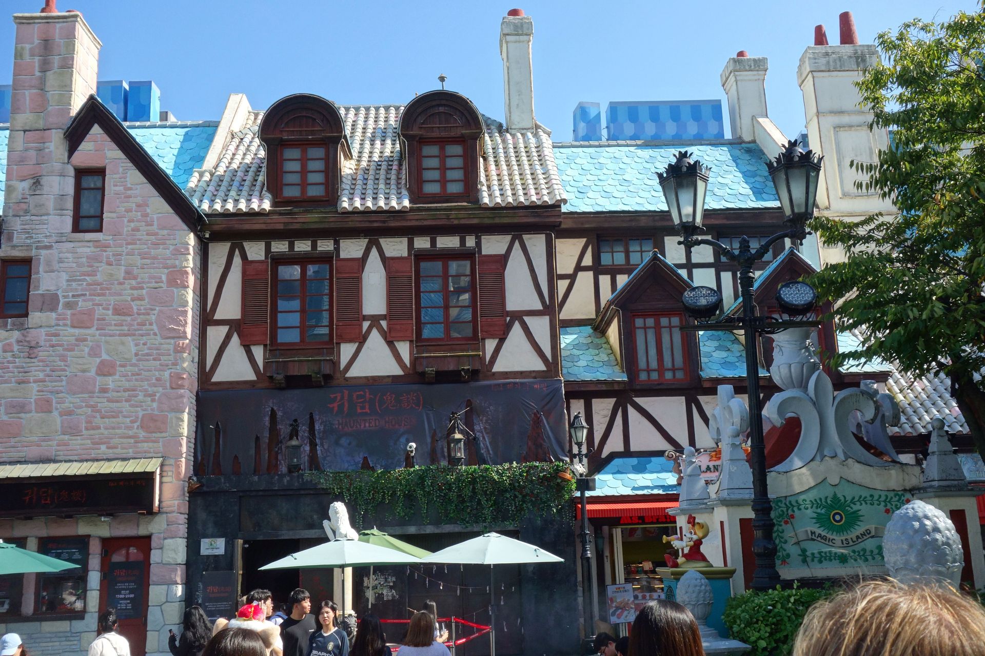 Das aufpreispflichtige Haunted House nutzt das augenscheinlich nicht mehr als solches genutzte Stationsgebäude der Monorail.