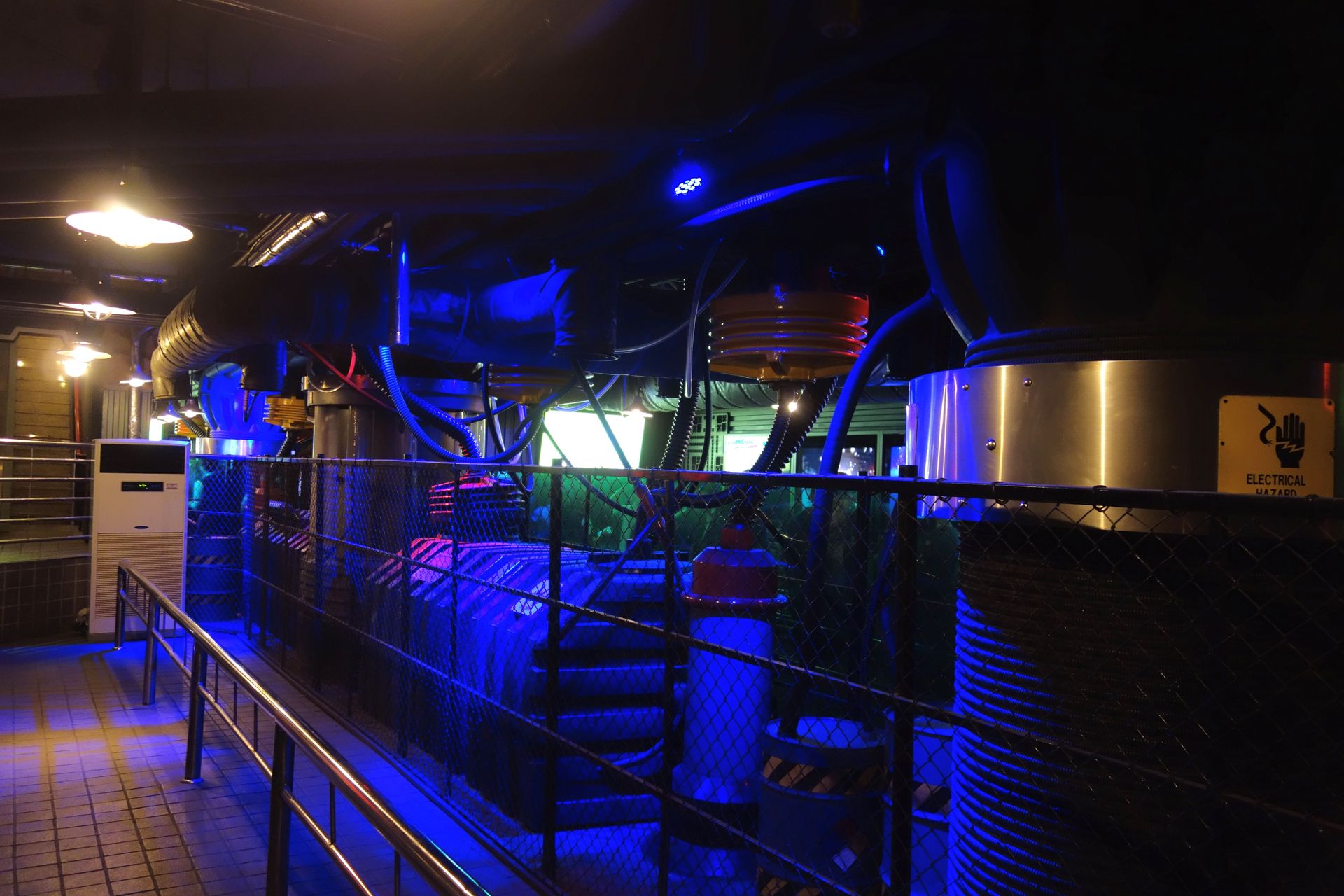 Die Räumlichkeiten hier unten wurden natürlich schon zusammen mit der Insel gebaut, die Achterbahn selbst wurde jedoch erst später eingebaut - oder zumindest erst später eröffnet, nämlich 1995. Und mit einer Streckenlänge von 415 Metern handelt es sich nichtmal um eine sonderlich kleine Anlage, zumal das Layout überraschend weitläufig ist. Lediglich in der Höhe war man natürlich beschränkt, mehr als 10 Höhenmeter werden während der Fahrt nicht überwunden. Daher kommt auch kein Lifthill zum Einsatz, sondern der aus 13 Wagen für je 2 Passagiere (plus Front Car mit dem Kometen) bestehende Zug wird immer wieder von Reibrädern angeschoben, womit sich eine Höchstgeschwindigkeit von 35 km/h ergibt. Der Clou an der Sache: Es handelt sich um einen