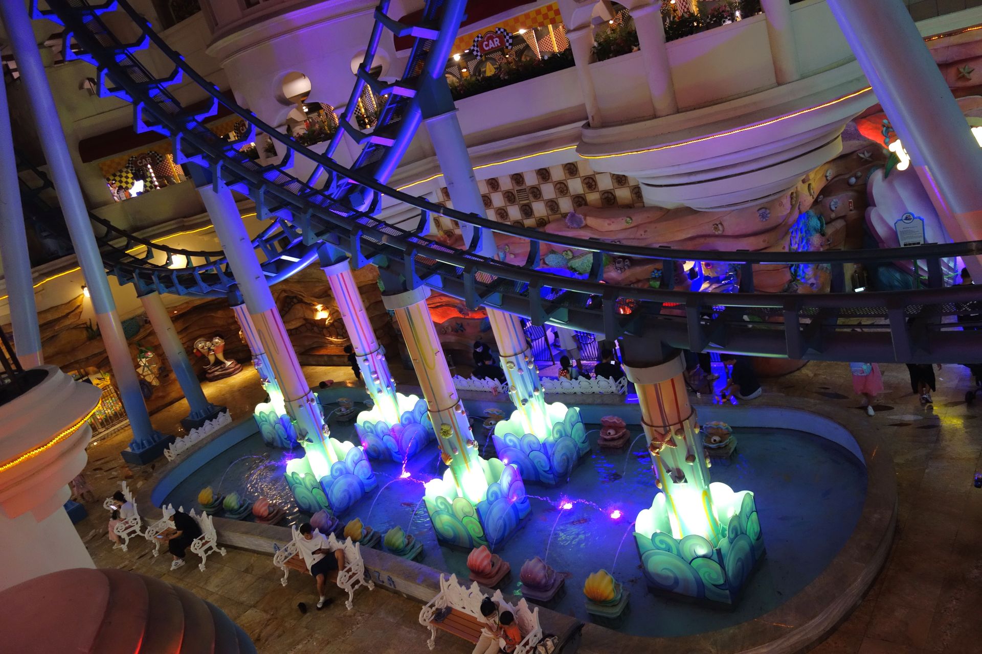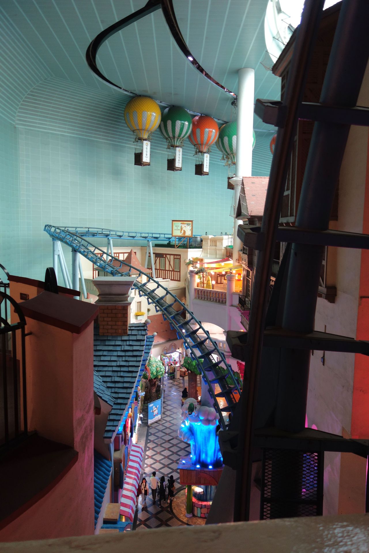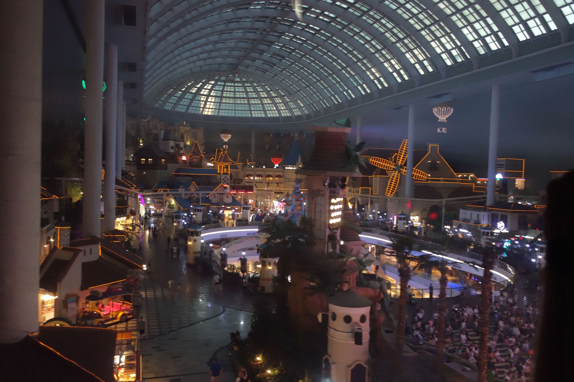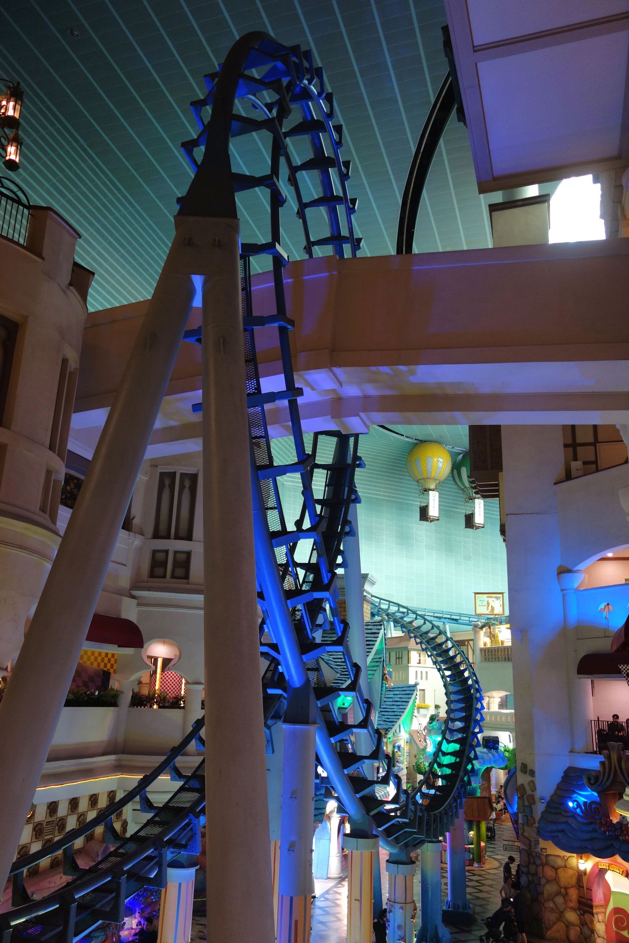 Leider konnte ich jetzt keine Angaben zur Größe des Indoor-Teils finden, die im Netz genannte Fläche von rund 13 Hektar bezieht sich auf die gesamte Lotte World inklusive der Magic Island. Sicher ist aber, dass Lotte World im Jahr 1995 ins Guinness Buch der Rekorde aufgenommen wurde als größter Indoor-Freizeitpark der Welt. Tatsächlich würde ich rein optisch behaupten wollen, dass die IMG Worlds of Adventure in Dubai zwar flächenmäßig größer ist, die Lotte World aber beim Volumen noch immer vorne liegen könnte. Immerhin muss die Halle mindestens 40 Meter hoch sein, wenn da mal der Bungee Drop drin stand.