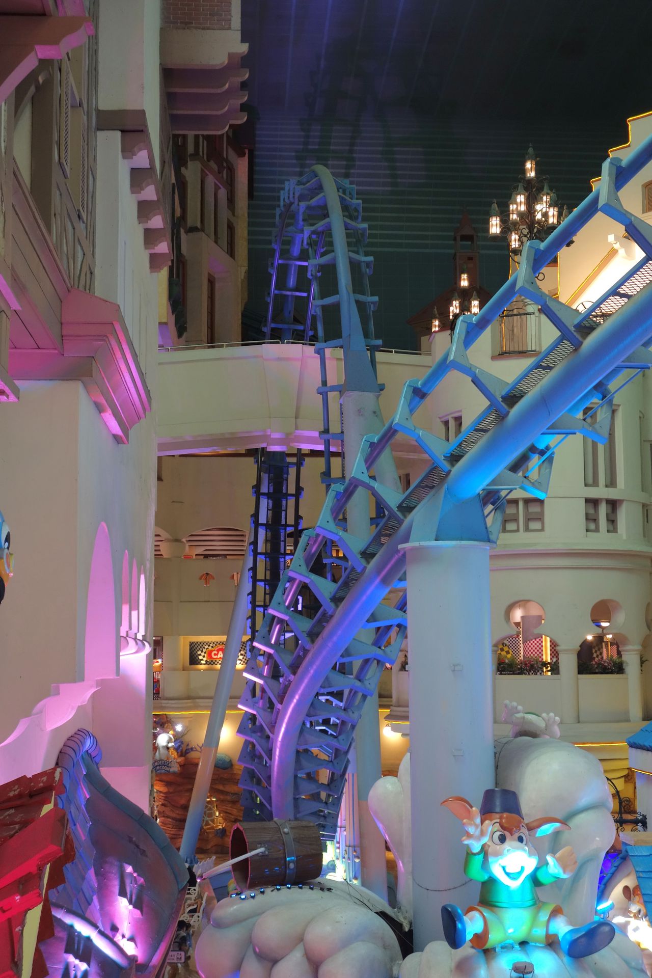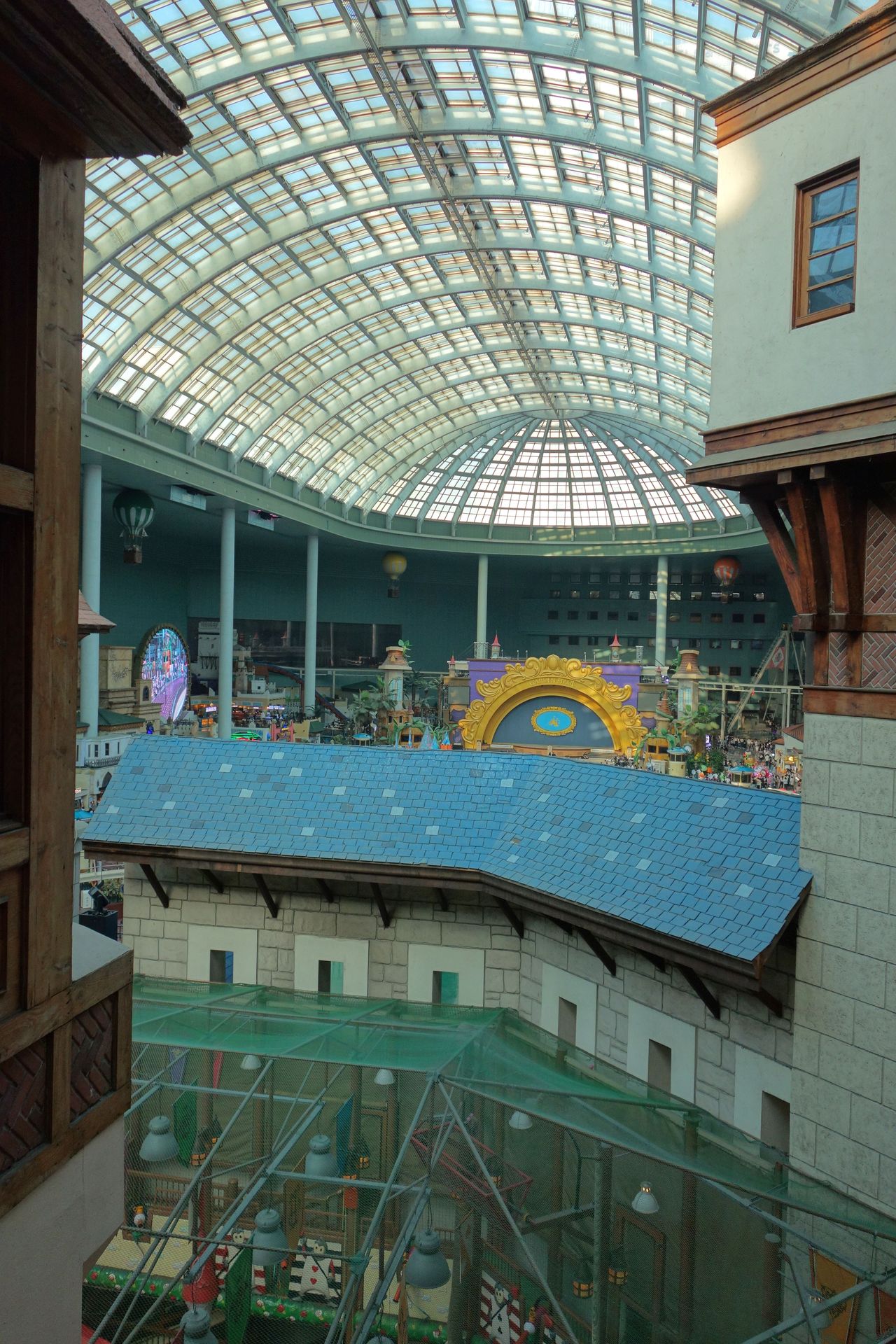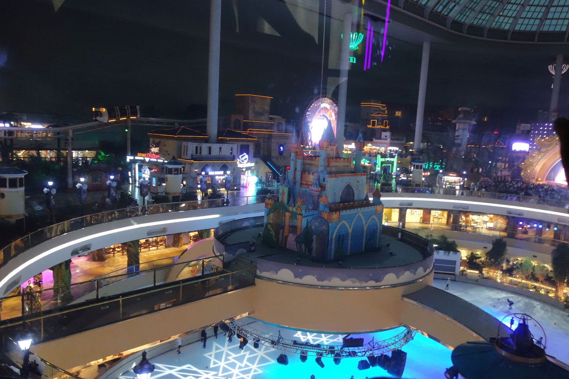 Leider konnte ich jetzt keine Angaben zur Größe des Indoor-Teils finden, die im Netz genannte Fläche von rund 13 Hektar bezieht sich auf die gesamte Lotte World inklusive der Magic Island. Sicher ist aber, dass Lotte World im Jahr 1995 ins Guinness Buch der Rekorde aufgenommen wurde als größter Indoor-Freizeitpark der Welt. Tatsächlich würde ich rein optisch behaupten wollen, dass die IMG Worlds of Adventure in Dubai zwar flächenmäßig größer ist, die Lotte World aber beim Volumen noch immer vorne liegen könnte. Immerhin muss die Halle mindestens 40 Meter hoch sein, wenn da mal der Bungee Drop drin stand.