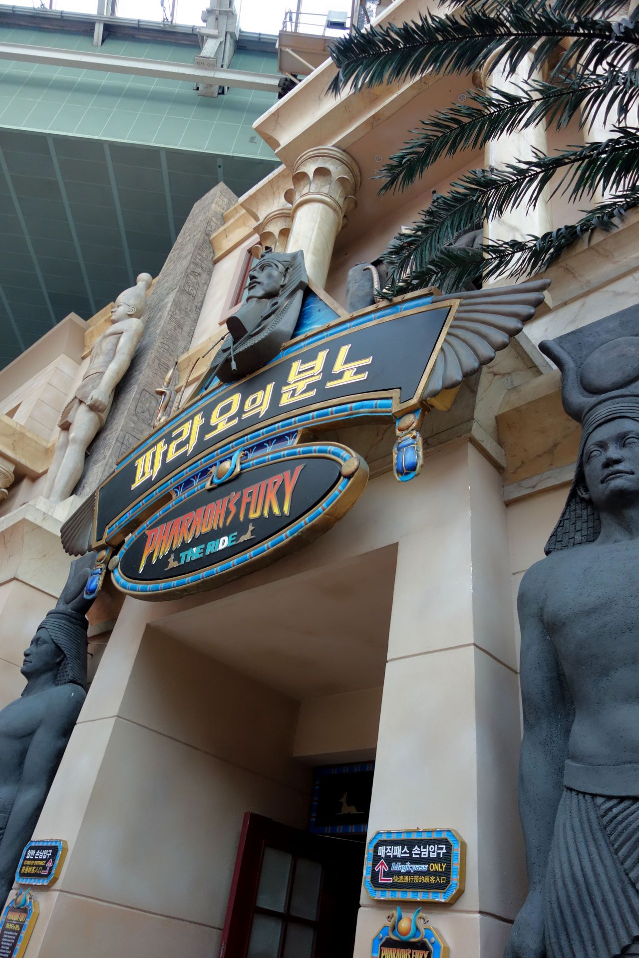 Helix der Achterbahn versteckt, stellte damals entsprechend den Vesuv dar. Leider wurde die einstige Länderaufteilung der Lotte World über die Jahre ziemlich verwässert. Die Halle war einst aufgeteilt in die vier Bereiche England & German Street, French & Netherlands Street, Arabian & Morocco Street, sowie Spain & Italian Street. Der Außenbereich war aufgeteilt in Korean Street, British Street, French Street, Swiss Street und German Street. Italien wurde demnach also vom wütenden Pharao verdrängt, der uns mit einer prognostizierten Wartezeit von 60 Minuten empfing. Und die über den Ausgang geführte Single Rider Line funktionierte leider auch nicht so gut, wie bei French Revolution. Um genau zu sein, bewegte sich die Single Rider Line 20 Minuten lang nur, weil einige vor uns Wartende in die normale Queue wechselten. Eine Gruppe davon saß dann am Ende im Wagen vor mir, die normale Schlange war also offensichtlich wirklich schneller. Offenbar fanden die Ride-Ops dort immer die passenden Gruppen, um den Wagen ohne Single Rider füllen zu können.