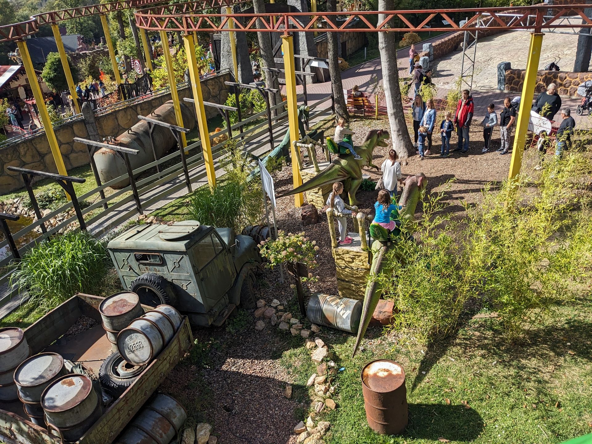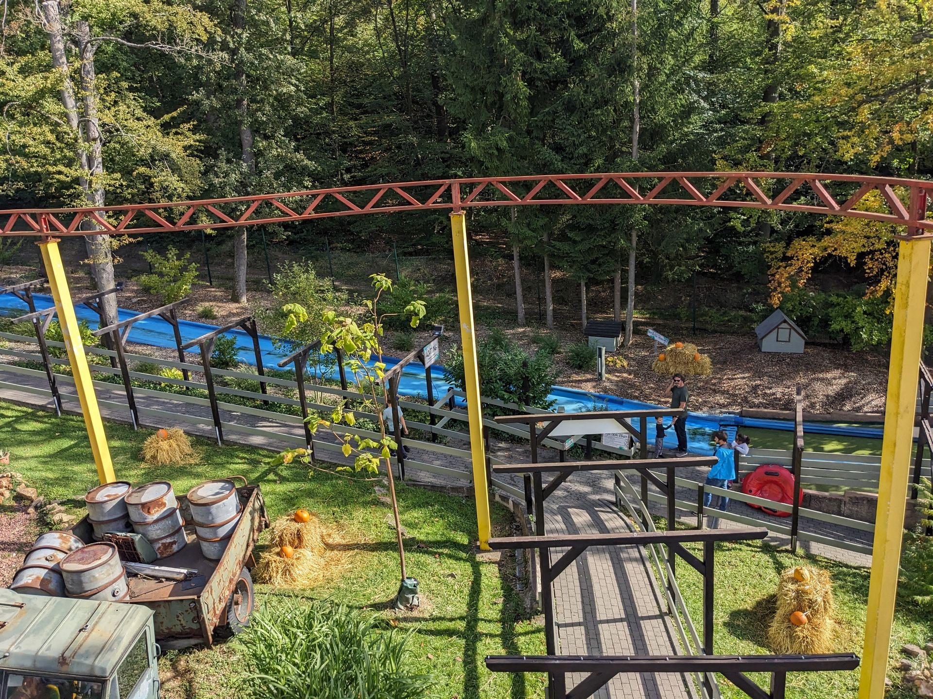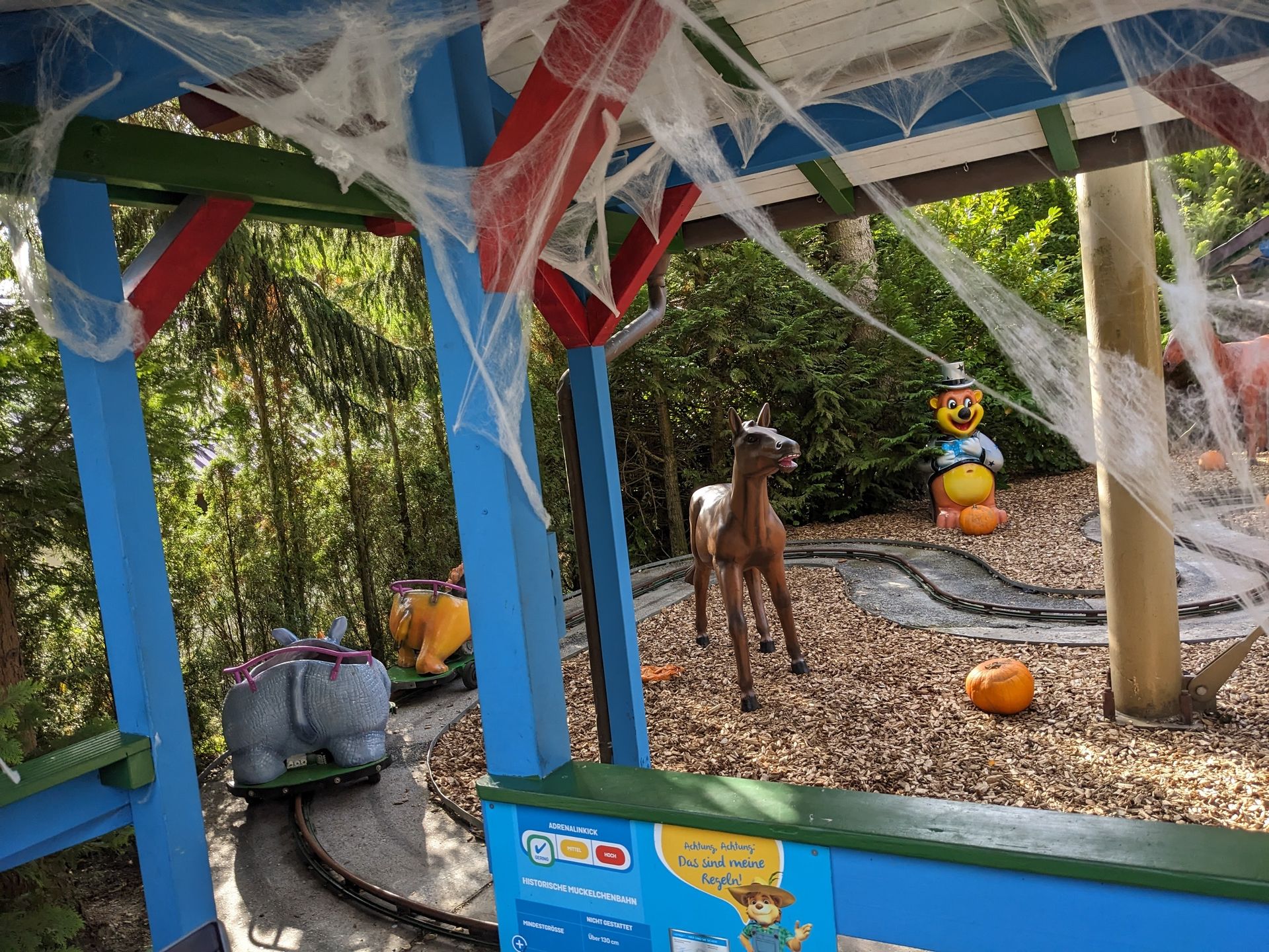 Die Muckelchenbahn unter der Wildwasserbahn hat inzwischen die beste Zeit hinter sich. Die meisten Fahrzeuge stehen nur noch als Deko rum, die letzten fast funktionstüchtigen Fahrzeuge bleiben an kaputten Schienenteilen hängen...