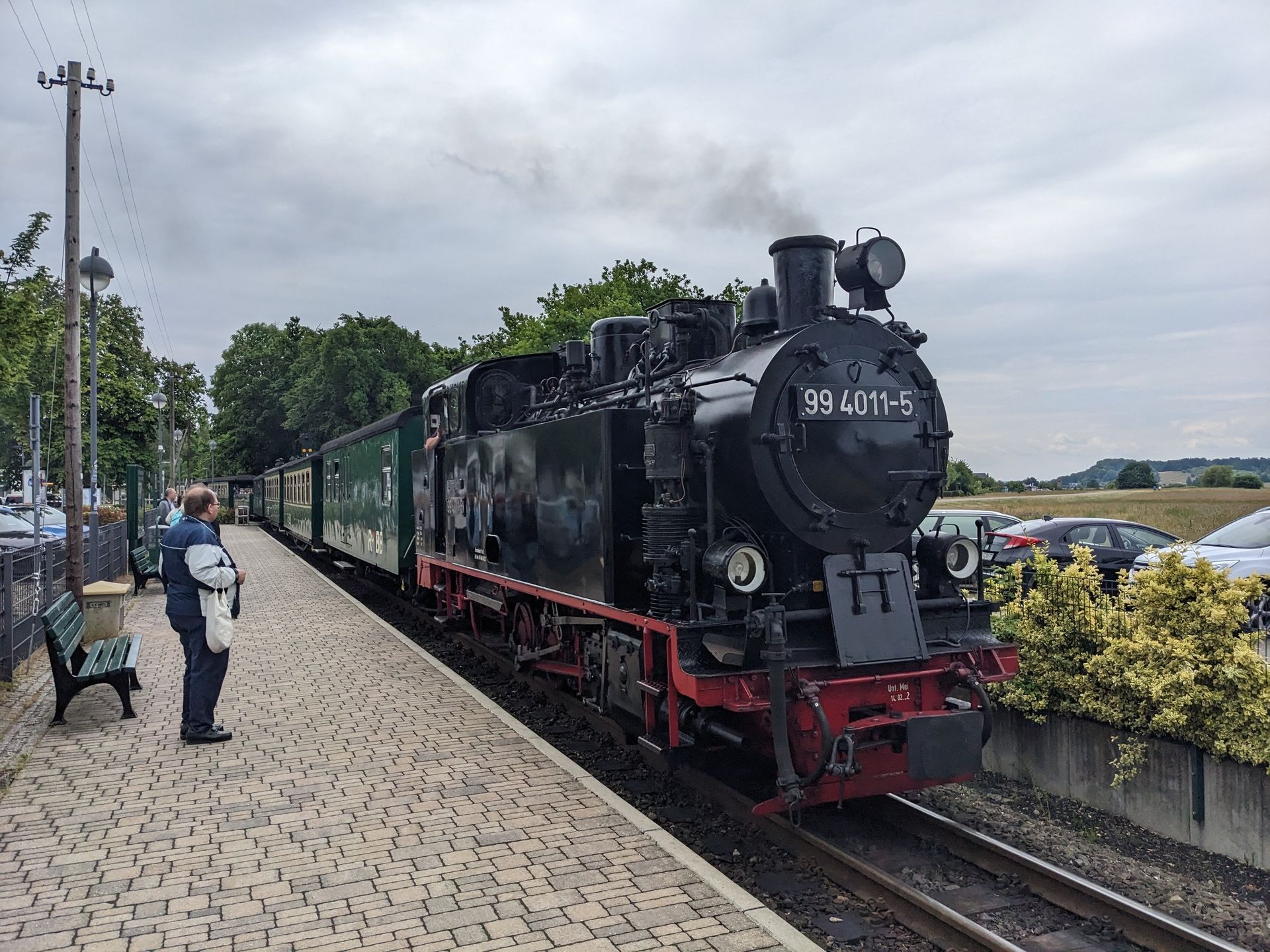 Bis Putbus fährt der Zug mit der Dampflock an der Spitze. Dort muss dann bereist umgesetzt werden und an die Spitze kommt eine zusätzliche Diesellok. Denn letzten Meter der Stichstrecke nach Lauterbach haben keine Umsetzgleise. Dafür fährt der Zug bis auf die Mole zwischen Gemeindehafen und Yachthafen, also quasi direkt vor unser Zelt