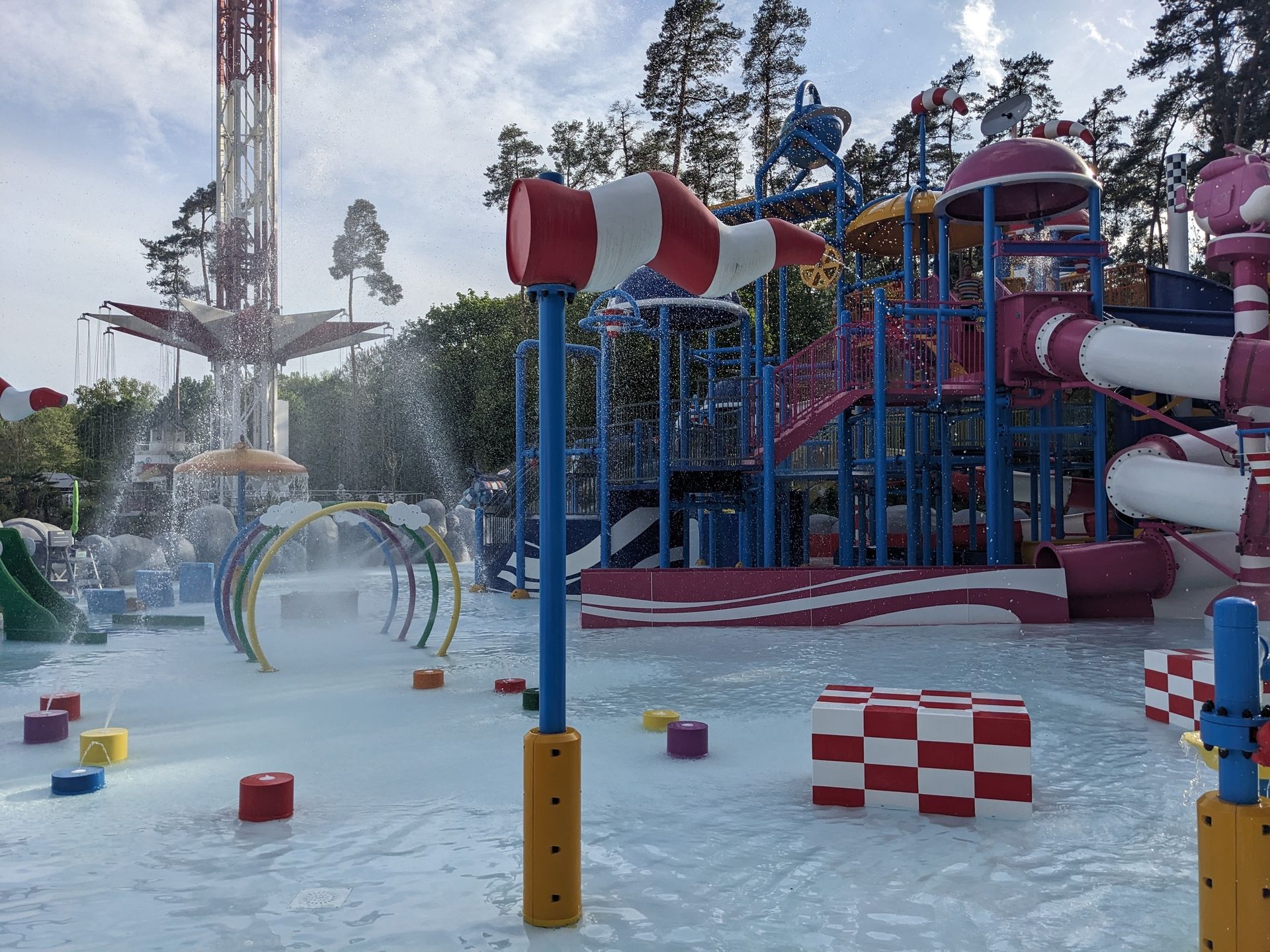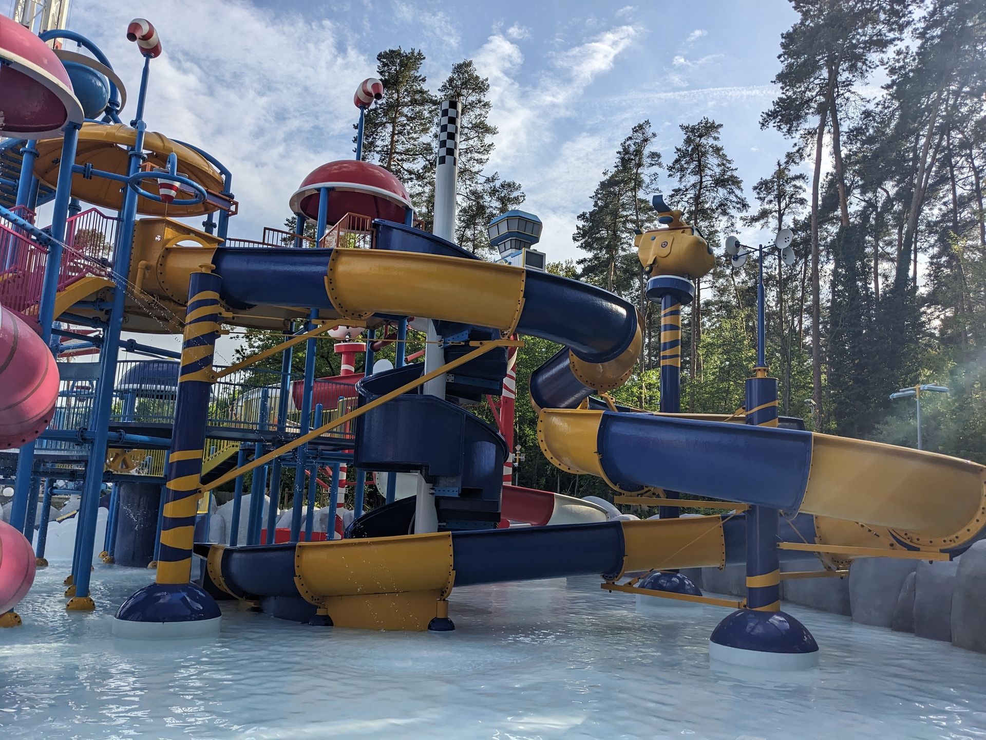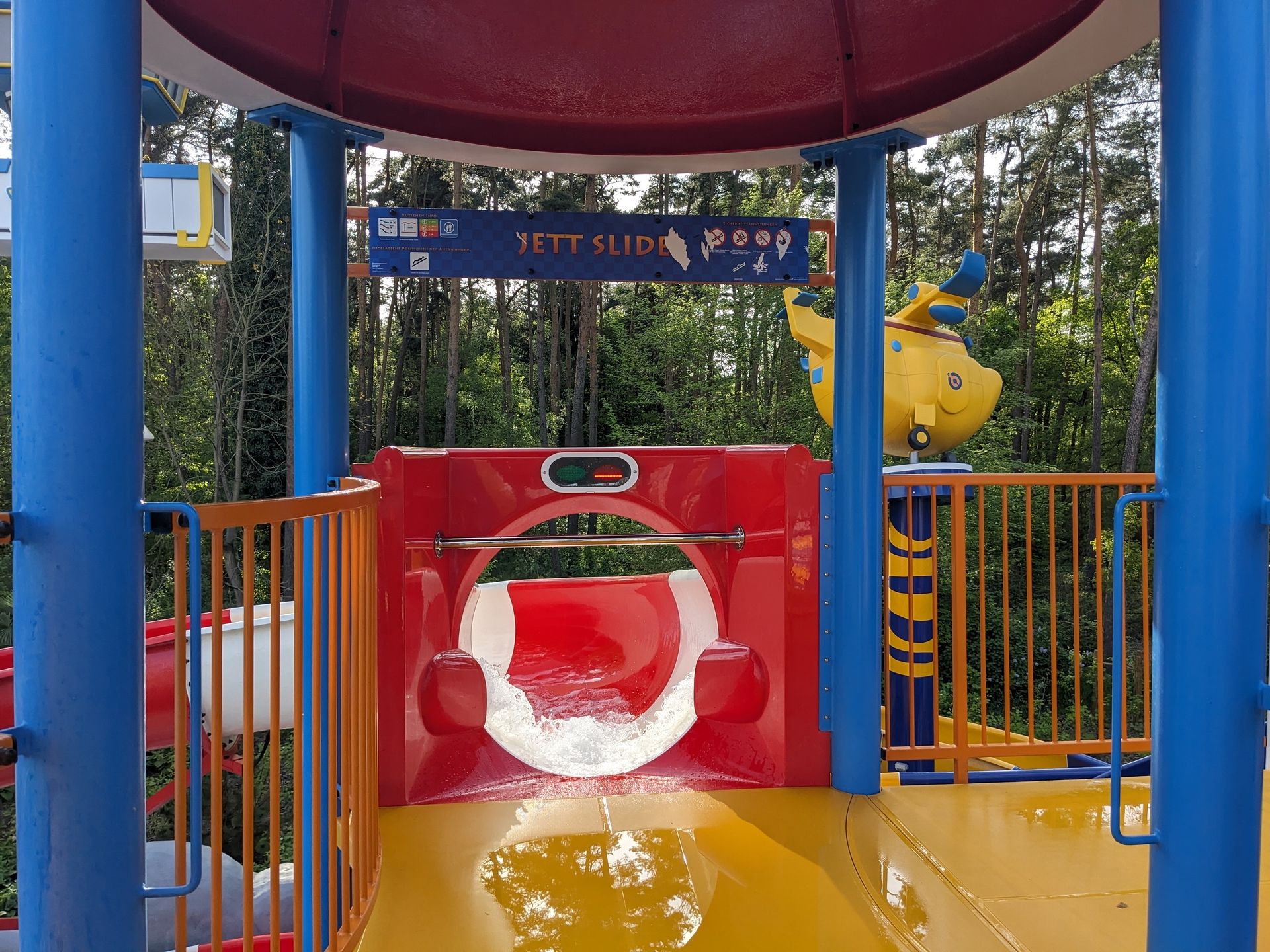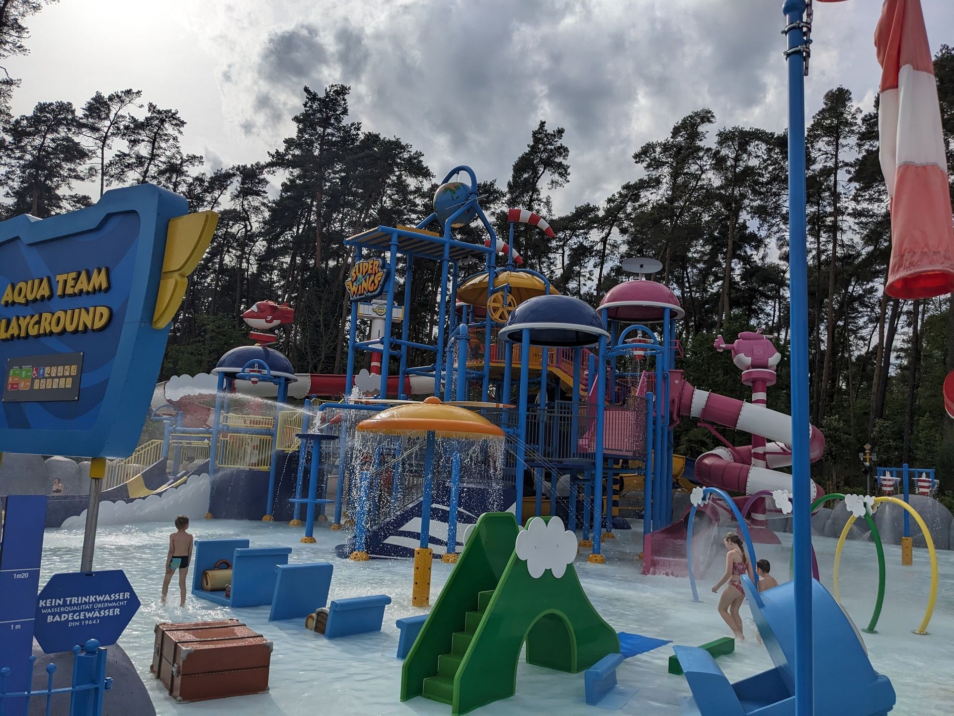 Doch uns zieht eher die letztjährige Neuheit hier her, die eben schon im Hintergrund zu sehen war: Der Wasserspielplatz Super Wings mit durchaus 3 ausgewachsenen Rutschen: